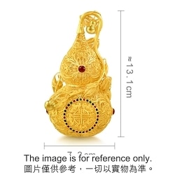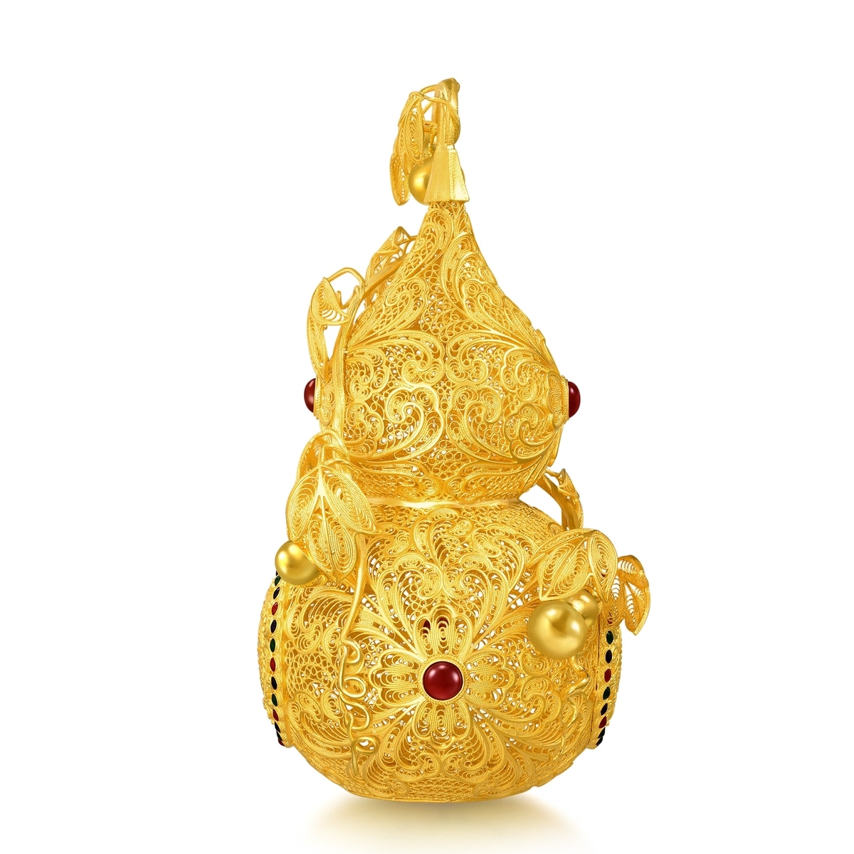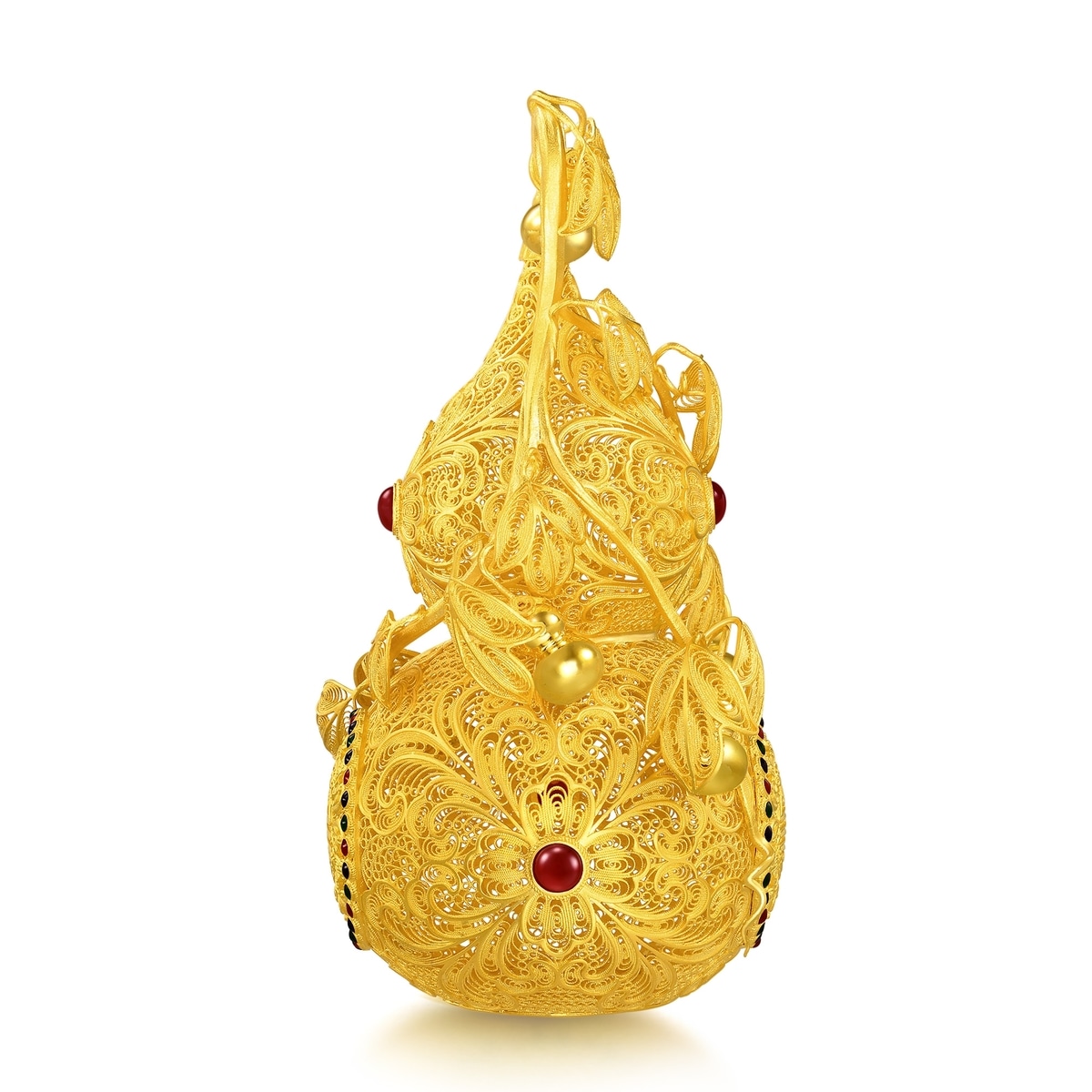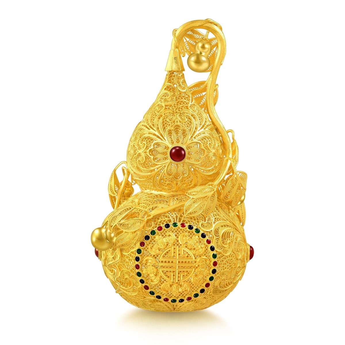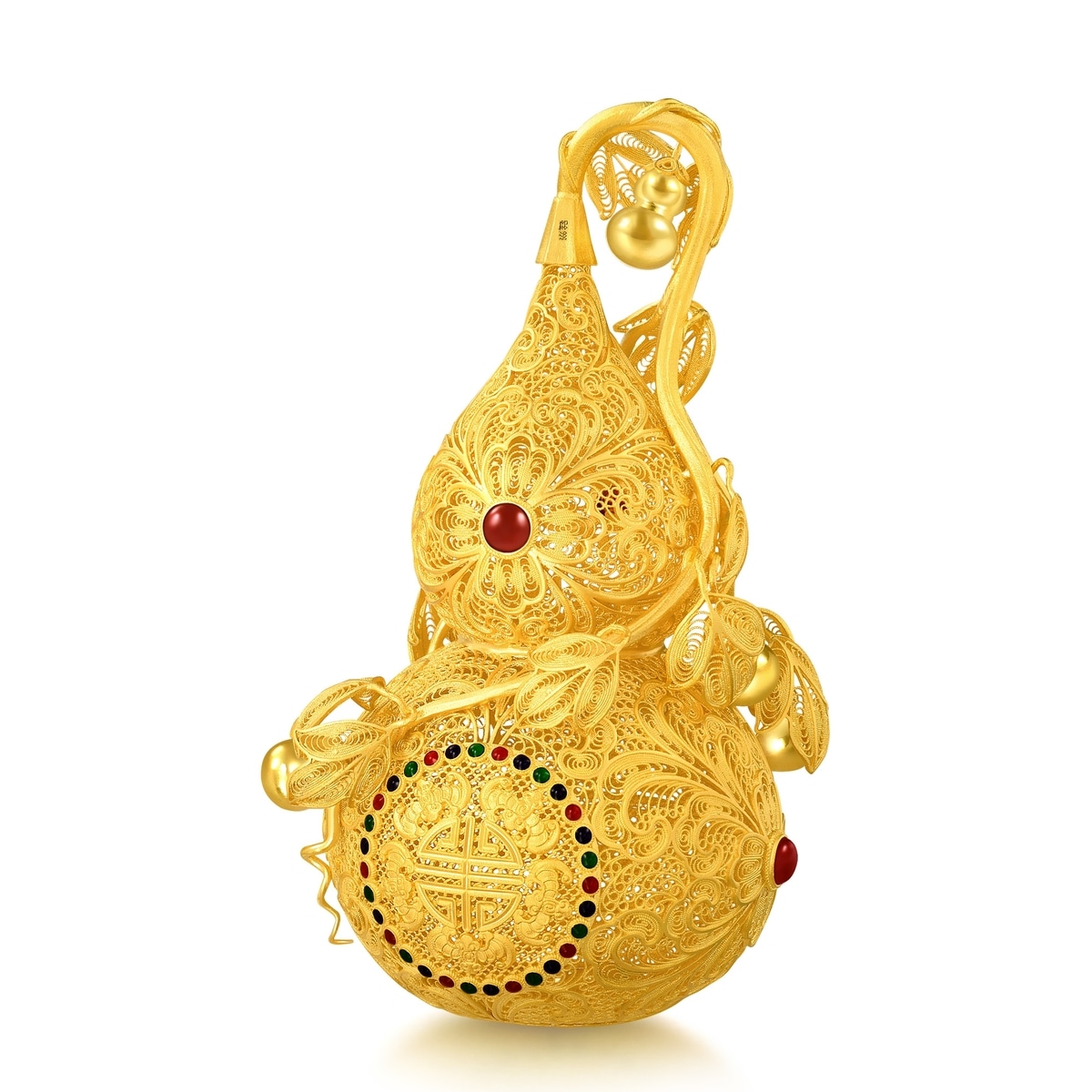 周生生足金「福祿雙至」擺件,以金葫蘆為設計元素,採用上乘古法花絲工藝,造型精緻玲瓏,特別糅合琺瑯塗層及紅玉髓,對比鮮明奪目。葫蘆表面綴有「五蝠」吉祥圖騰,掛滿小葫蘆的蔓藤延展不絕,滿載「福祿雙全、代代相傳」的美好寓意。