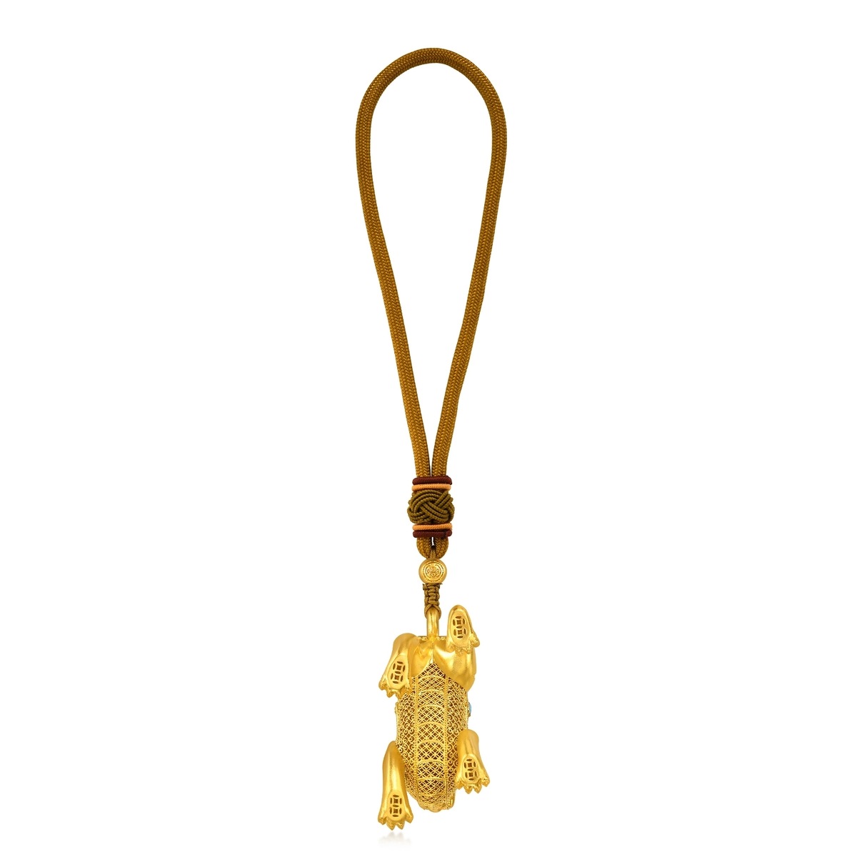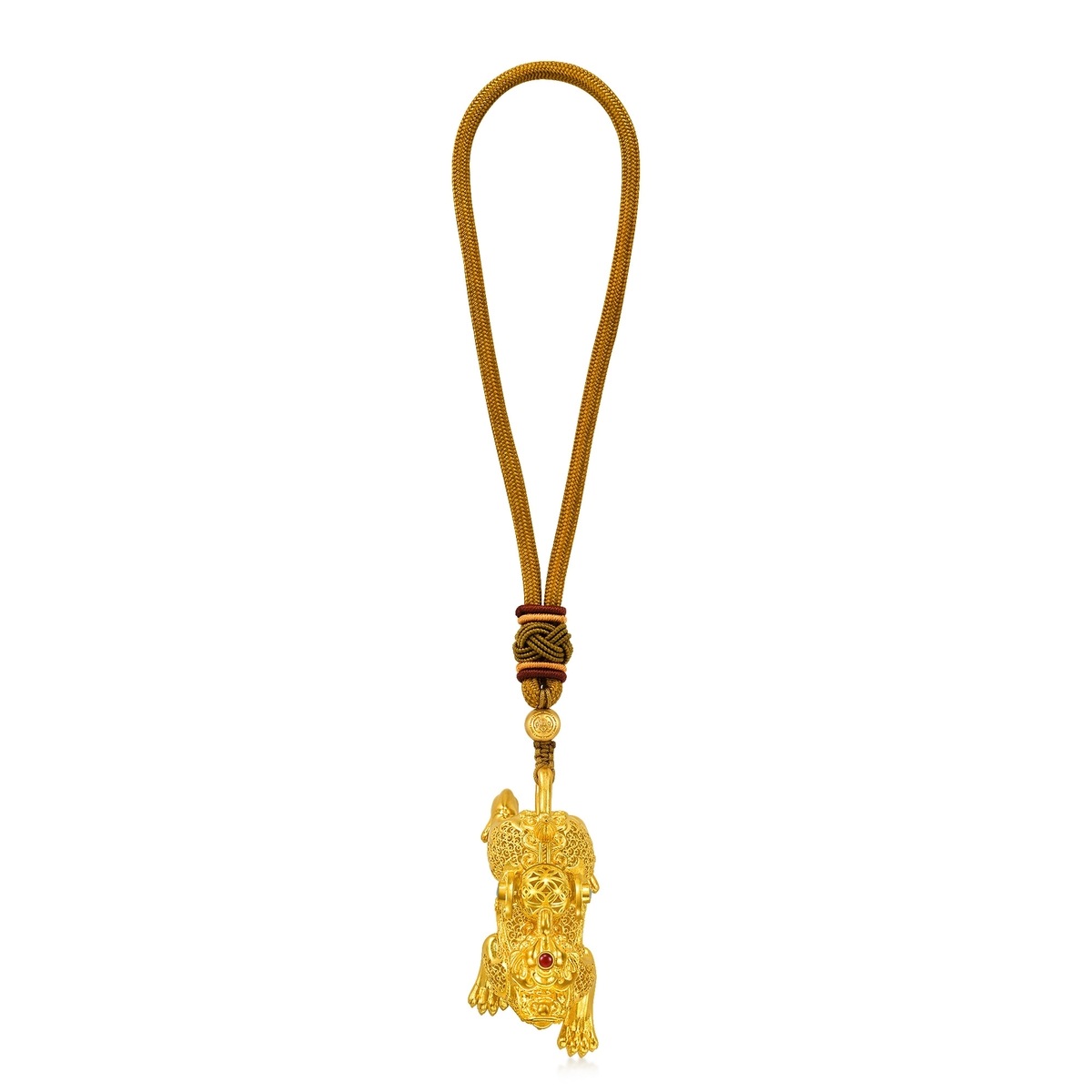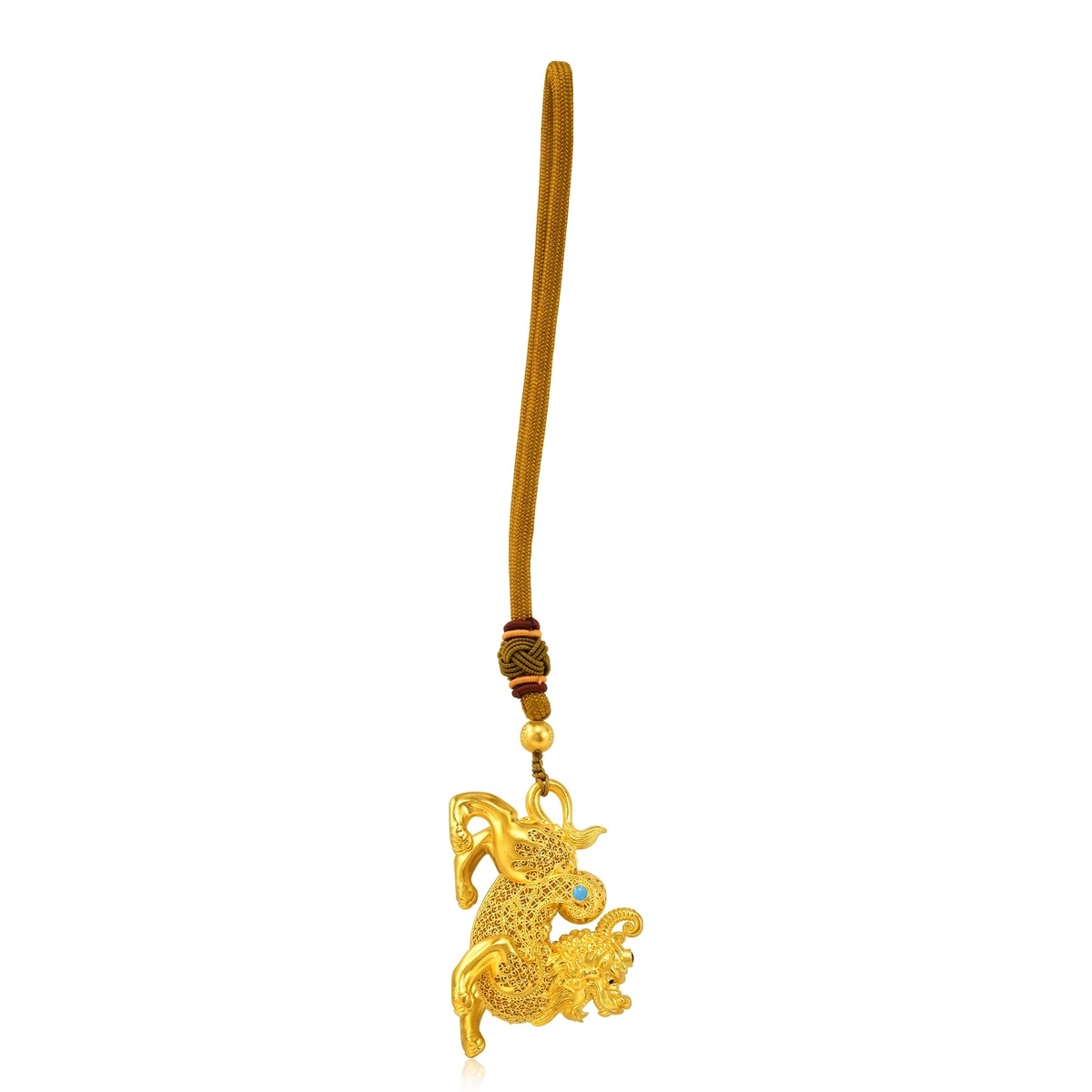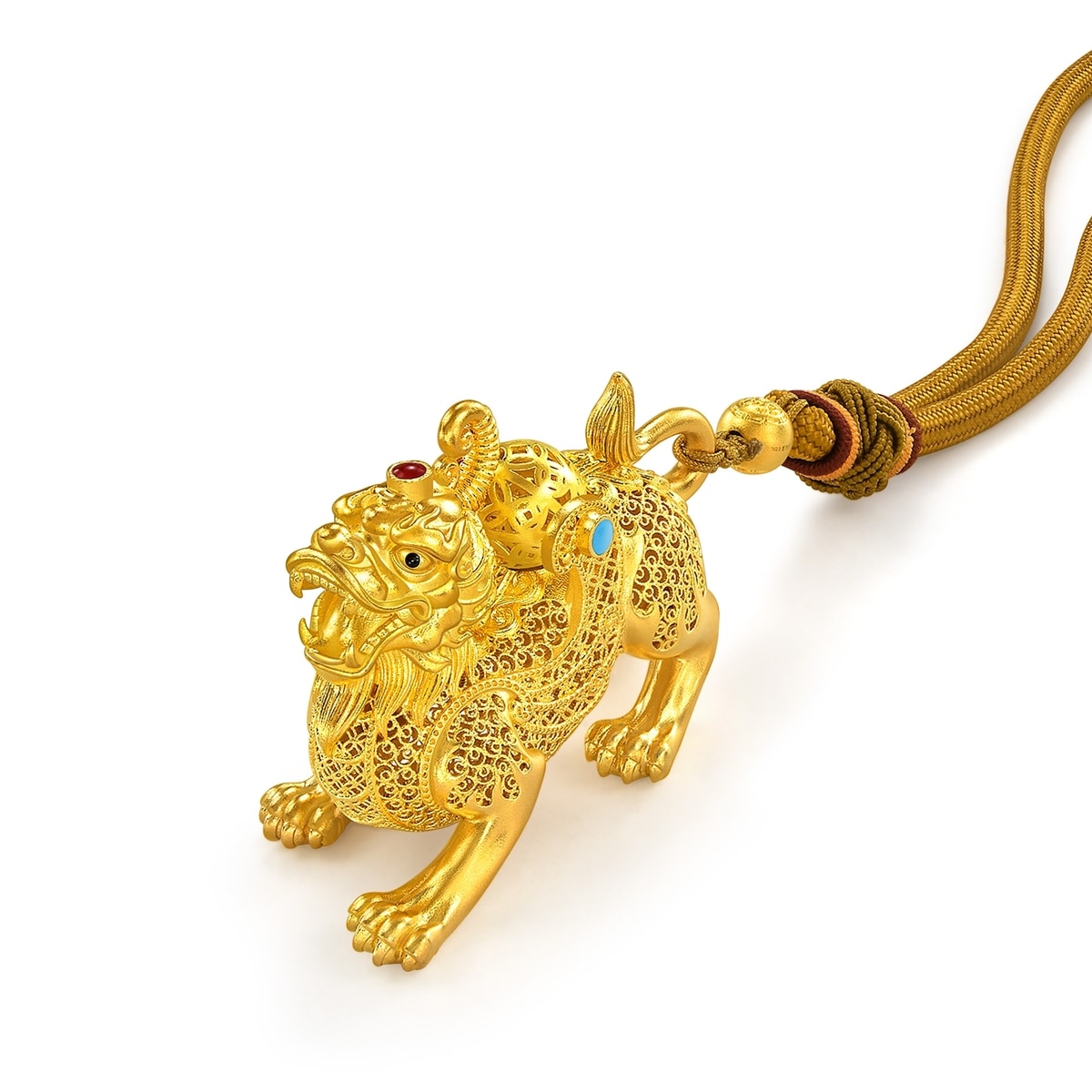 周生生足金麒麟手把件採用古祖黃金工藝,造型精緻,觸感細膩,背部的金球可以轉動,適合握於手中把玩,細味賞鑒。麒麟被視為祥瑞之獸,形象雄壯威武,身體採用花絲鏤空設計,背駝轉運金球,巧以紅藍琺瑯作點綴,寓意轉運納財、守護平安,祈願帶來好運與幸福。