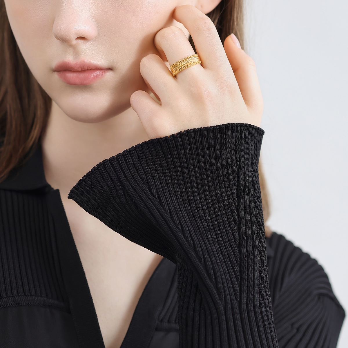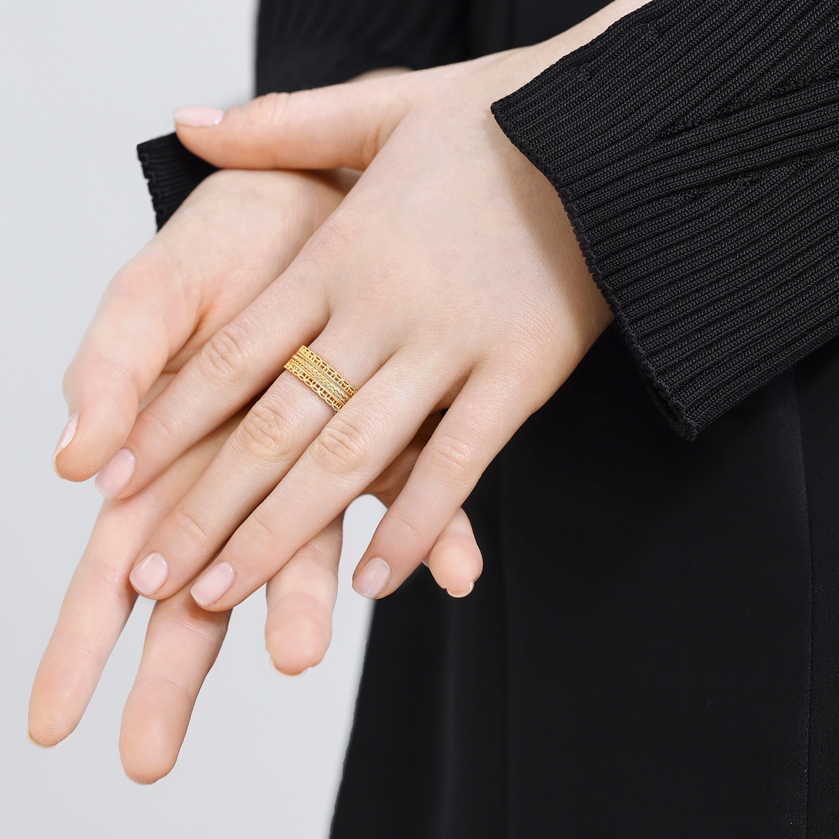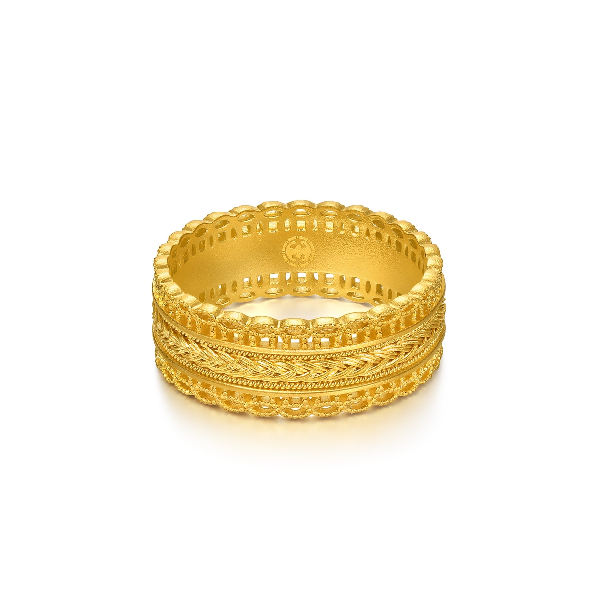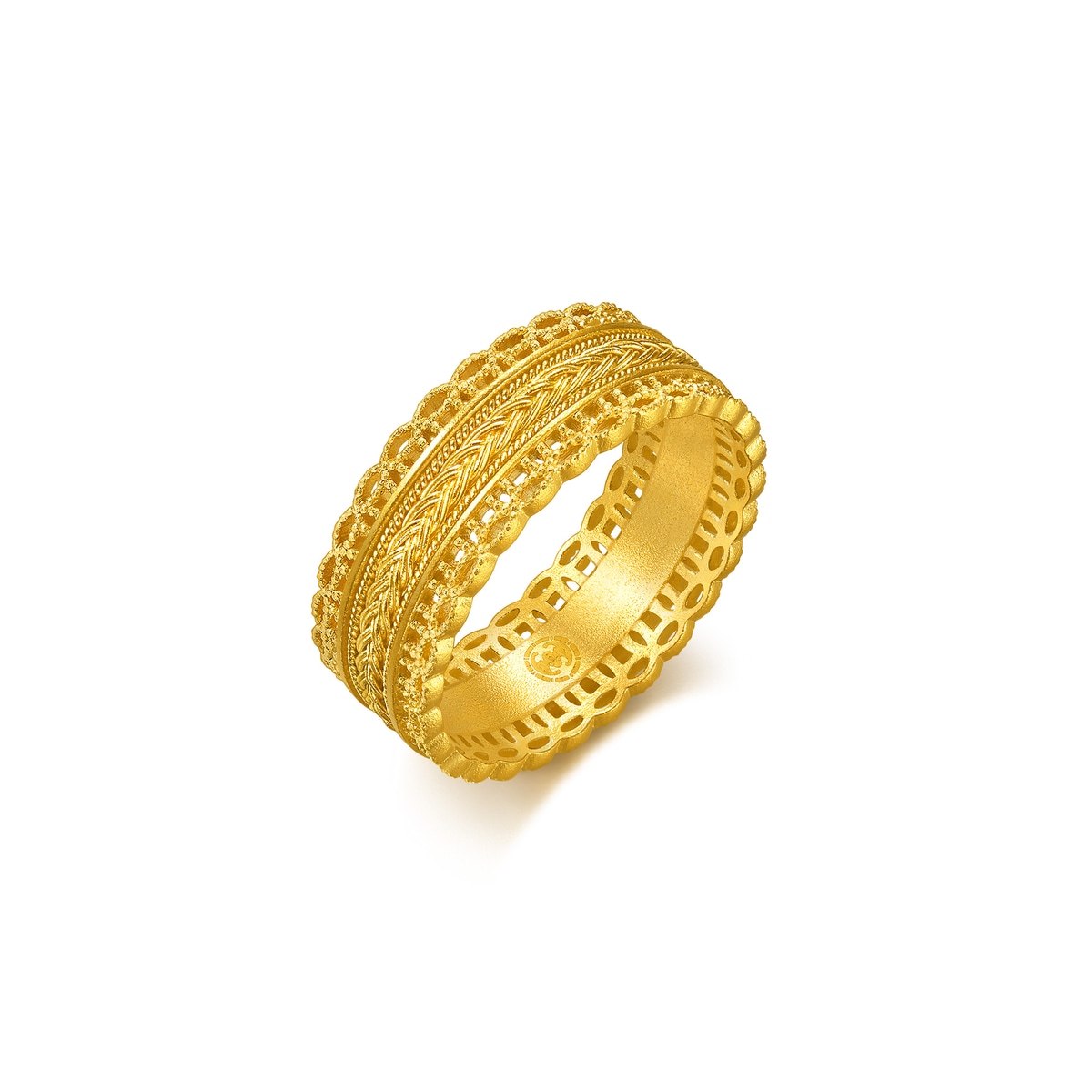 周生生足金戒指採用古祖黃金工藝,以宮廷御用的花絲編織技術營造玲瓏精緻的鏤空效果,別具東方古典韻味,兩種優美飾紋相互纏繞,蘊藏「腰纏萬貫」的深遠寓意,象徵帶來豐碩財富,傳達美滿祝福。