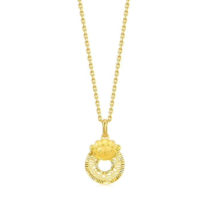 周生生足金吊墜以卡通生肖為造型,採用卓越黃金工藝,提升黃金硬度,刻劃精緻立體的金羊造型,吊墜結合通花水波飾紋,寓意吉祥如意,更象徵光明、智慧及永恆,為佩戴者帶來美好祝福。
