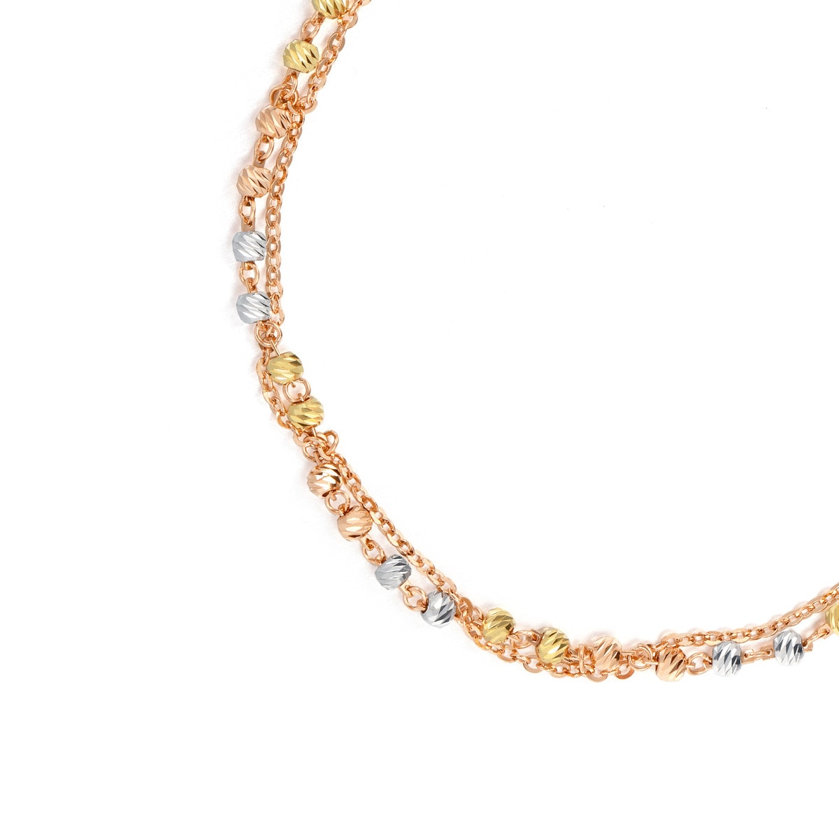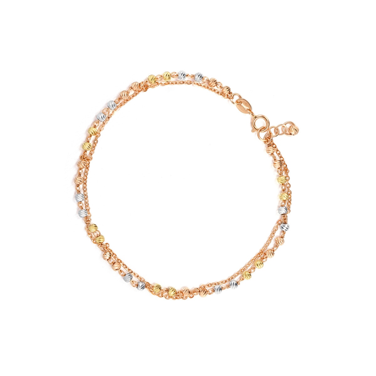 手鍊糅合18K黃色、白色及紅色黃金小珠,色調亮麗,浪漫多彩。
