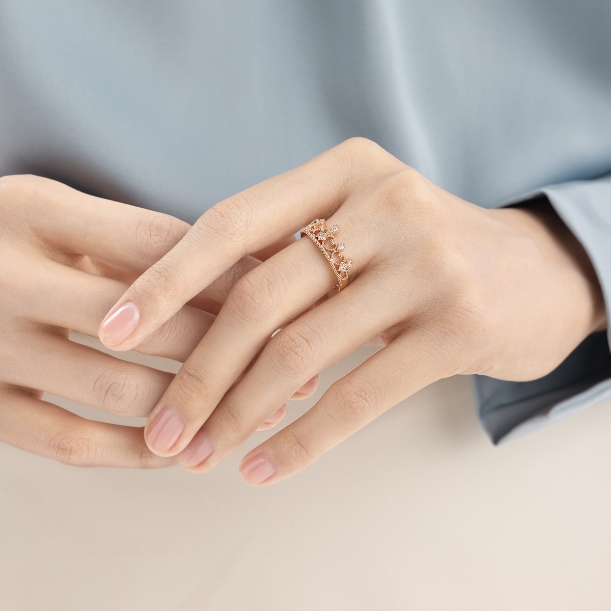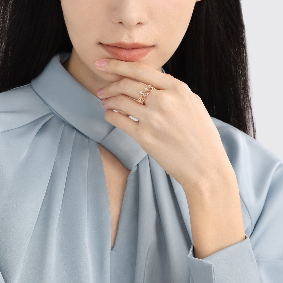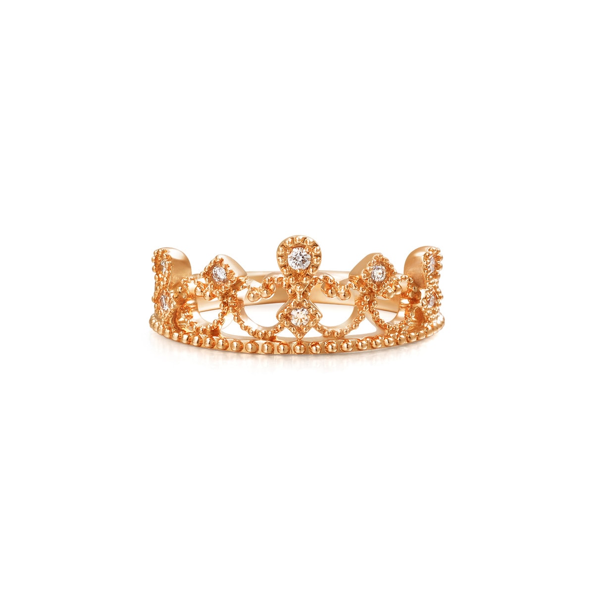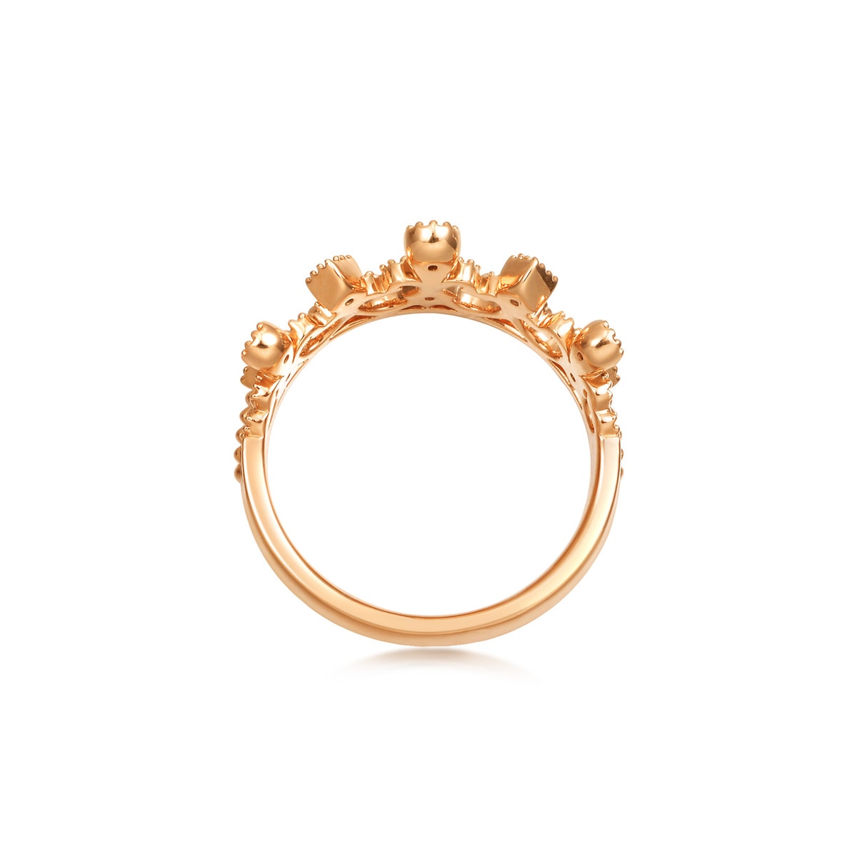 周生生以 18K 玫瑰金打造皇冠造型,表面鋪滿小圓珠,手工精緻。應用了 Mill Setting 鑲嵌工藝,令皇冠上的圓鑽更閃爍耀眼。