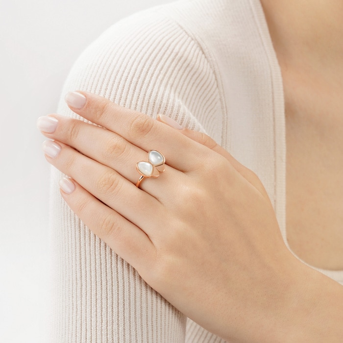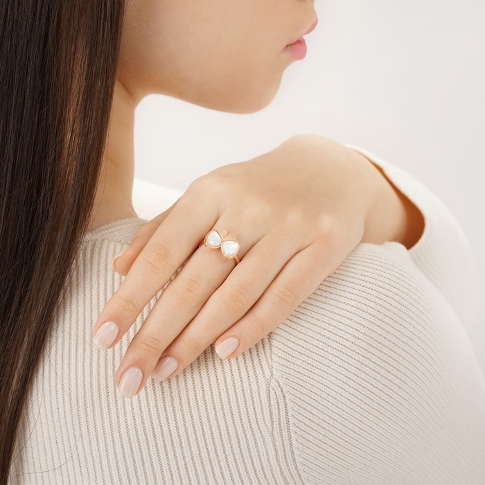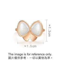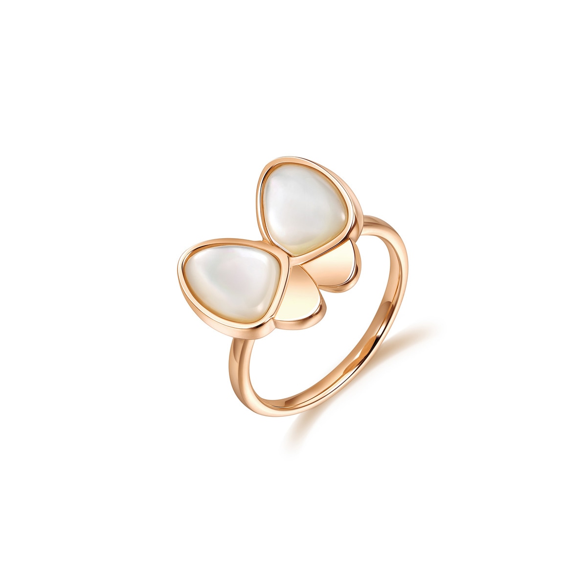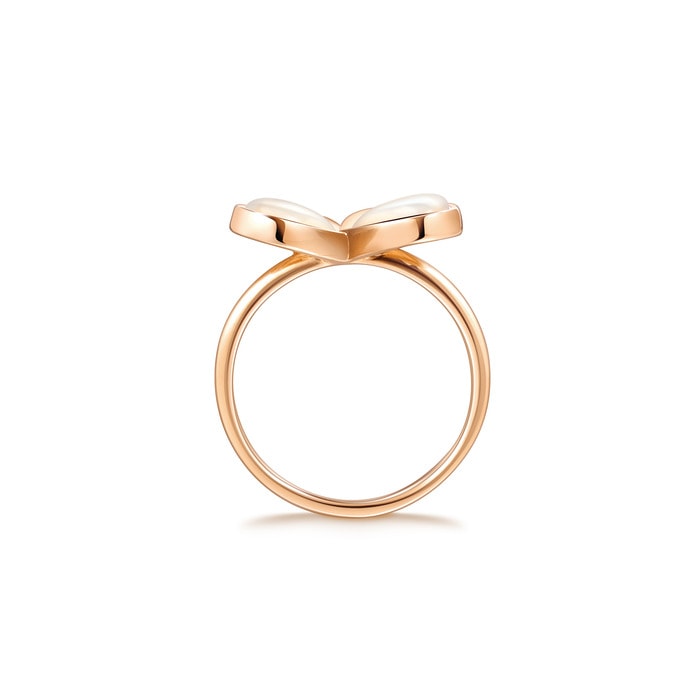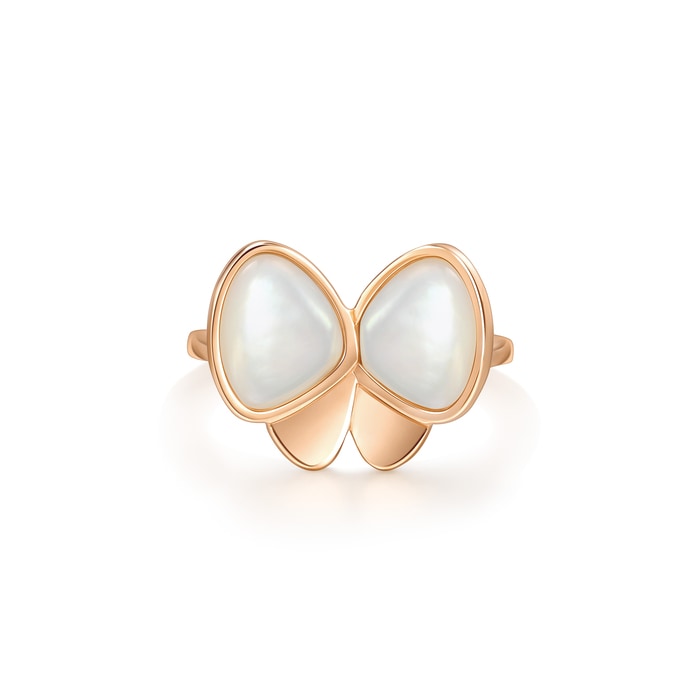 周生生18K紅色黃金蝴蝶戒指,整體外形以簡約線條勾勒,蝴蝶翅膀上半部以人手打磨的珍珠貝母點綴,散發天然幻彩光澤,栩栩如生,就似在自由自在地拍翼飛舞。