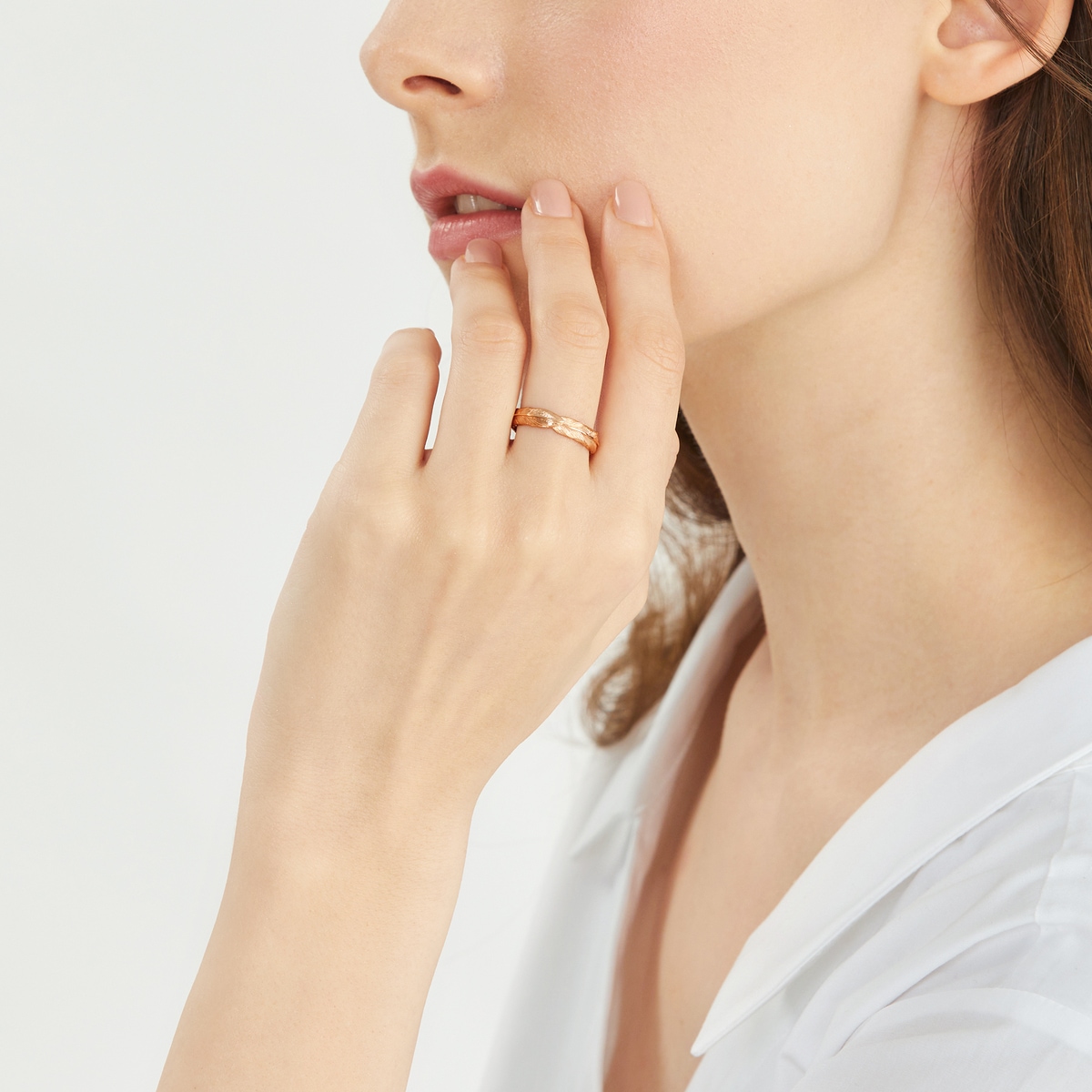周生生18K紅金打造的戒指,造型參考了羅馬神話的邱比特之羽毛,羽毛紋理深刻細膩,栩栩如生,在指間搖曳飄逸,象徵愛情與保護,彷彿在見證著您跟他的每一個浪漫時刻。