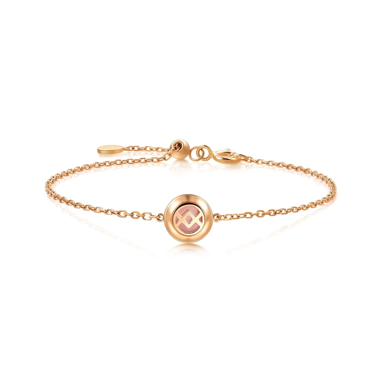 周生生18K玫瑰金圓形手鍊,獨特的雙面設計可隨心情自由轉換。一邊鑲以珍珠貝母,柔和自然;另一邊為縷空設計,低調中見心思。