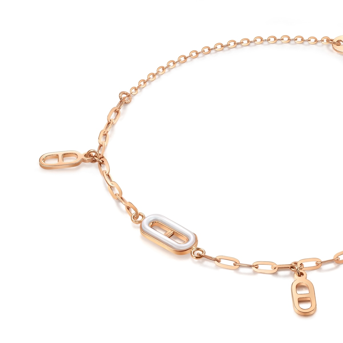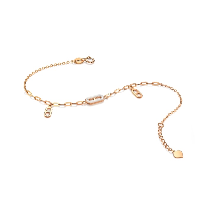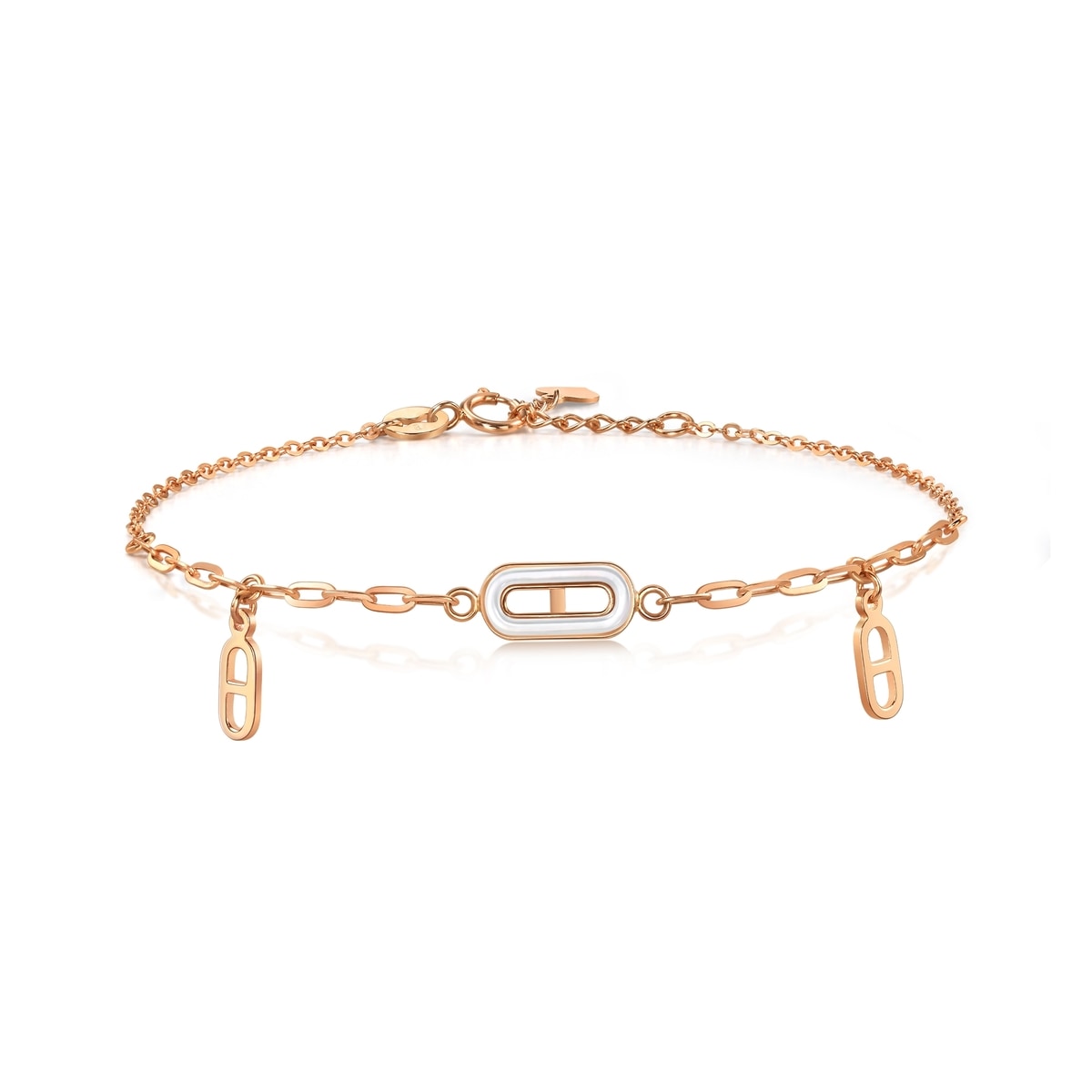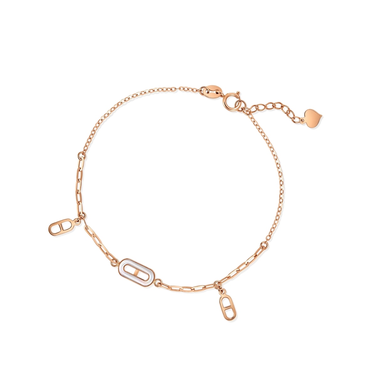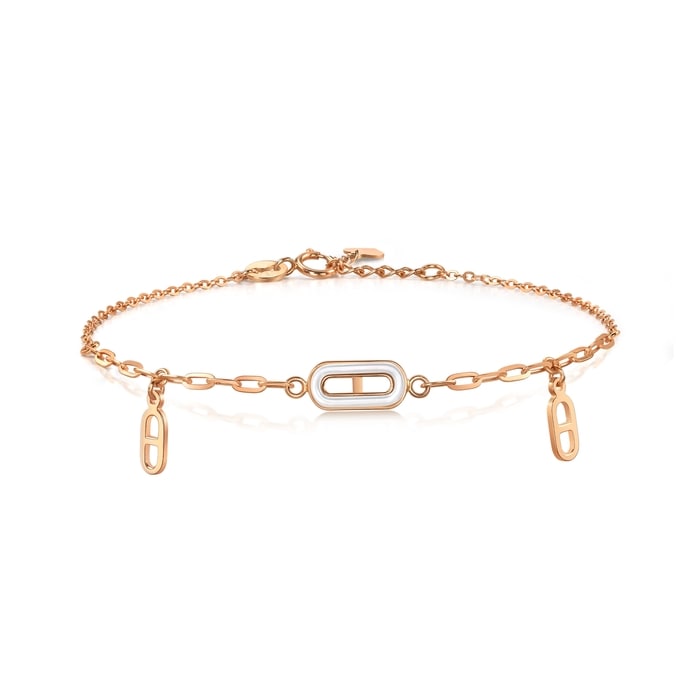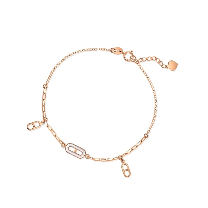 周生生18K紅色黃金手鍊,長環形造型以白貝母點綴,散發天然幻彩光澤,簡約時尚。