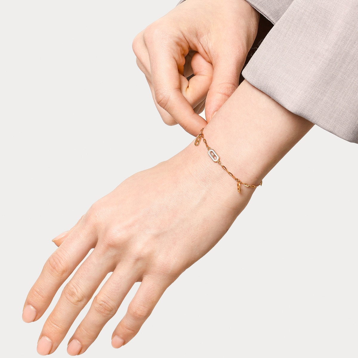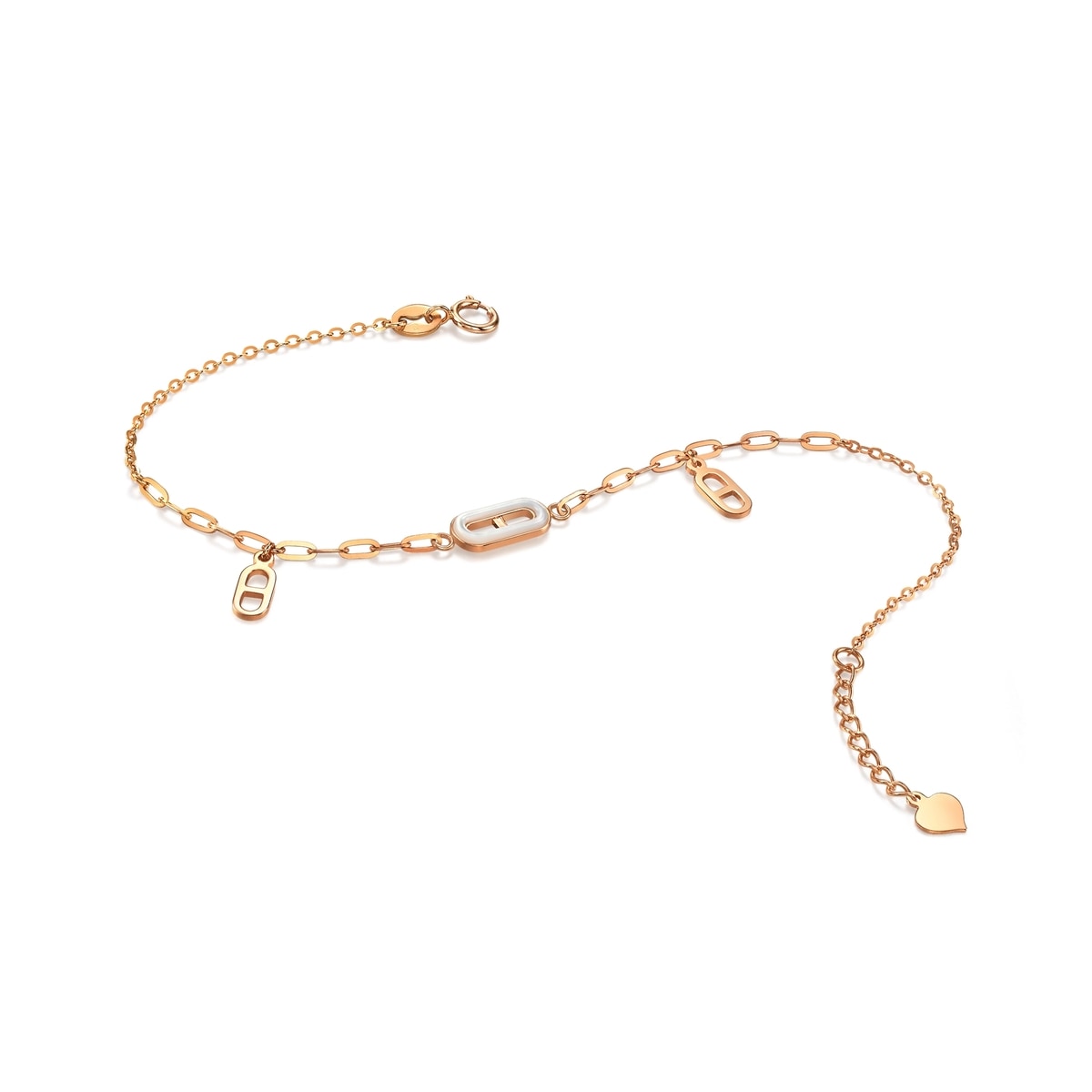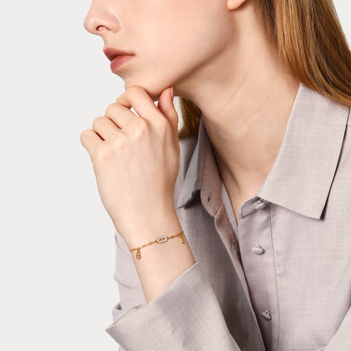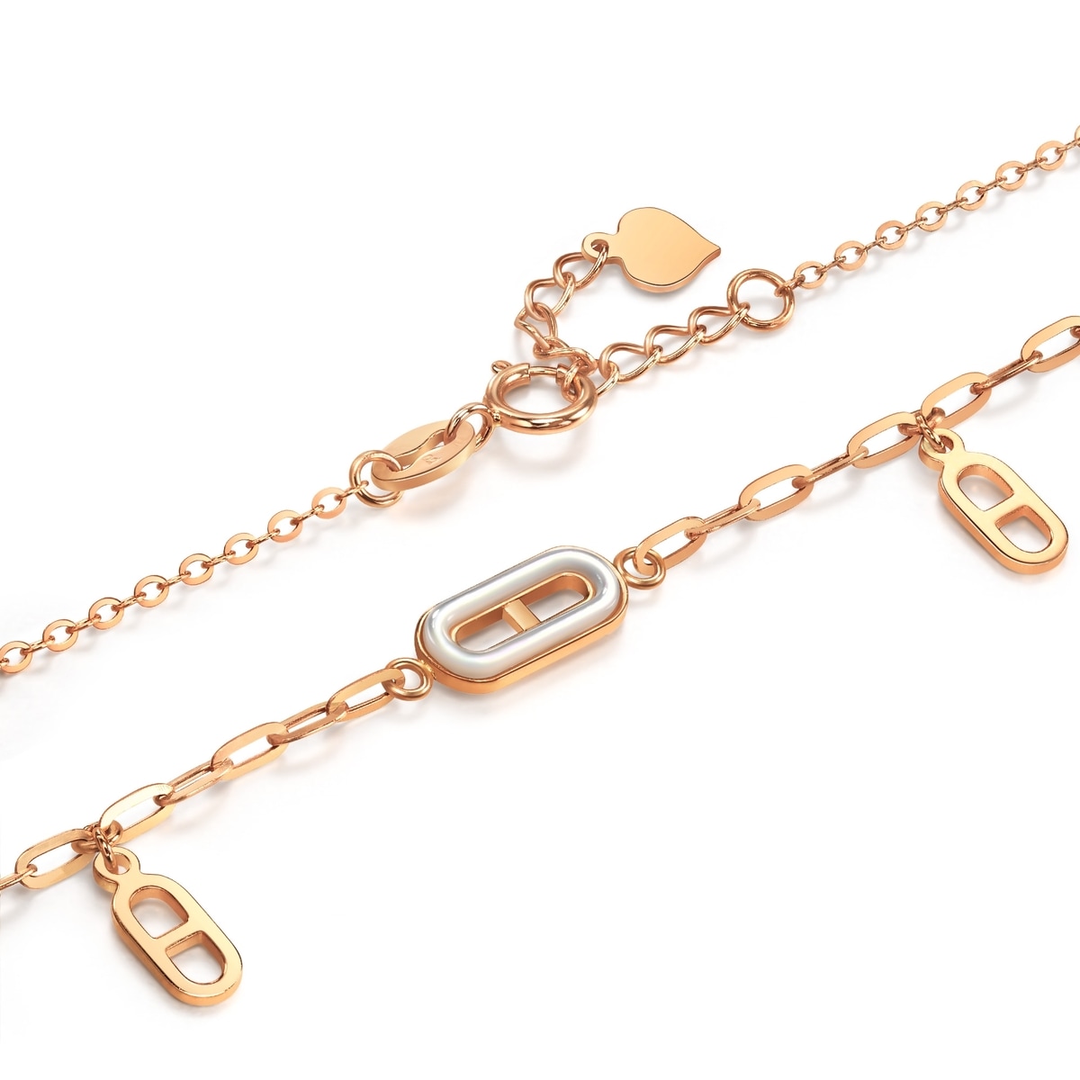 周生生18K紅色黃金手鍊,長環形造型以白貝母點綴,散發天然幻彩光澤,簡約時尚。