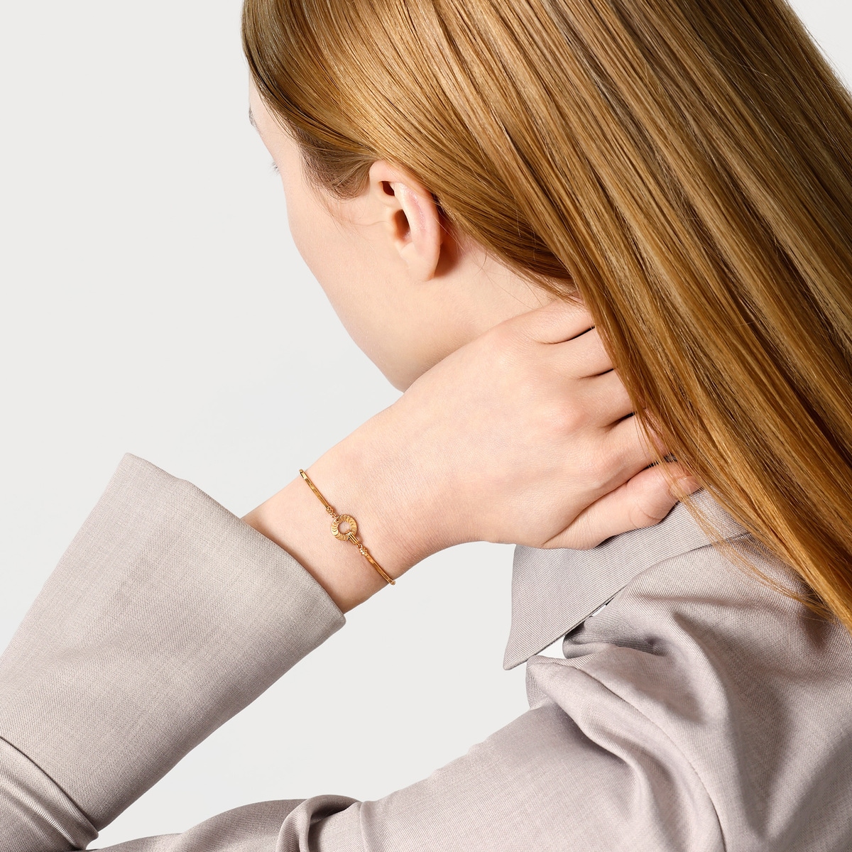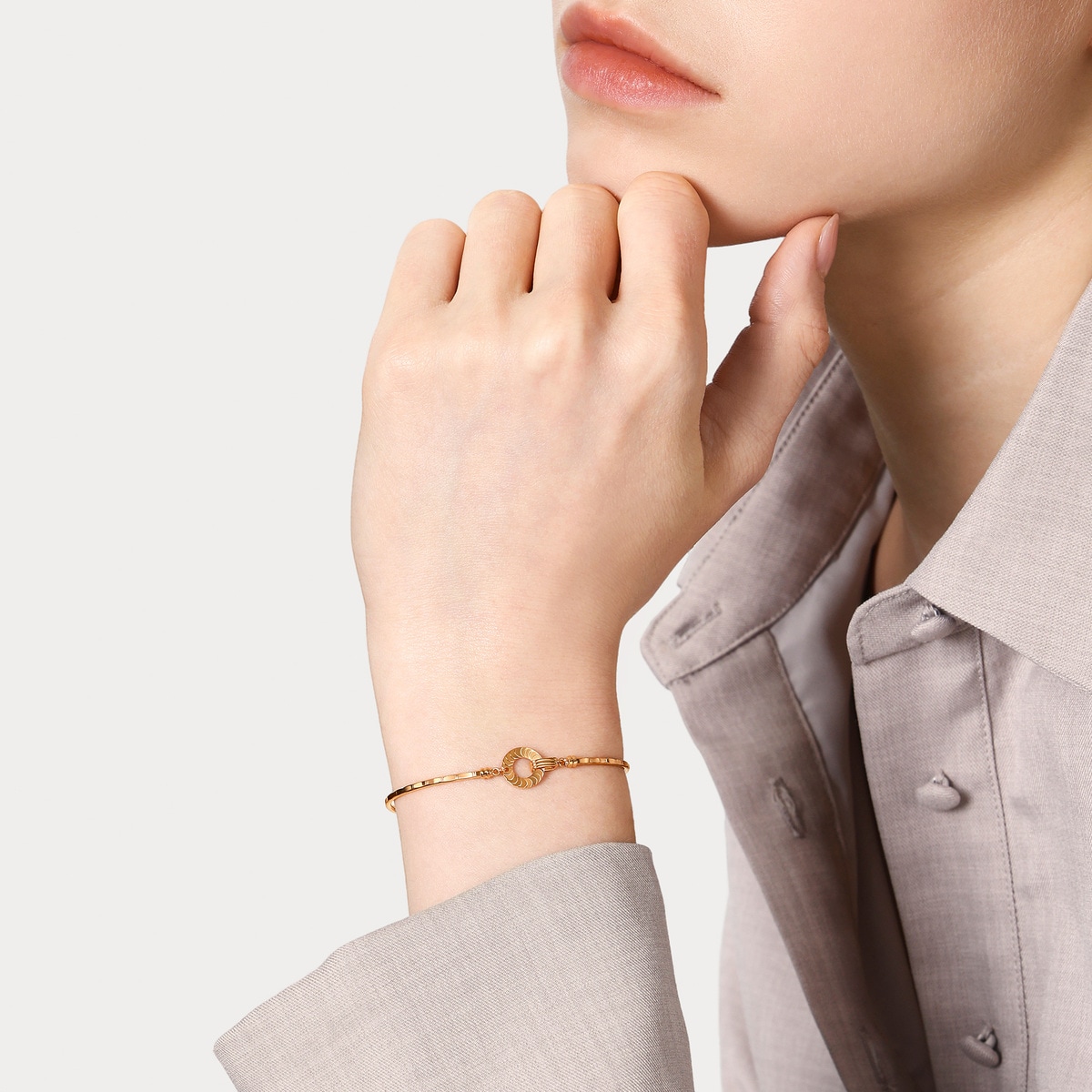 周生生18K紅色黃金手鐲,以簡約圓形詮釋當代美學,於圈環表面疊搭圓形鱗片,展現出豐富的立體層次,單邊採用扣環設計,別具時尚魅力,質感更顯細膩,閃耀迷人光芒。