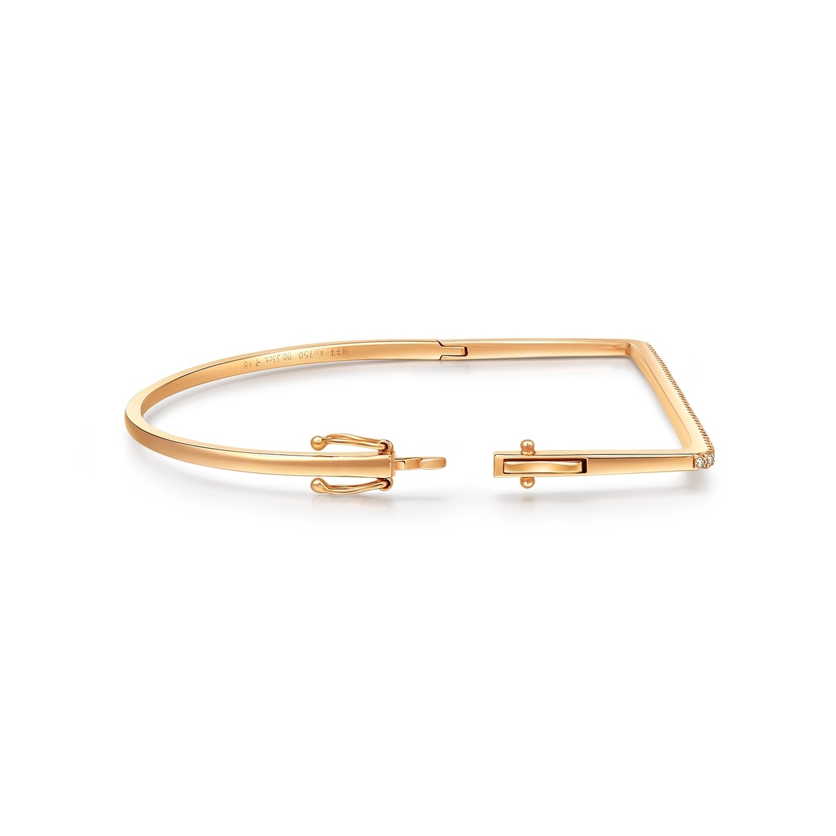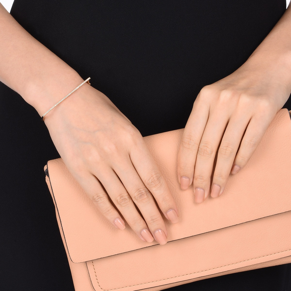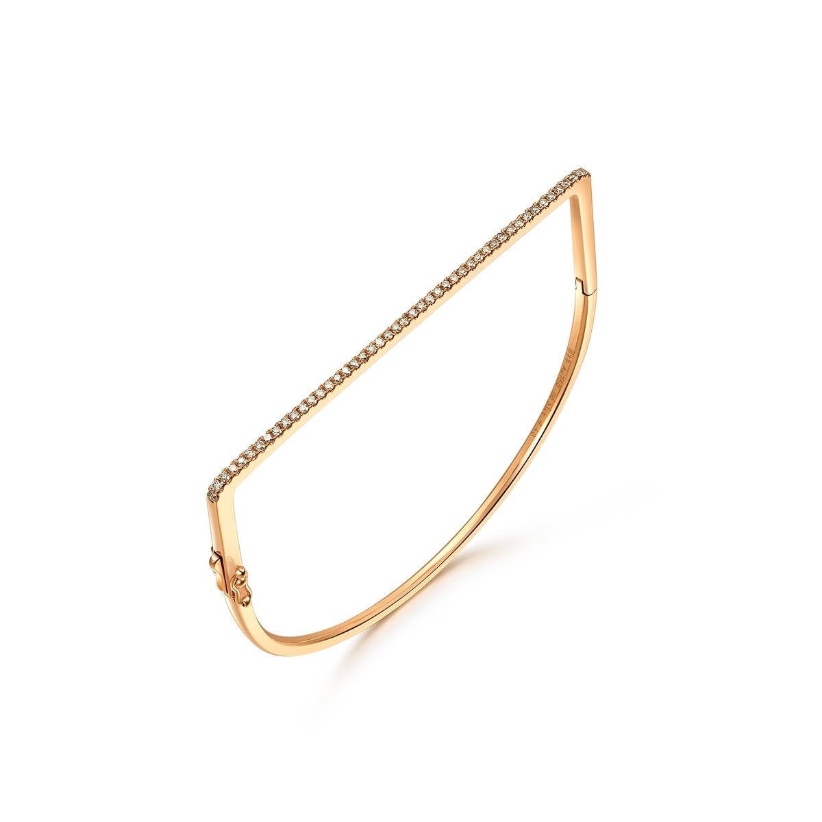 周生生口袋形設計獨特而不誇張,線條簡約俐落,配以一排閃爍美鑽,雅致高貴,疊戴多隻手鐲更顯時尚品味。