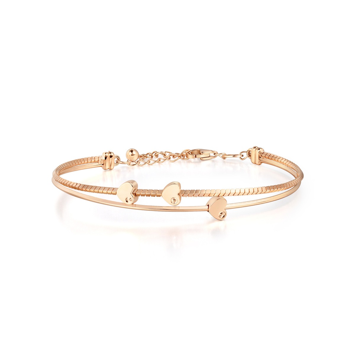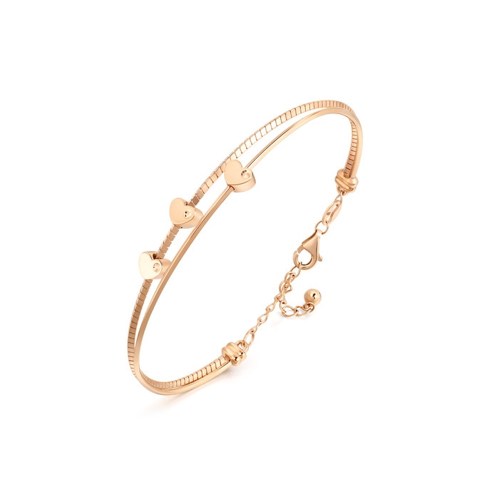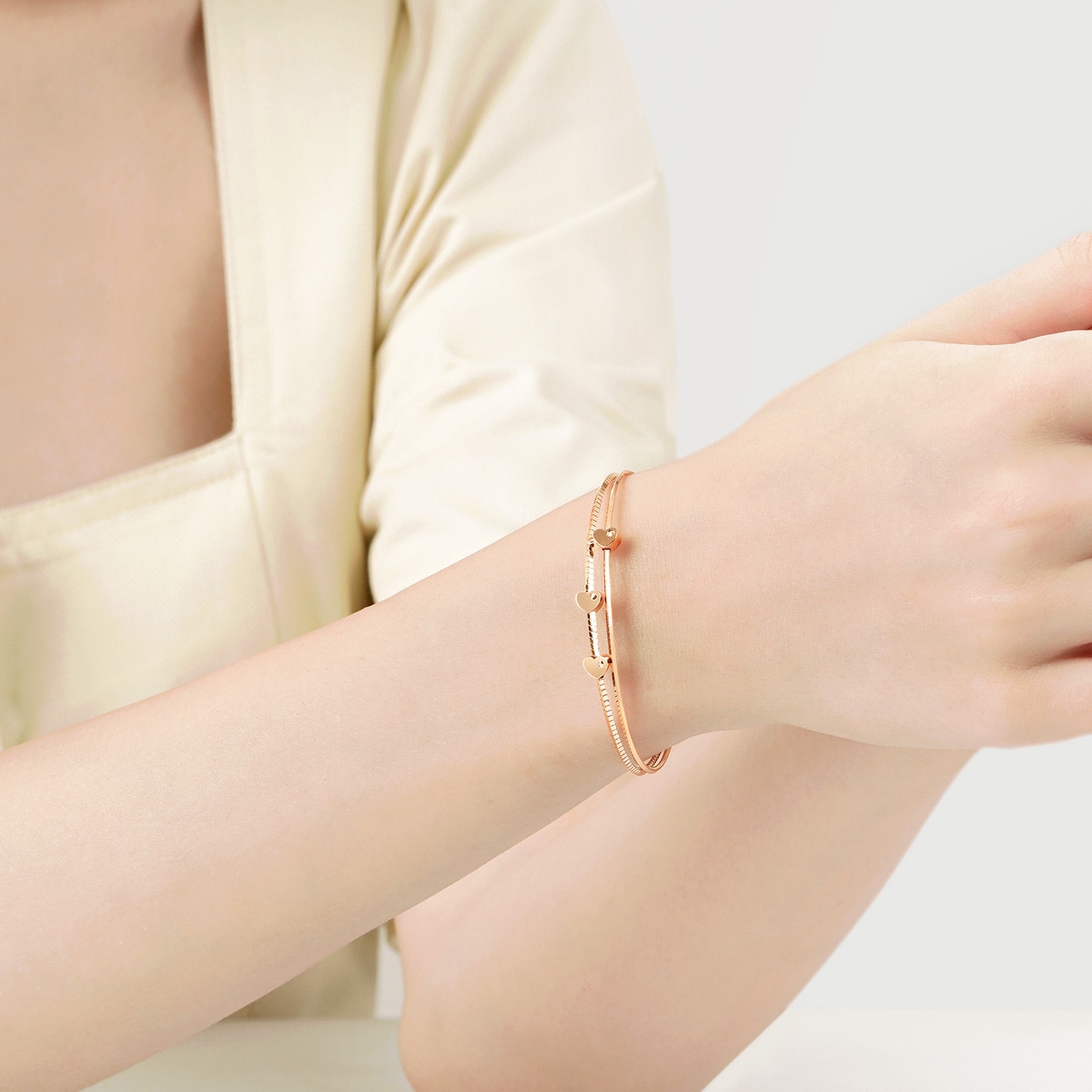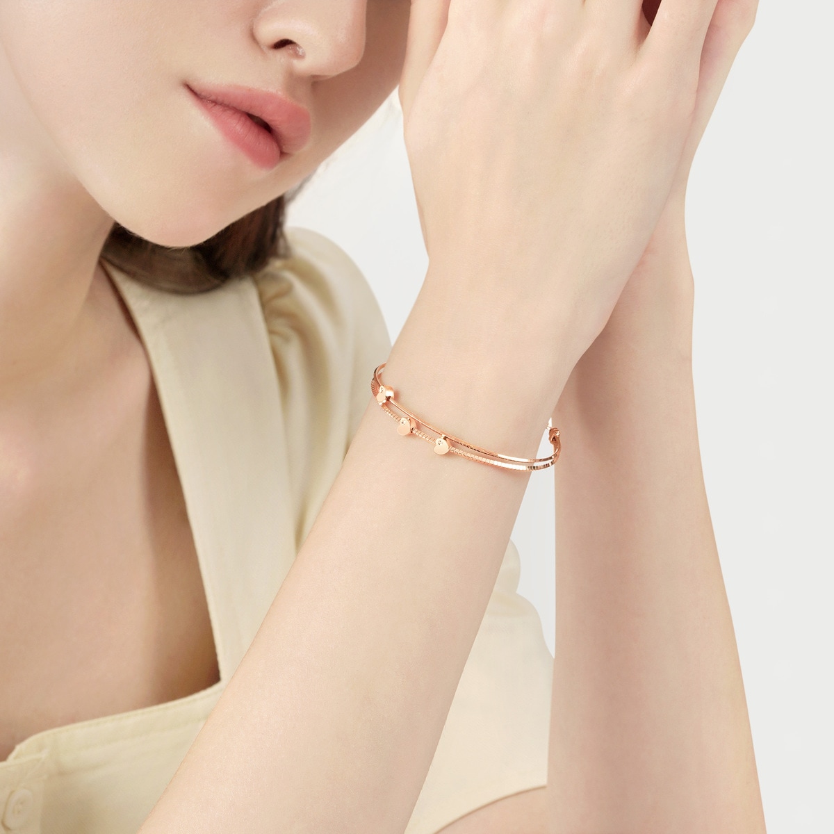 雙排幼身手鐲,心形配件增添浪漫感,為日常穿搭帶來小點綴。尾鍊設計可調節長短,易於佩戴。可混搭戒指,或疊戴不同手鐲,展現多變風格。