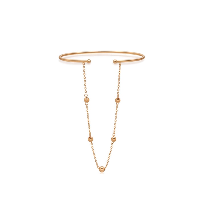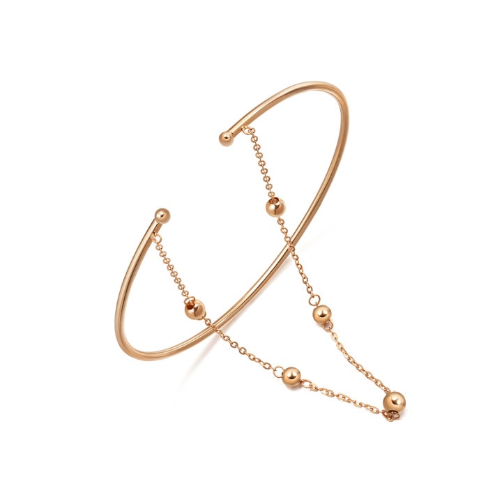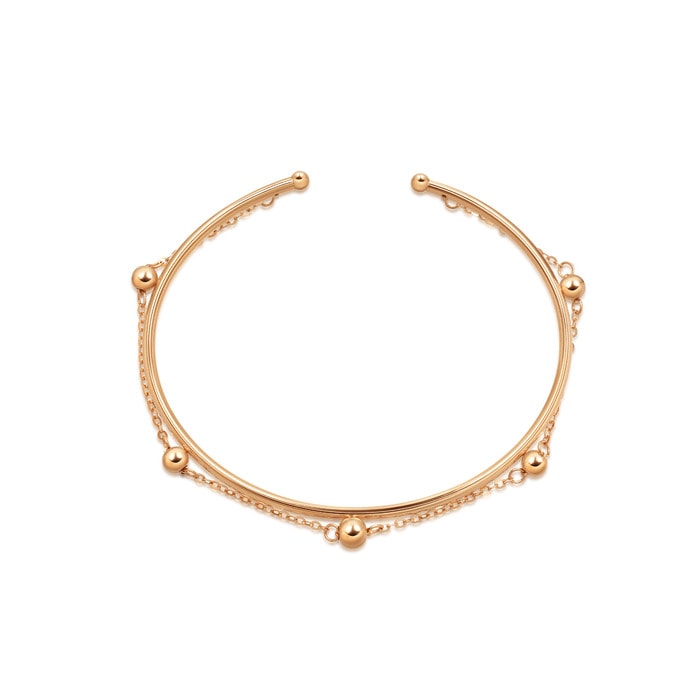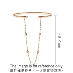 周生生開口式手鐲,兩端以珠鍊相連,剛柔並濟。幼身設計為日常穿搭帶來小點綴,可混搭戒指,或疊戴不同手鐲,展現多變風格。