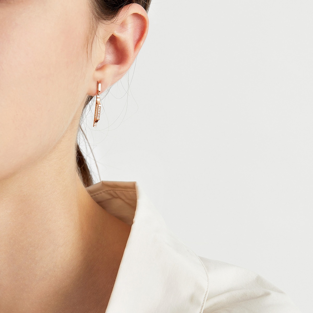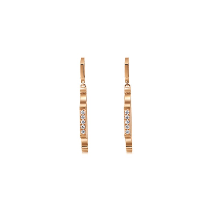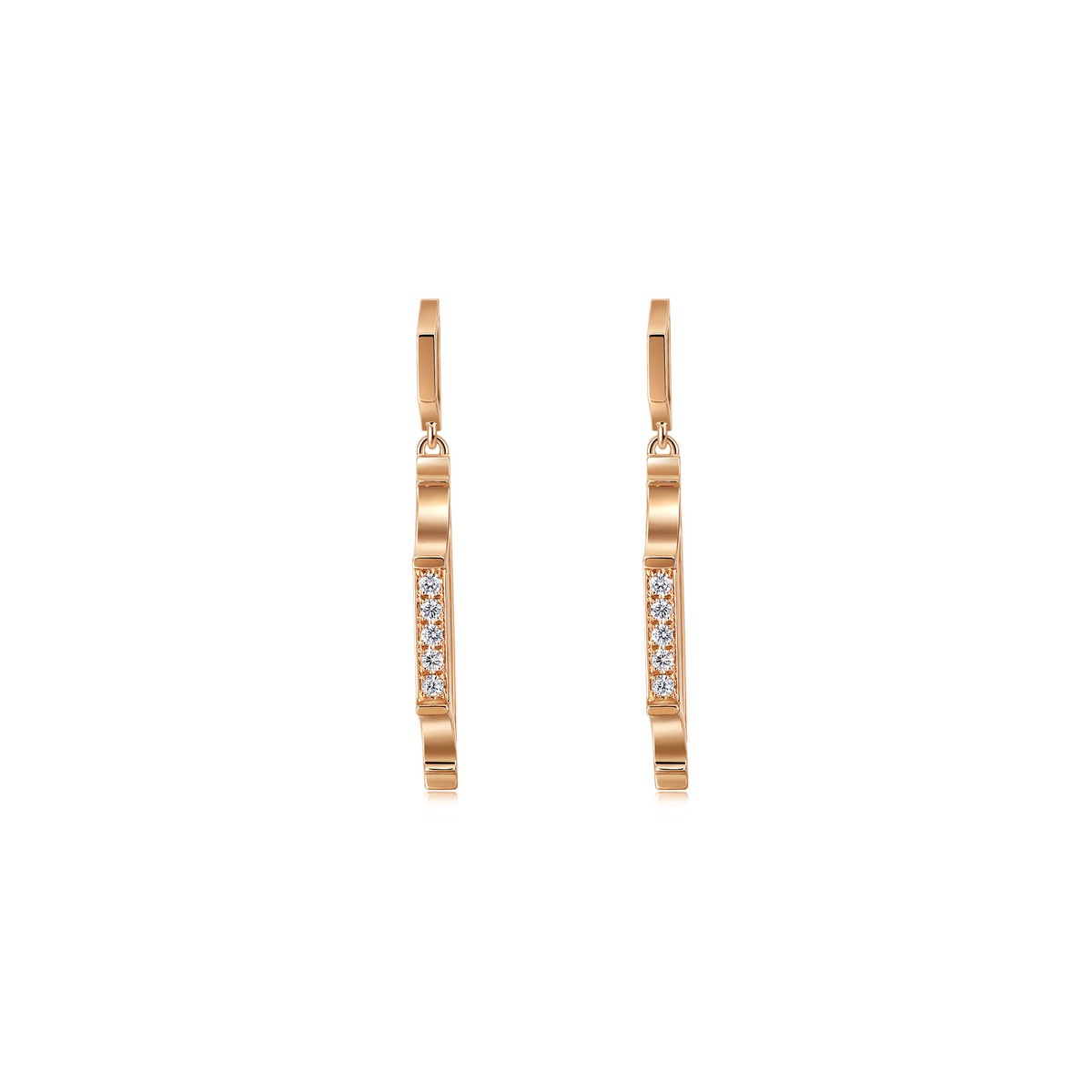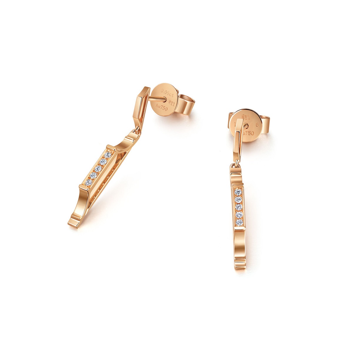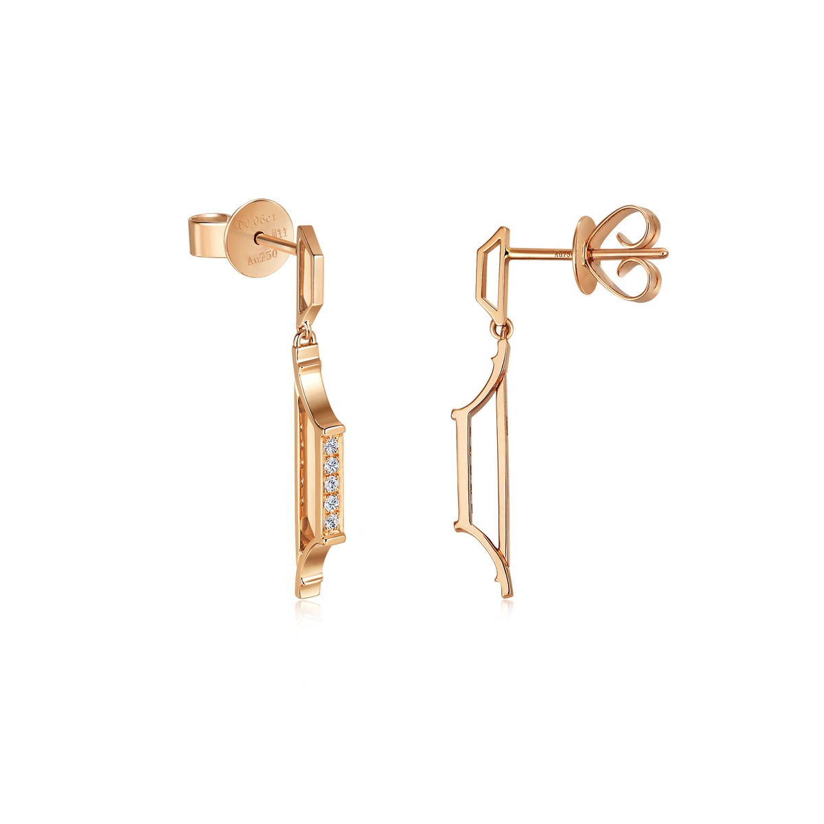 周生生故宮宮廷文化18K紅色黃金鑽石耳飾,將宏偉的太和殿建築輪廓化為簡約脫俗的設計語言,經典再現「築」主題元素的雅致格調。工匠打造出溫潤色澤的玫瑰金屋脊輪廓,於太和殿輪廓的主軸上鑲嵌閃爍美鑽,巧妙糅合傳統文化韻味和現代設計,大氣恢宏,呈現皇家古雅氣派之餘更富現代時尚。