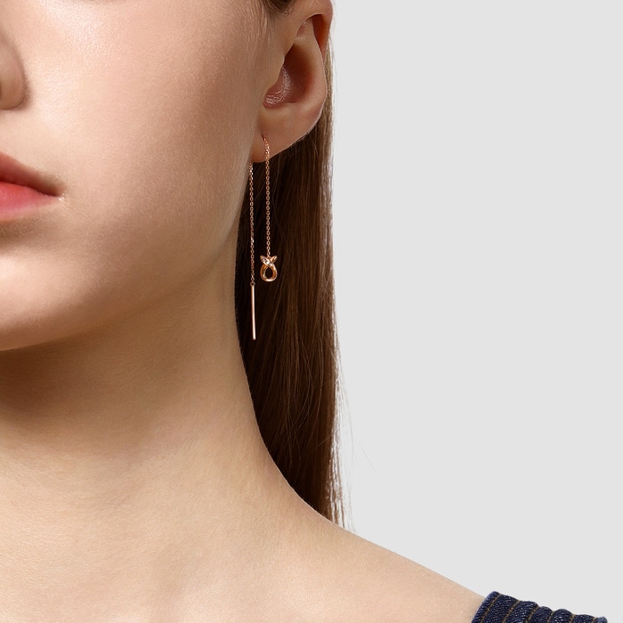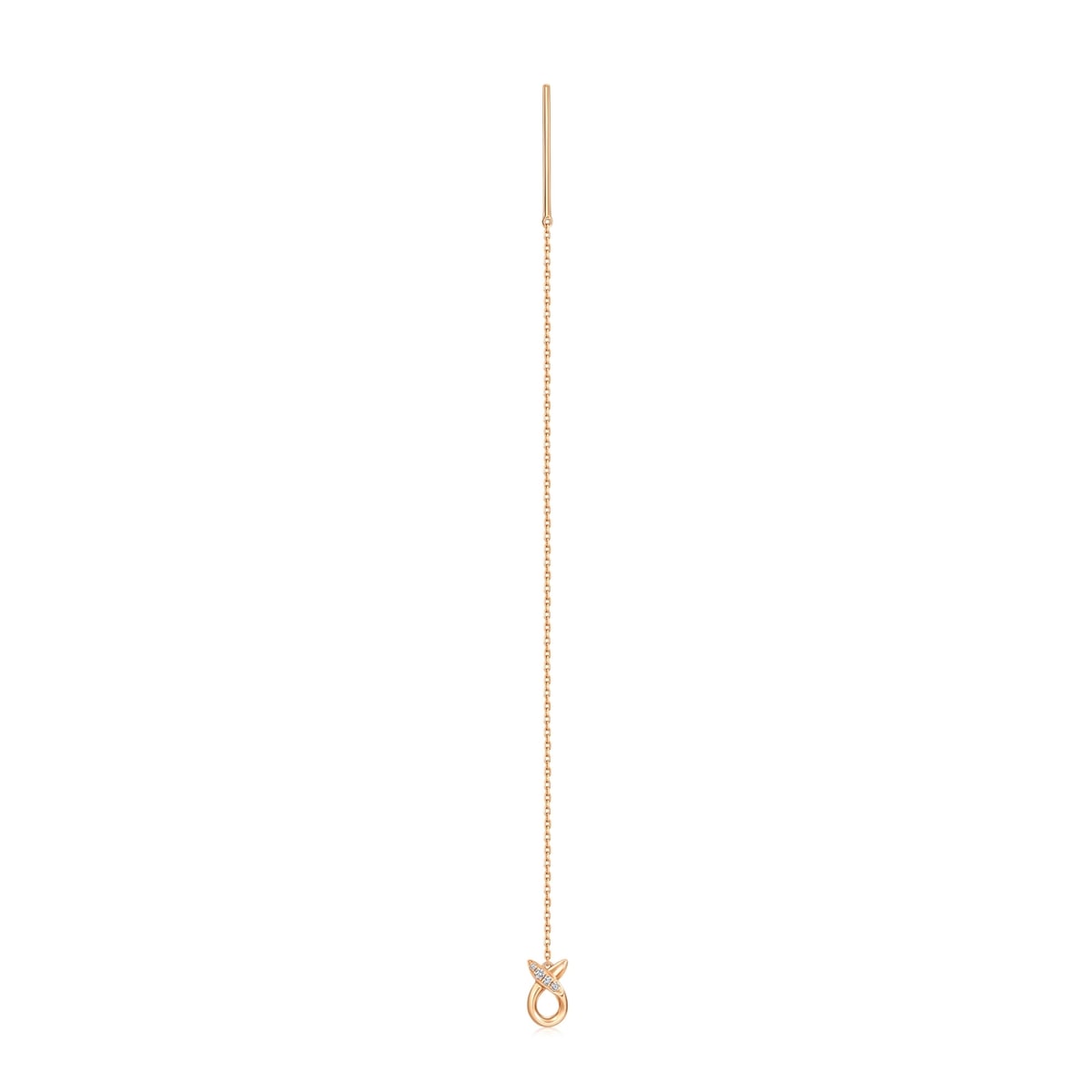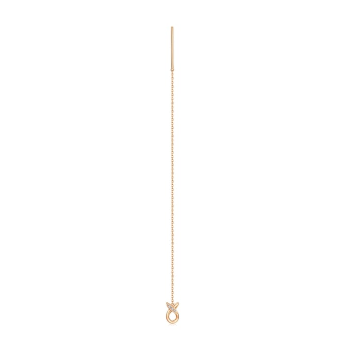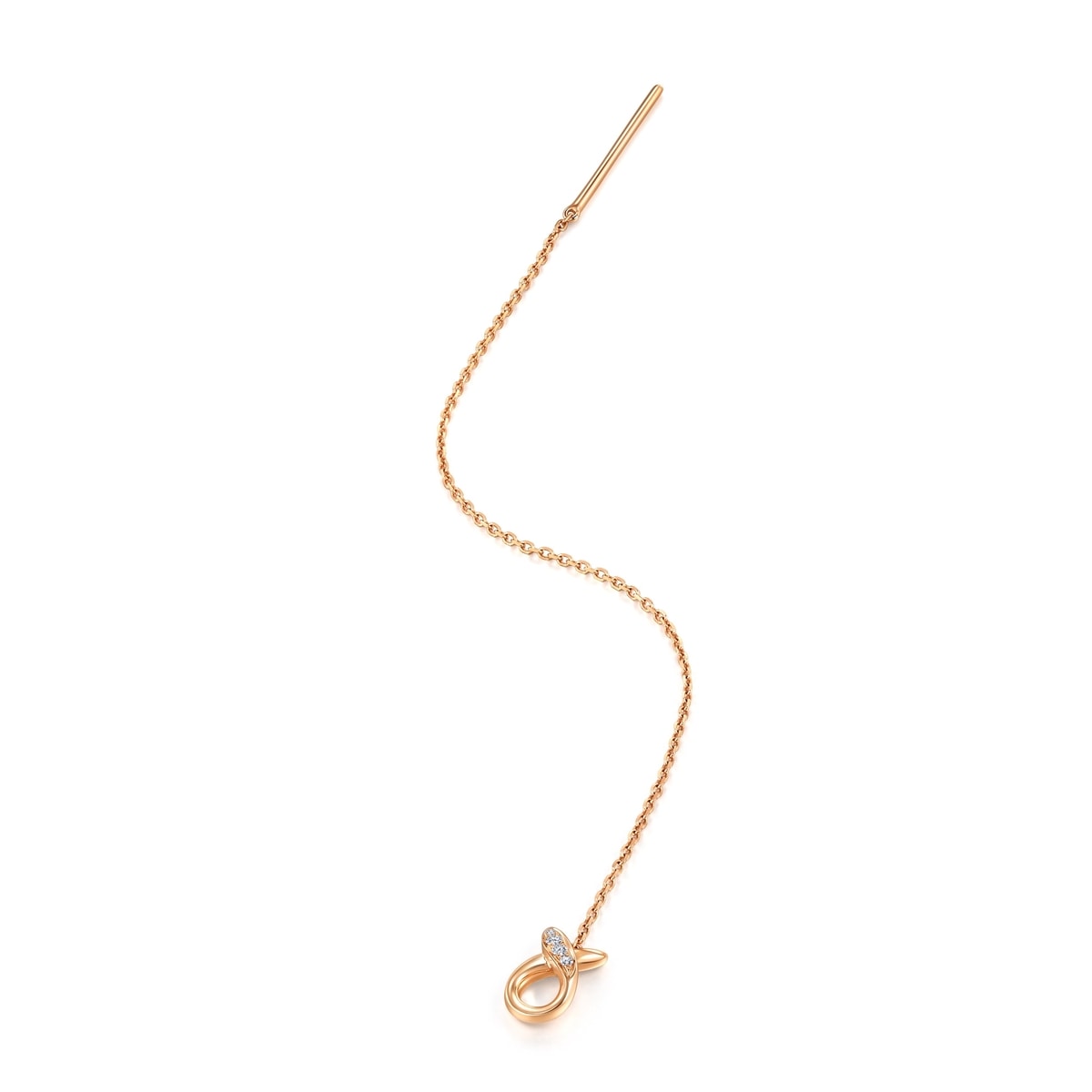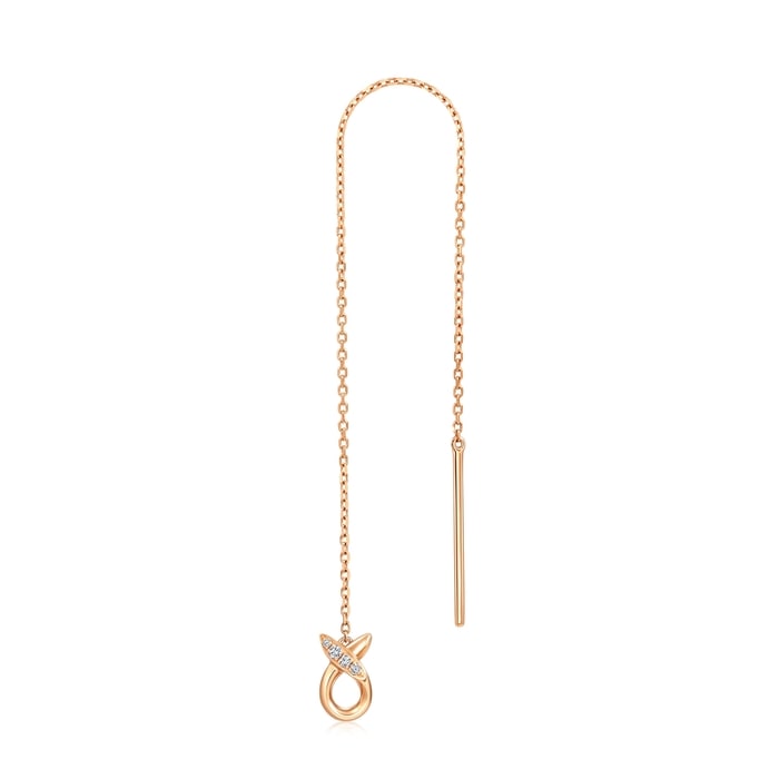 周生生18K玫瑰金單耳環,以兩片鑲有鑽石的嫩芽交疊形成心型圖案,並鑲有多顆美鑽,垂吊於耳上閃爍光芒;款式設計又像魚的形態,象徵生命力及活力,並能輕易配搭各種日常時尚風格。
