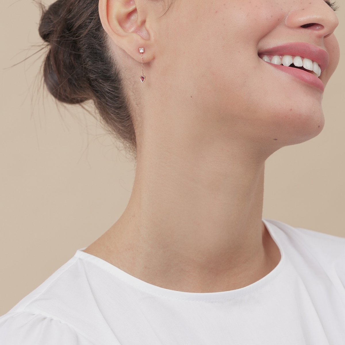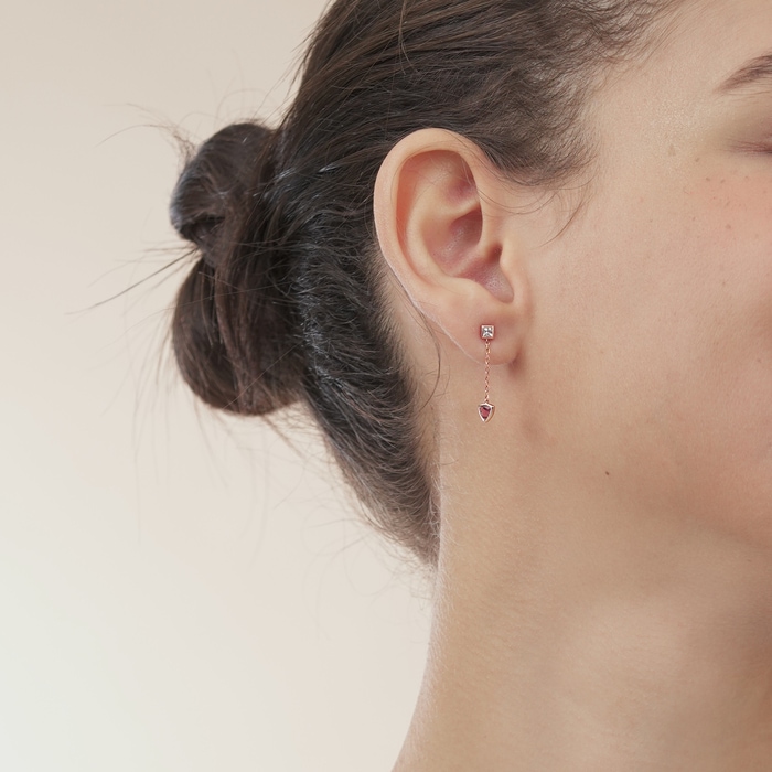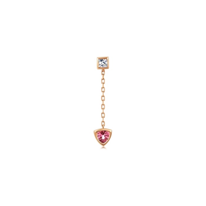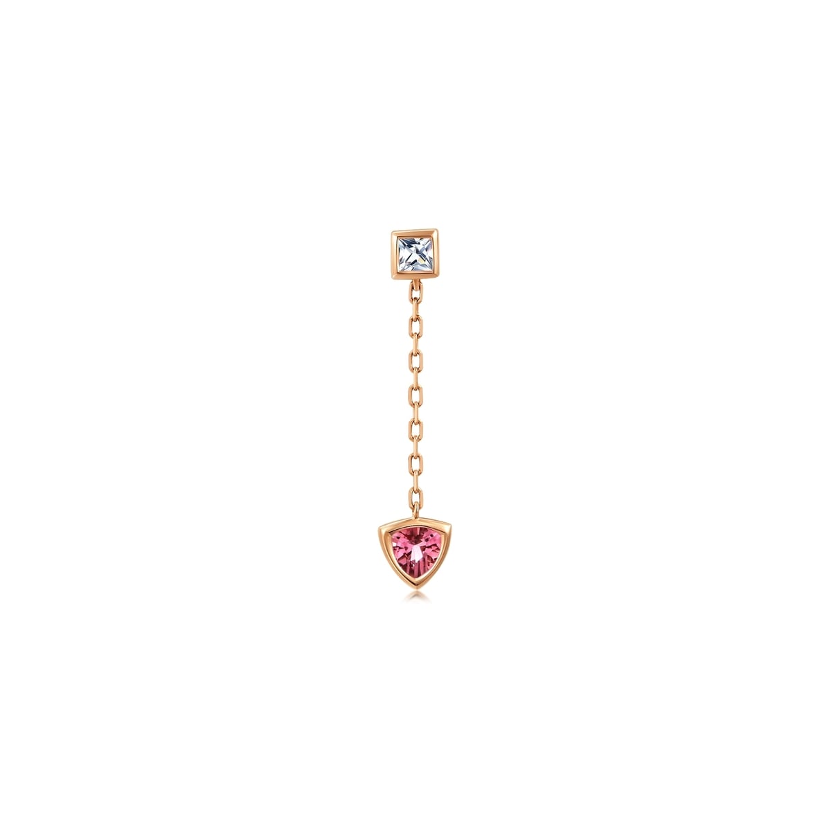 18K玫瑰金單耳環,設計以幾何圖形為主,綴以無色托帕石和粉紅碧璽,懸垂設計,隨你的步伐擺動,優雅時尚,可與同系列其他混合疊戴,玩味十足,戴出自由不拘的活力。