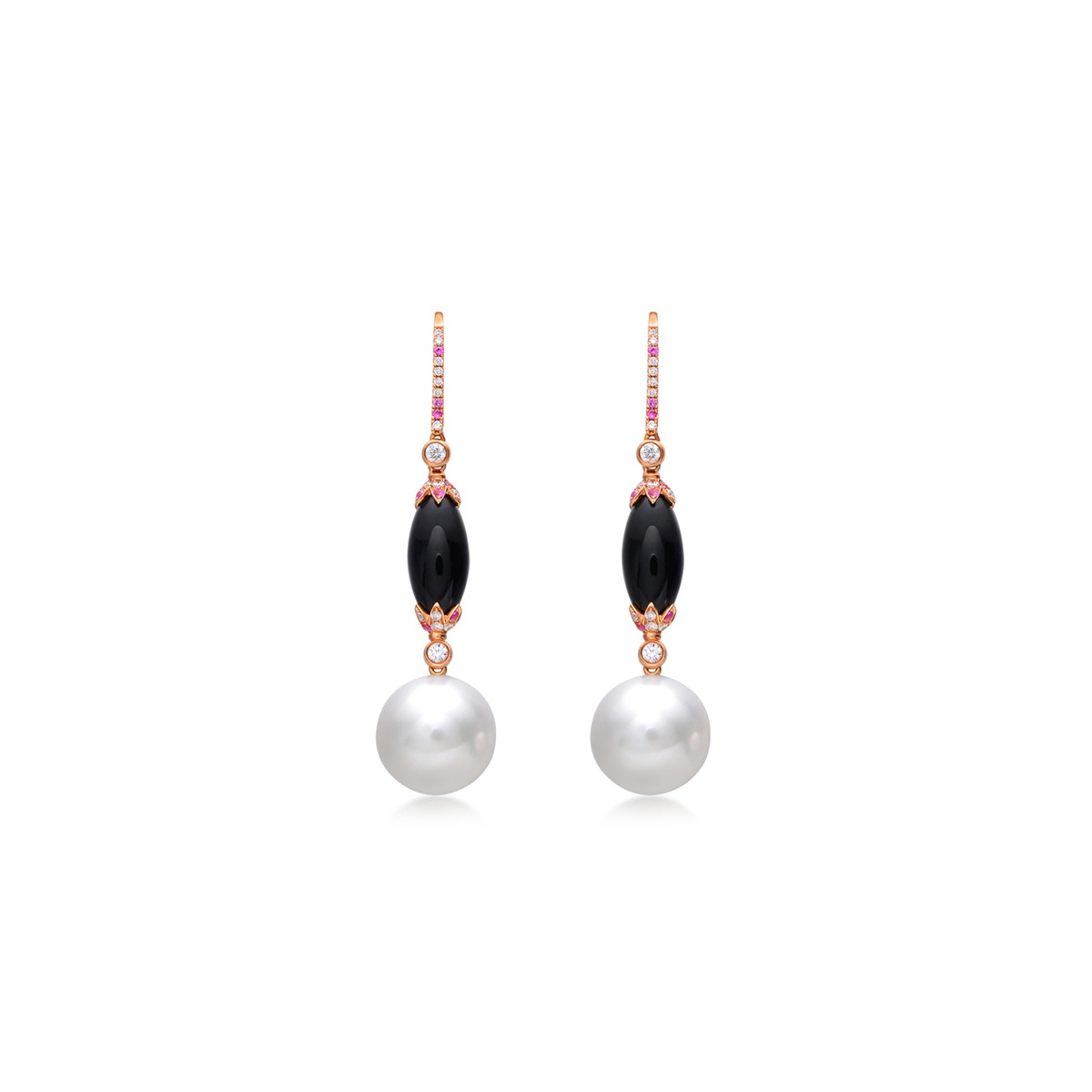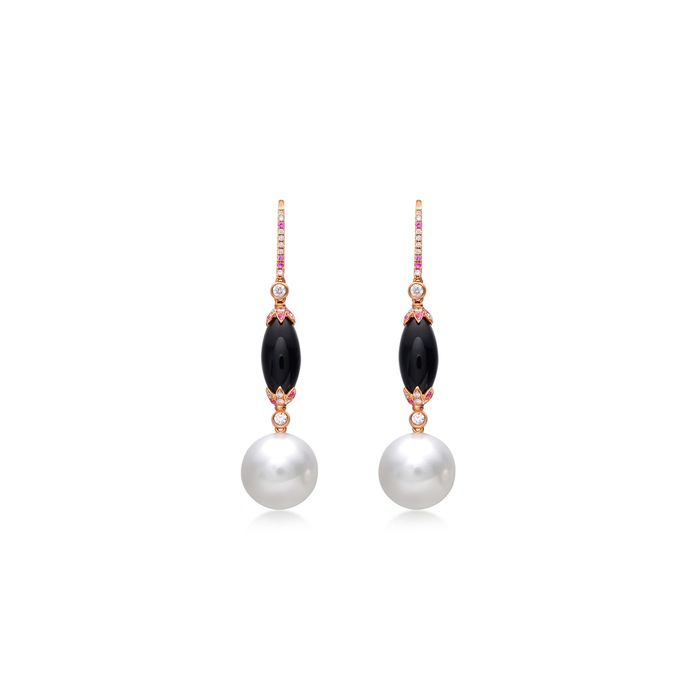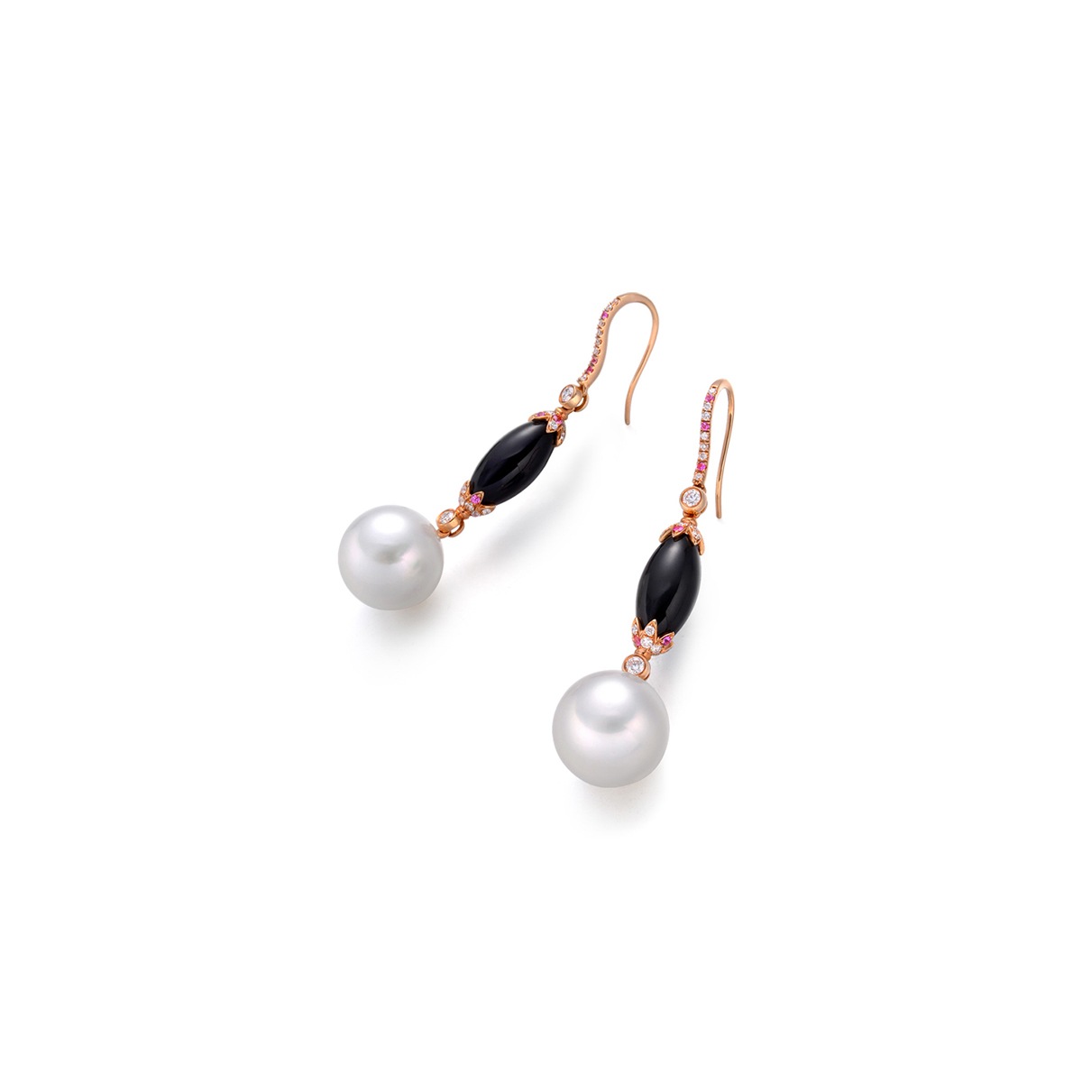 南洋白珍珠耳環配以鑲有圓鑽及彩色寶石的簡約紅金吊飾,充滿時尚感。LaPelle系列選用最優質的日本珠、南太平洋珍珠及大溪地黑珍珠,以珍珠為主調賦以不同設計風格,煥發溢彩流光,如珍愛承傳,恆久典雅。