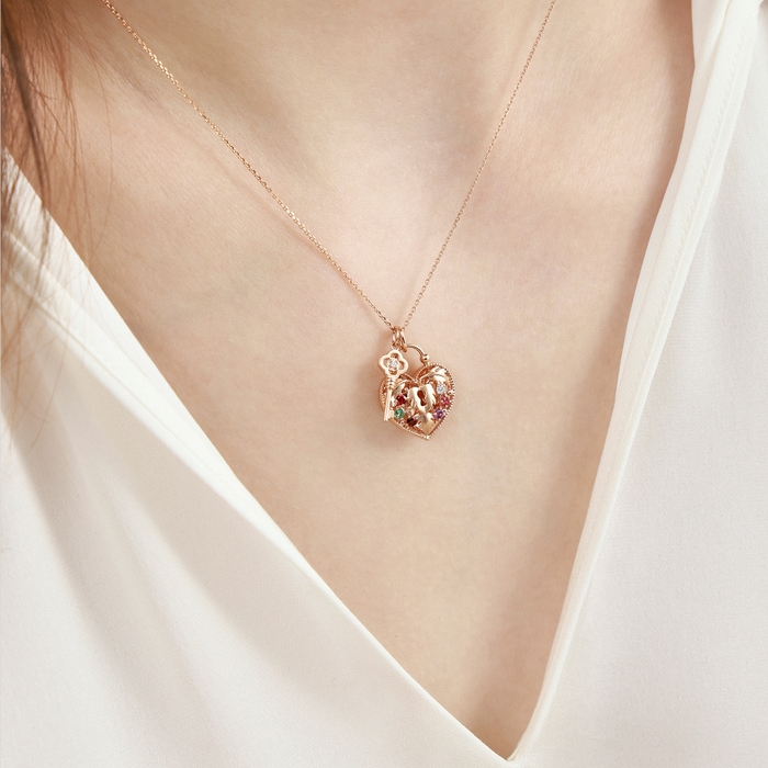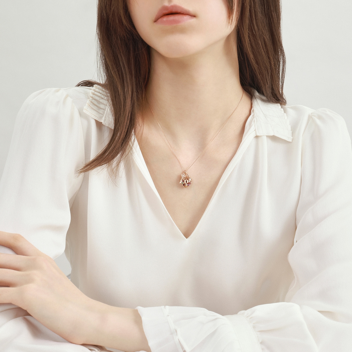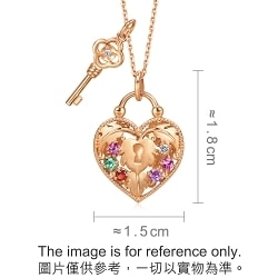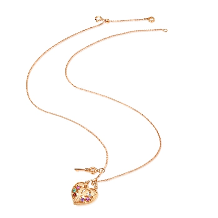 周生生18K紅色黃金頸鍊屬於V&A Regard系列,靈感源自維多利亞時期流行的心形掛鎖,代表對愛情的真摯承諾。吊墜造型啟發自19世紀英國工匠製作的黃金掛鎖珠寶,極盡精緻唯美,配有綴滿美鑽的鑰匙,象徵對方緊握打開心門的鑰匙。絢爛多彩的寶石排列有致,隱藏着戀人彼此的專屬密語「REGARD」*,宣告對愛情的無比尊重。