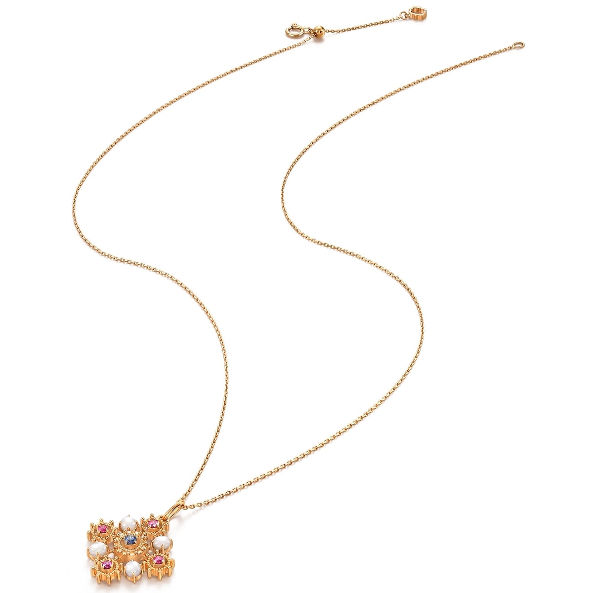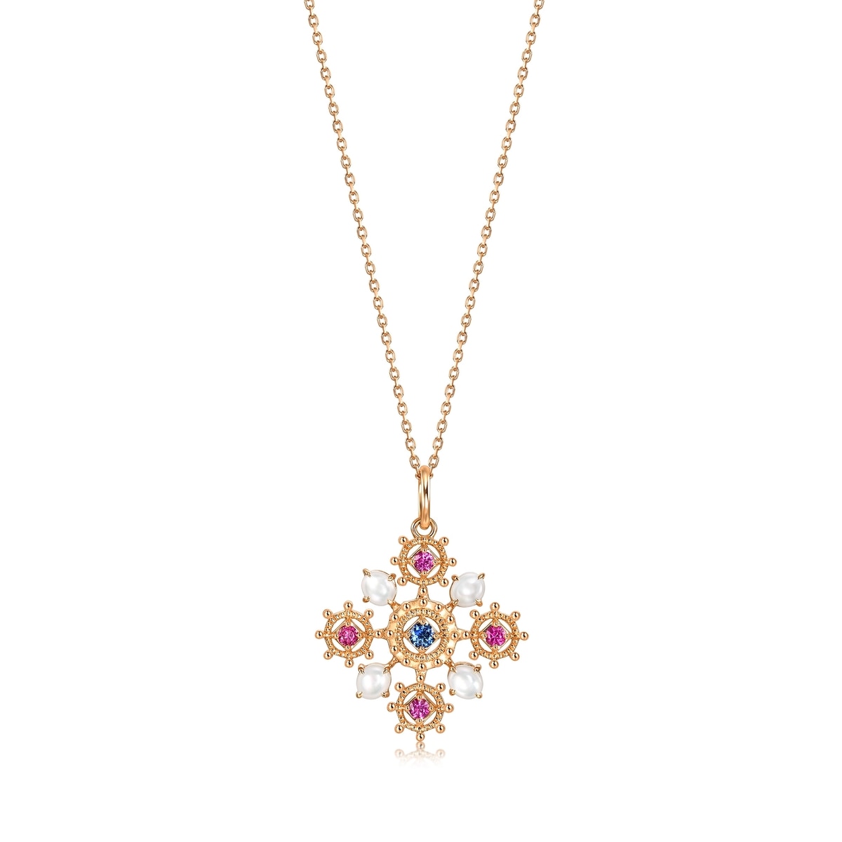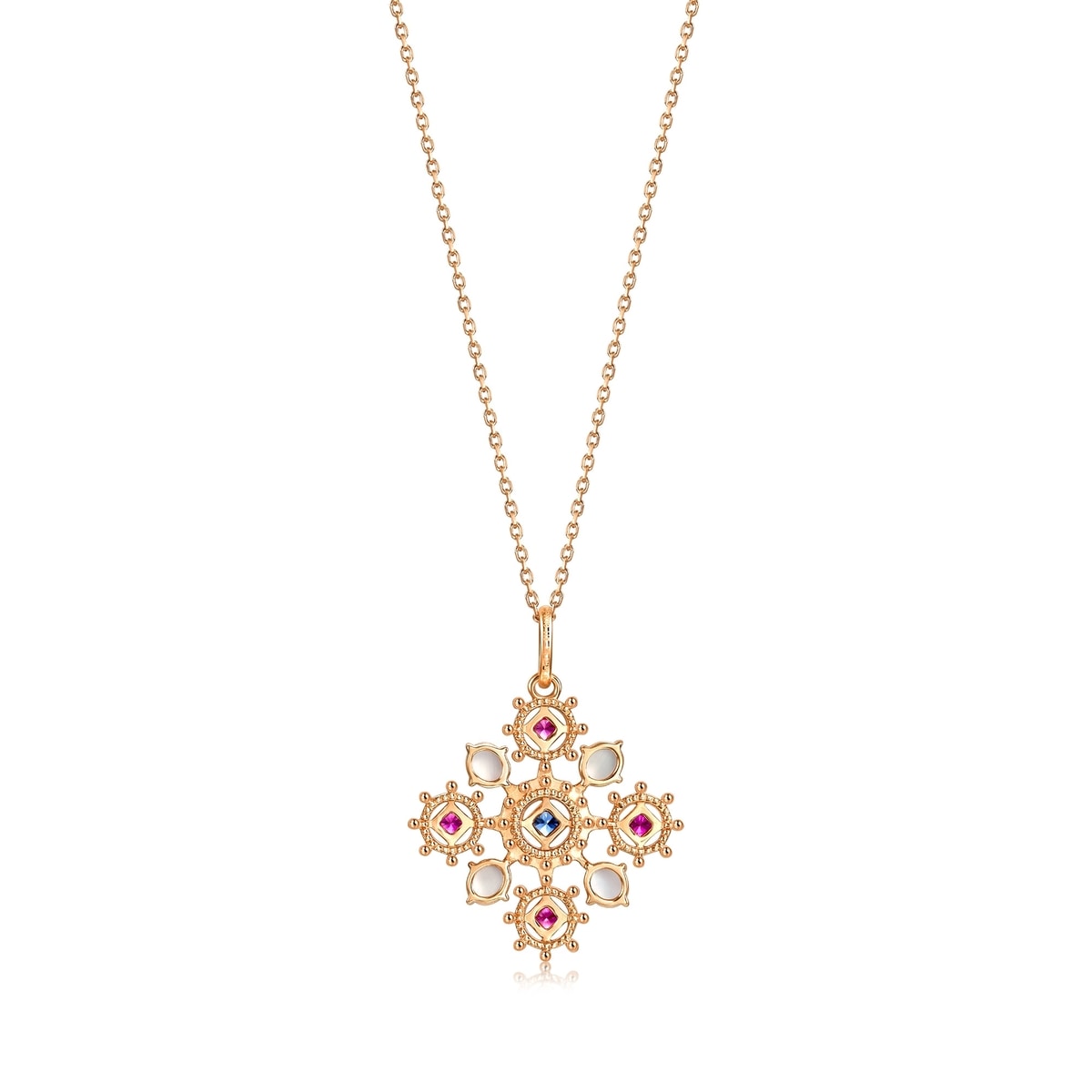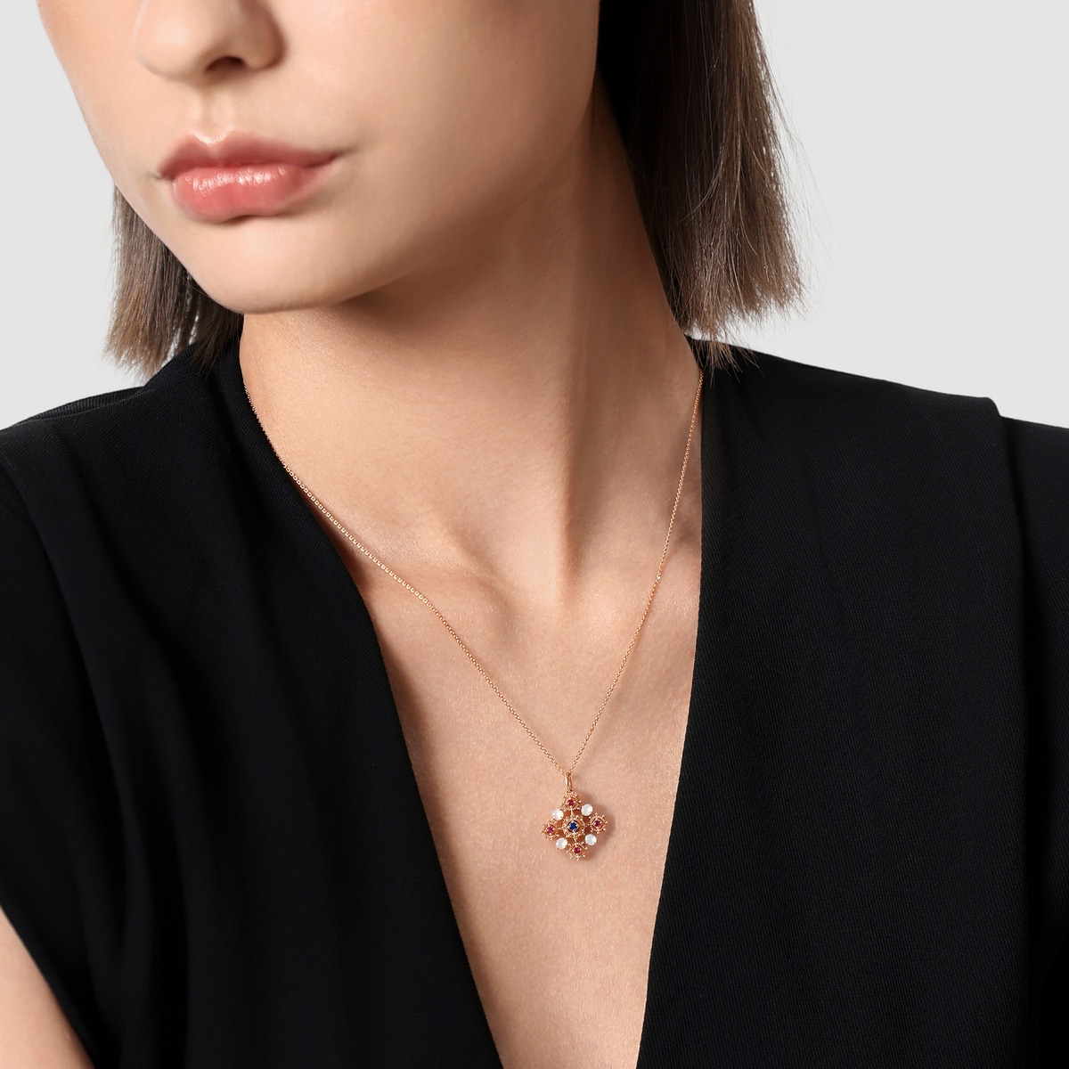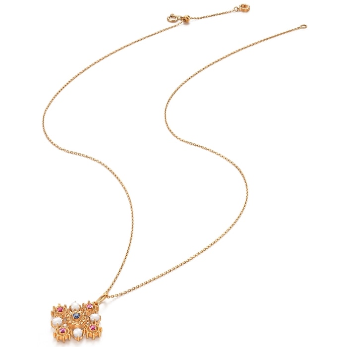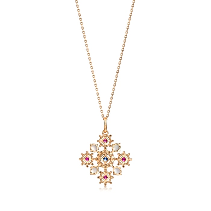 頸鍊設計啟發自V&A最備受矚目的珠寶珍藏之一,從15世紀德國工匠所製作的鍍銀十字架中汲取靈感,中世紀時期流行於胸前佩戴十字架,藉此帶來平靜與安寧,帶來保護力量。吊墜流淌著中世紀獨有的美學風格,融合精緻通花及絢爛寶石,重現藏品的雋永之美,動人心弦。