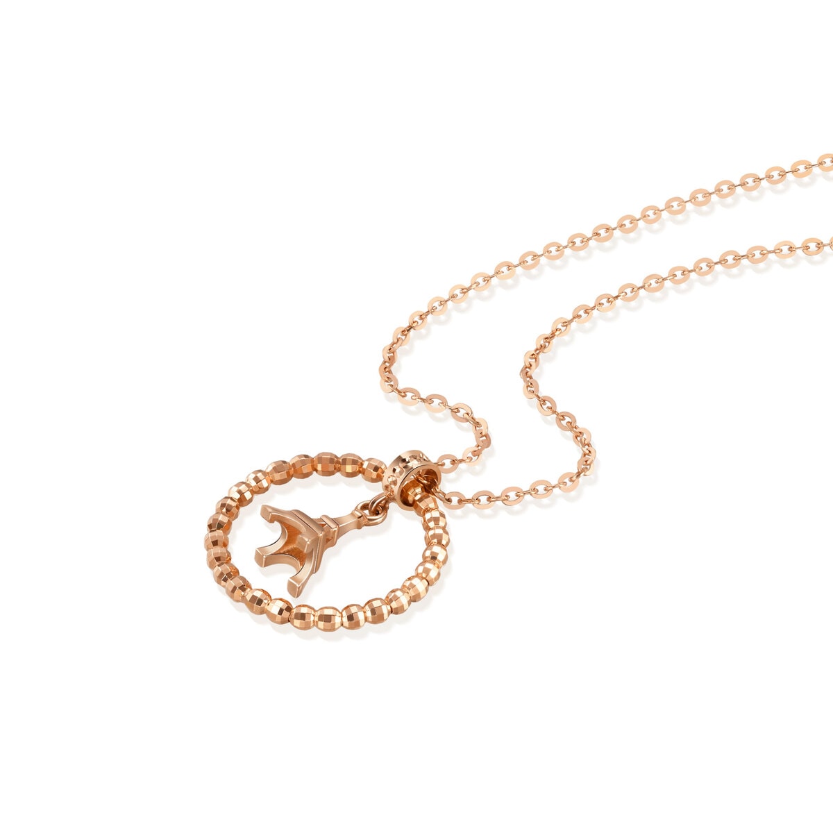 周生生18K紅色黃金頸鏈,以靈動設計變奏全新風貌,珠邊花紋圓環內掛鐵塔吊飾,舉手投足間翩然起舞,精緻靈巧。