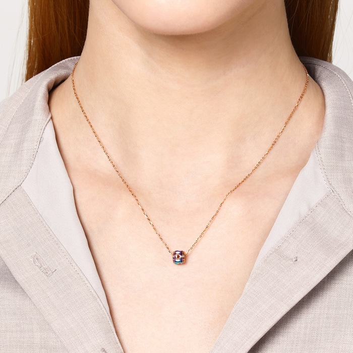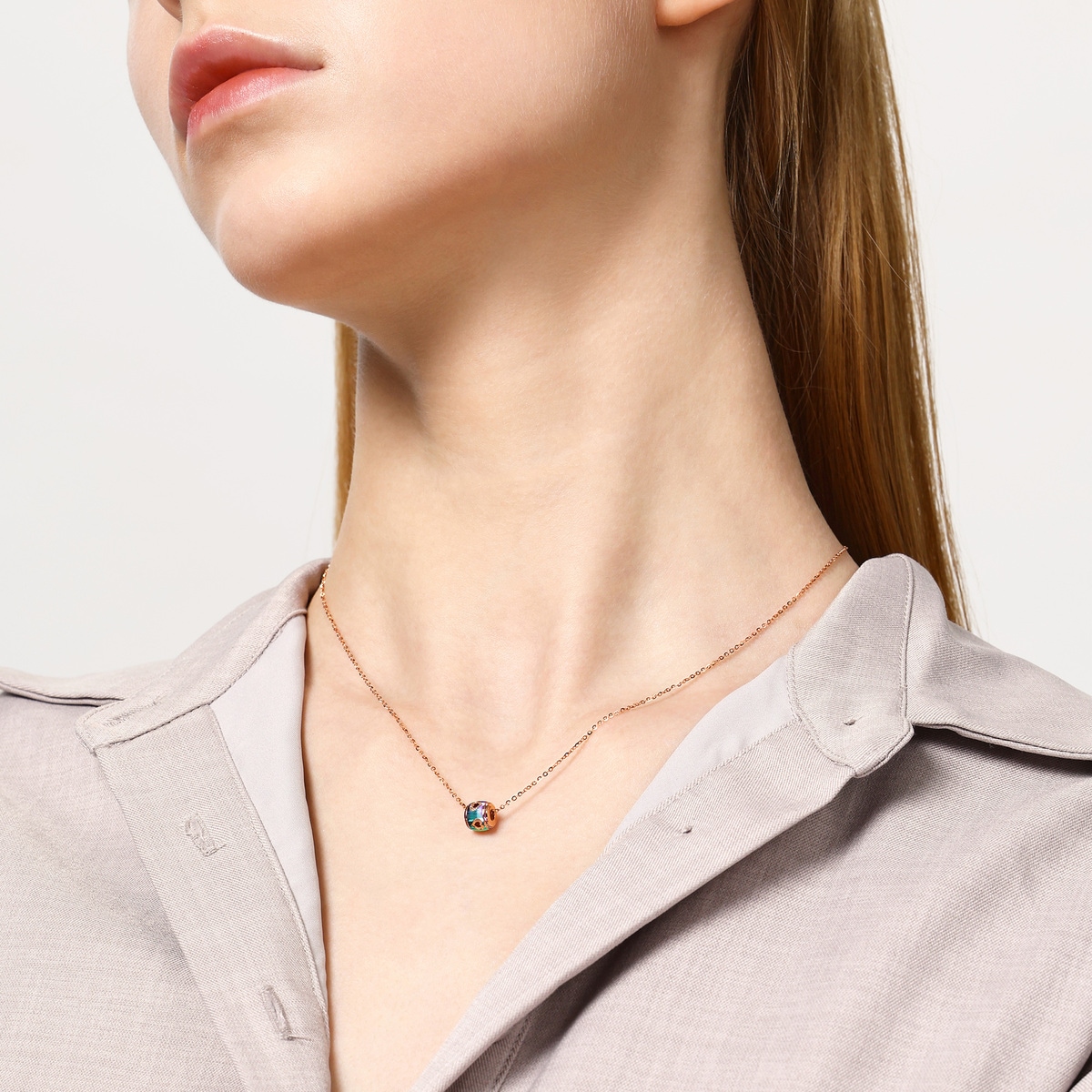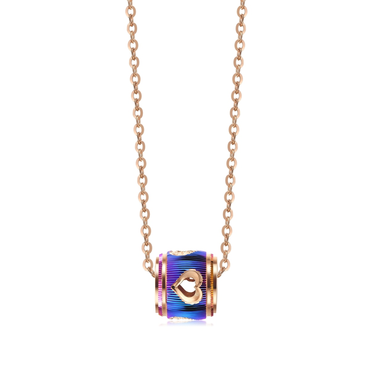周生生18K紅金頸鍊,炫幻奪目的表面顏色以獨特的真空、高溫鐳射加工處理;車花位置的不同造就出每件獨一無二的顏色; 在幻彩粉紅襯托下,勾勒出精緻獨特的鏤空心型圖案,甜美動人。