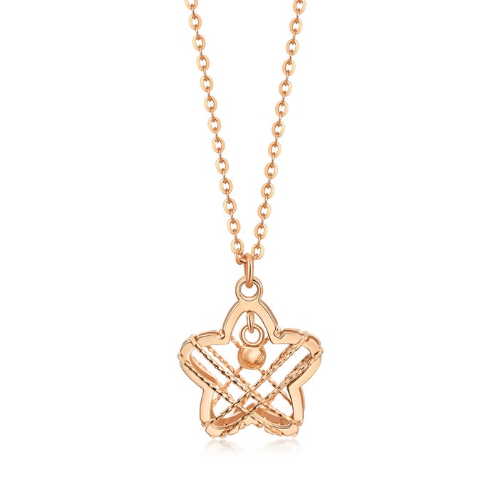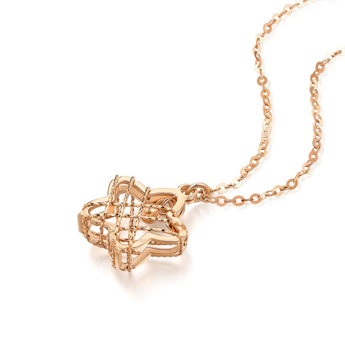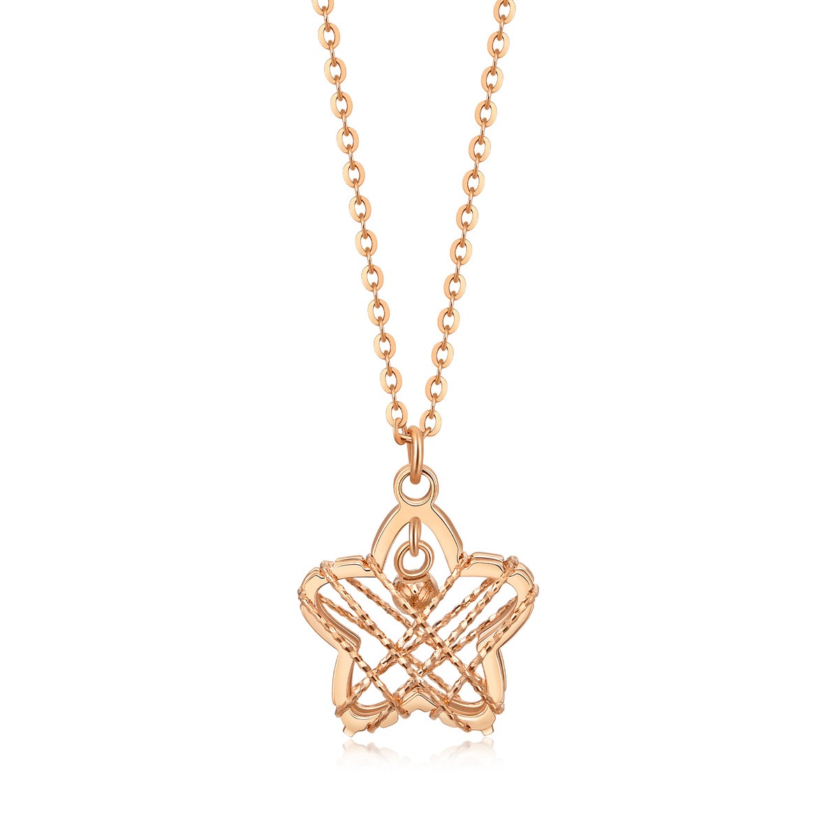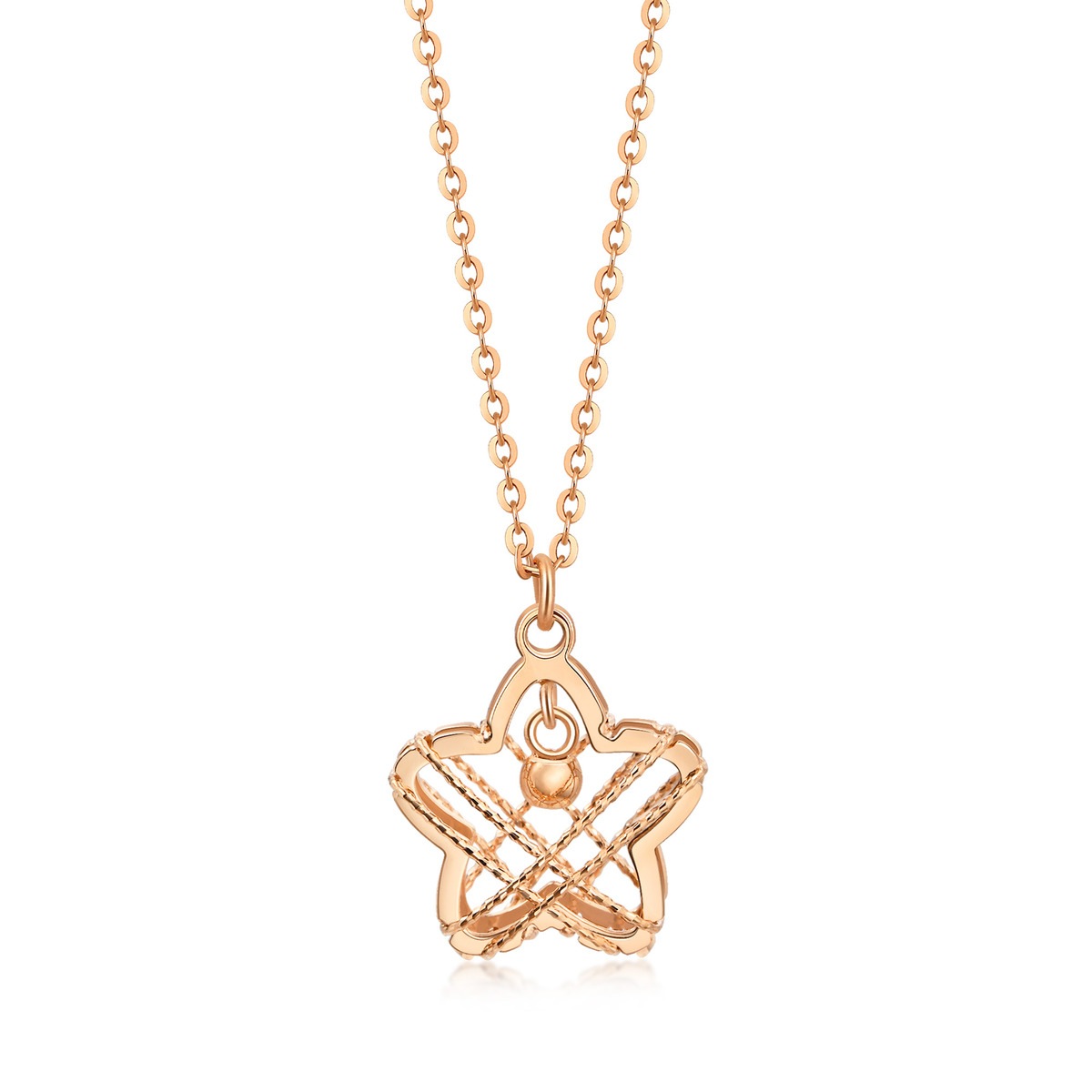 周生生18K 紅色黃金星星頸鍊,造型可愛立體,鏤空設計以批花線條交織而成,中間綴以小圓珠,佩戴後搖曳生姿,清新浪漫。