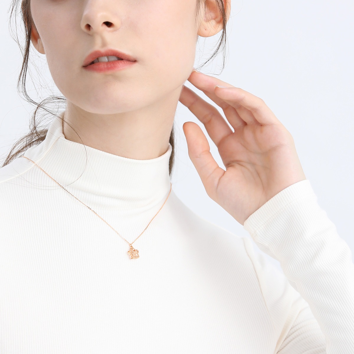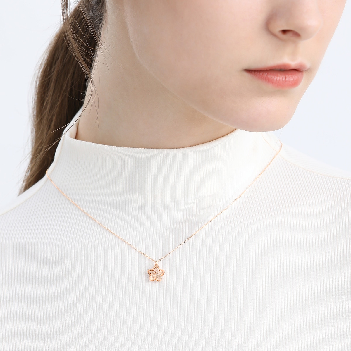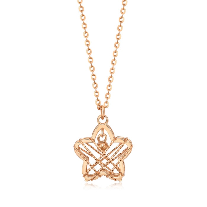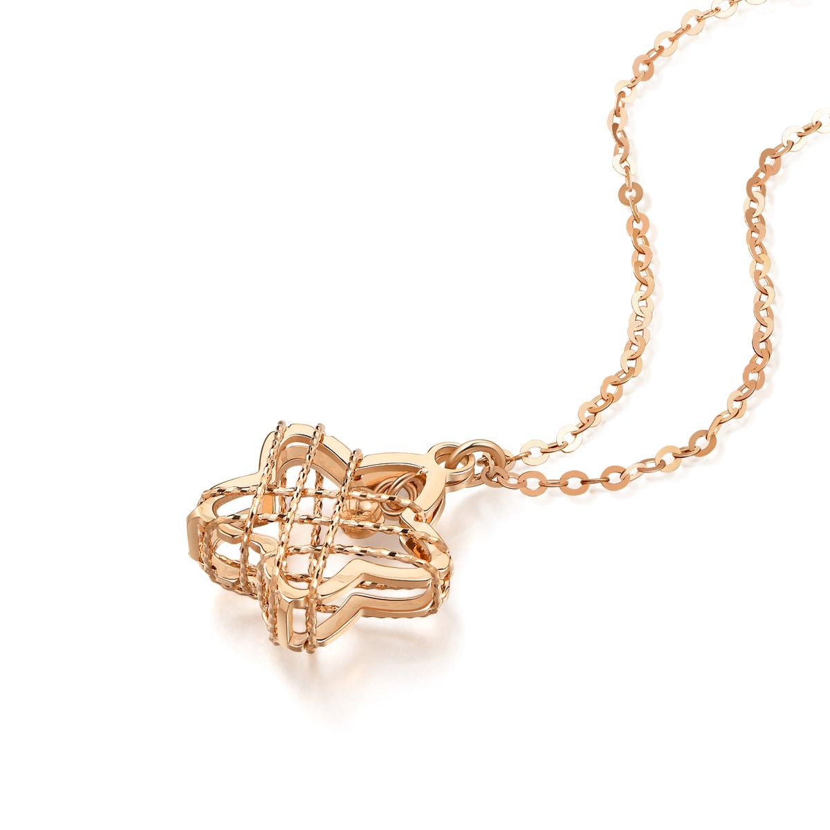 周生生18K 紅色黃金星星頸鍊,造型可愛立體,鏤空設計以批花線條交織而成,中間綴以小圓珠,佩戴後搖曳生姿,清新浪漫。
