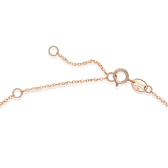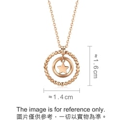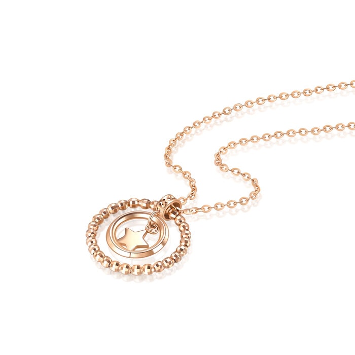 周生生18K紅色黃金頸鏈,以靈動設計變奏全新風貌,珠邊花紋與光面圓環內外相疊,中心穿掛星型吊飾,層次豐富,教人一見傾心。