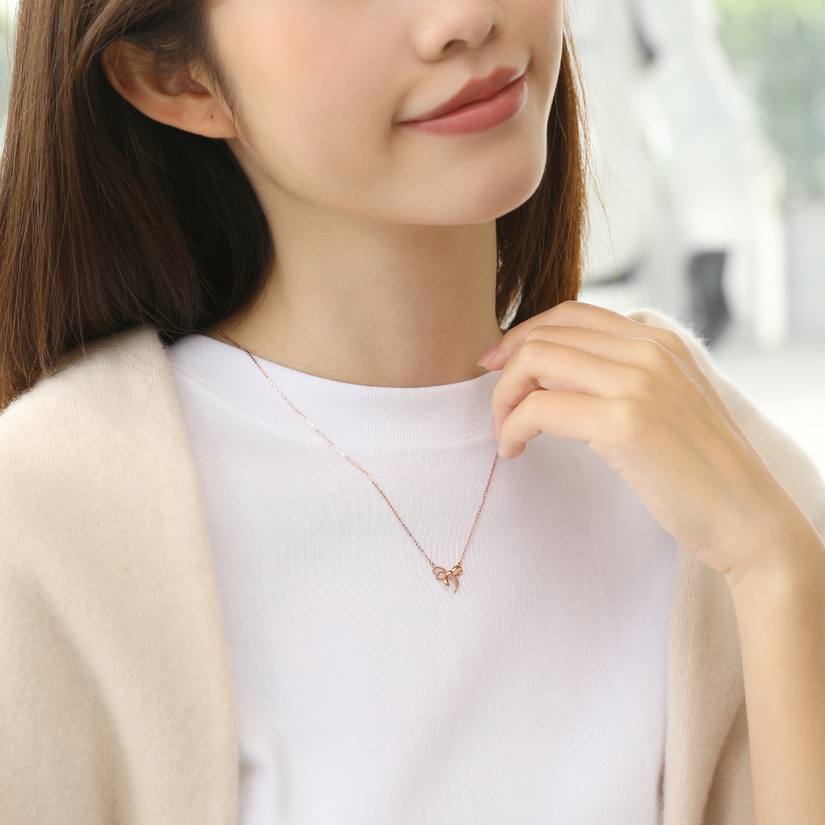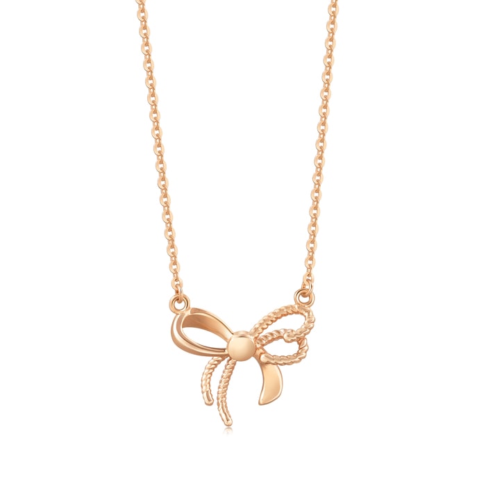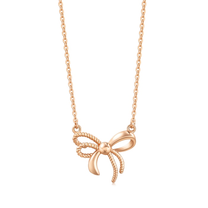 周生生18K紅色黃金頸鍊,以花紋與光面交織的蝴蝶結造型,對比鮮明,可愛卻不失優雅,教人怦然心動。