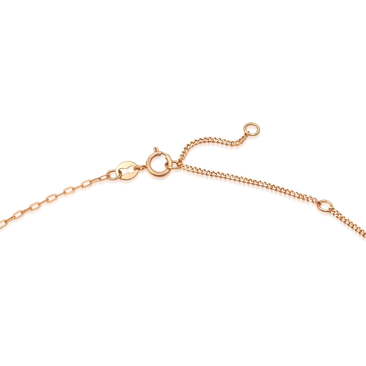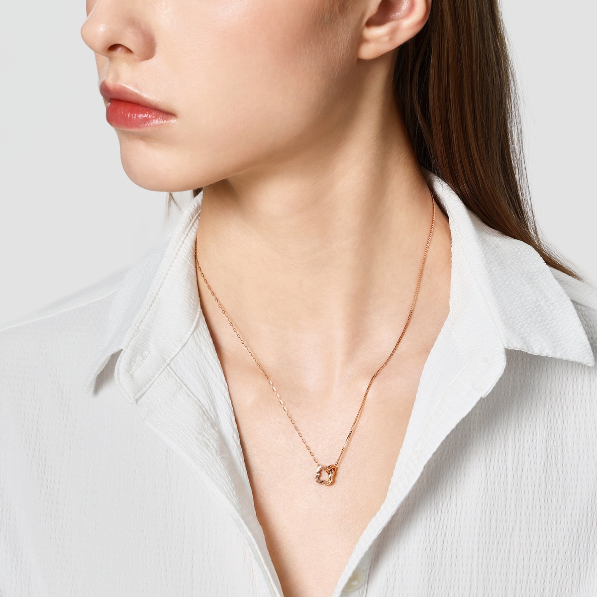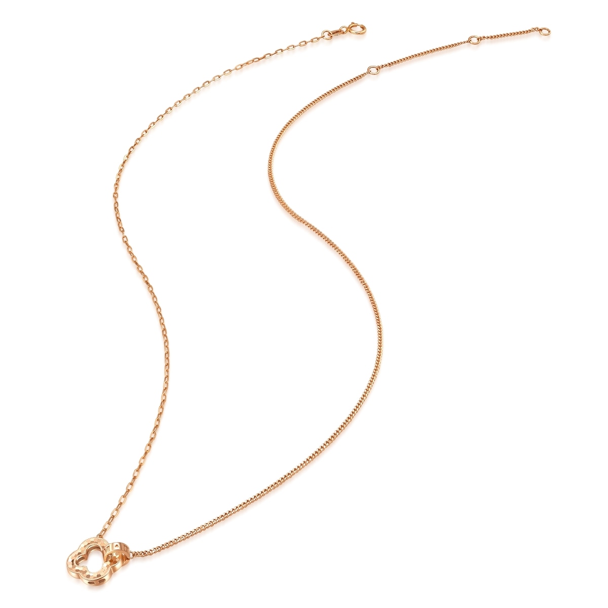 周生生18K紅色黃金頸鍊,以幸運四葉草為設計元素,表面特別融合幾何切面,舉手投足間閃耀迷人光芒,單邊採用LOVE扣環設計,結合左右不對稱鍊身,注入時尚魅力。