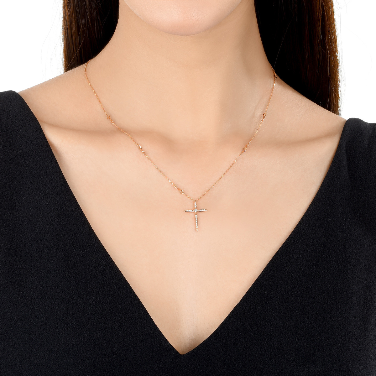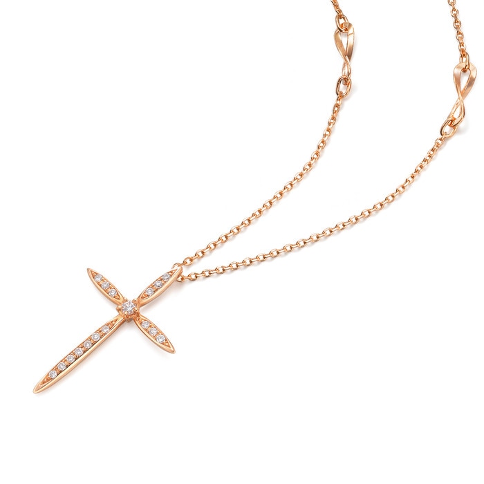 周生生高貴的玫瑰金十字架以群鑲工藝嵌入密集的小顆美鑽,華麗璀璨。