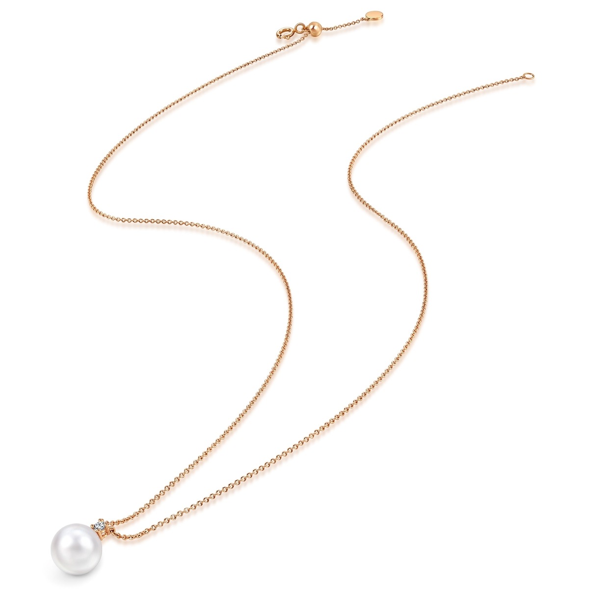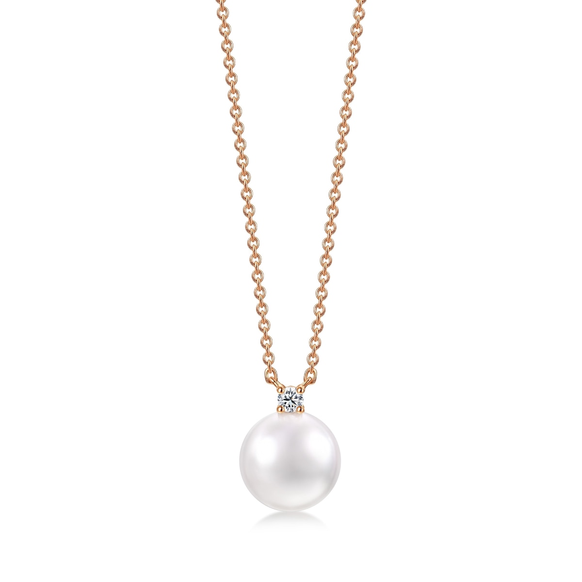 周生生18K紅色黃金Akoya珍珠鑽石頸鍊,採用經典的垂掛式設計,頂部精鑲美鑽相互呼應,映襯Akoya珍珠獨有的光澤,色彩盈潤細膩,為日常造型注入優雅風格。