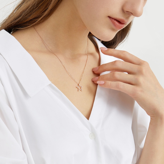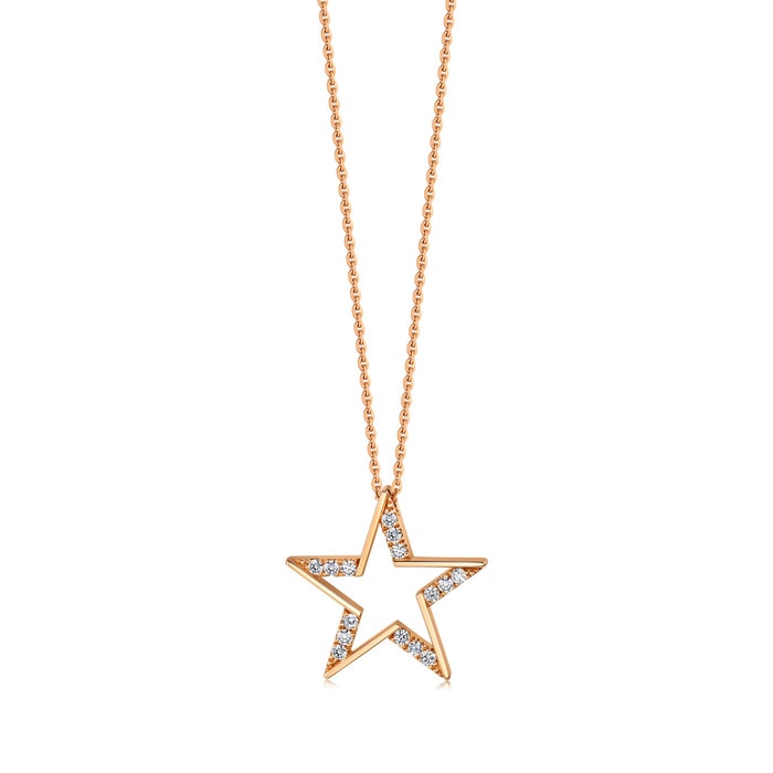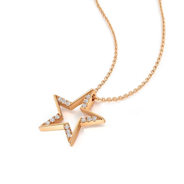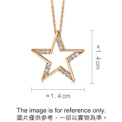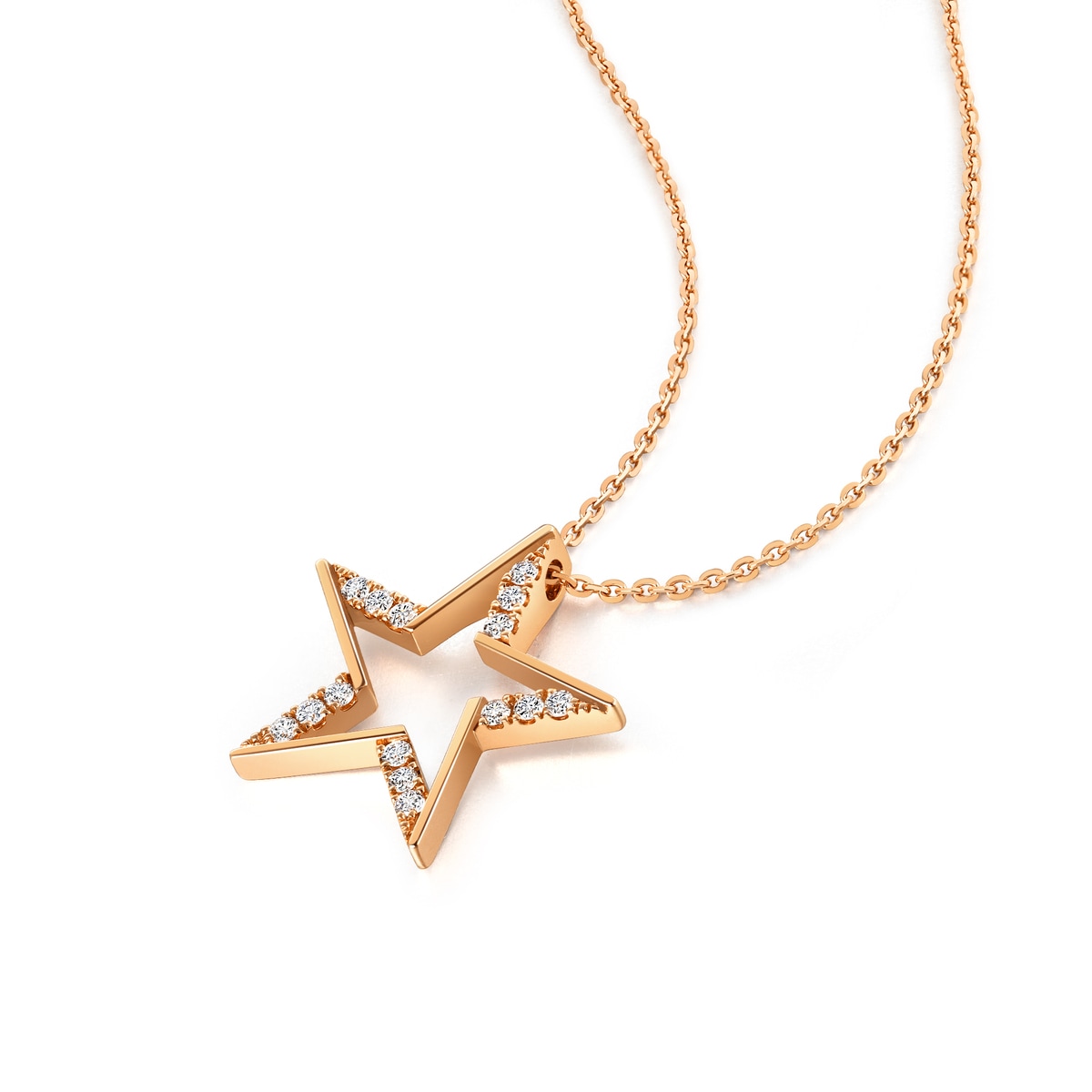 18K紅色黃金頸鍊,靈感沿自金星圍繞太陽運行的軌跡,連上就成為了黃金比例五角星。每道軌跡上都鑲有璀璨美鑽,代表了星軌交匯邂逅,生生不息、環繞的愛。