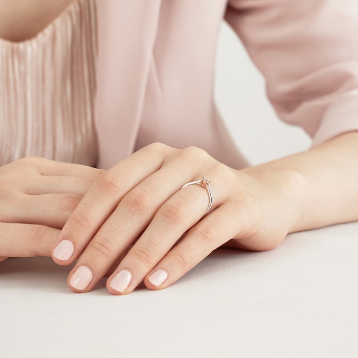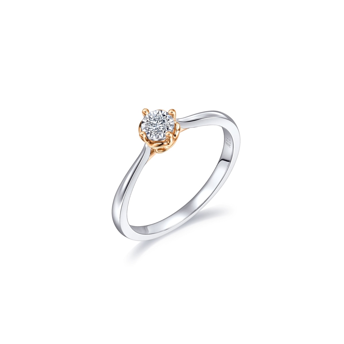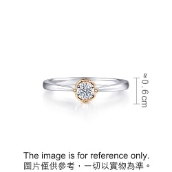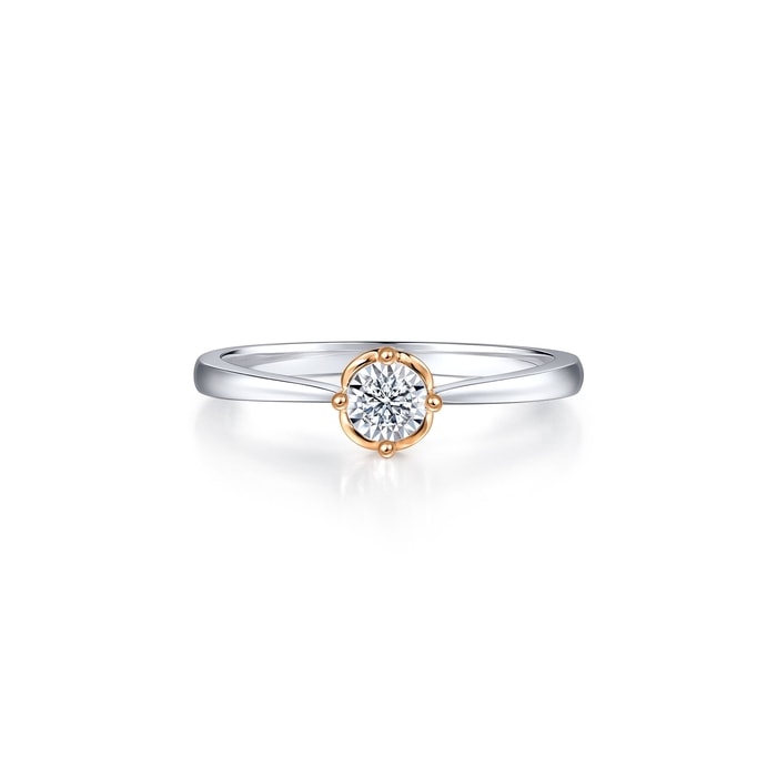 周生生18K白紅分色黃金鑽石戒指,以「同心」為設計主題,猶如月老牽繫紅線,象徵此生「永結同心」。四爪設計採用真分色工藝,盡顯細膩線條,主石結合專利批花鑲嵌技術,營造出顯鑽效果,華麗閃耀,觸動無盡愛意。