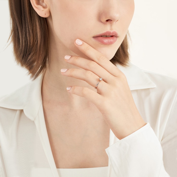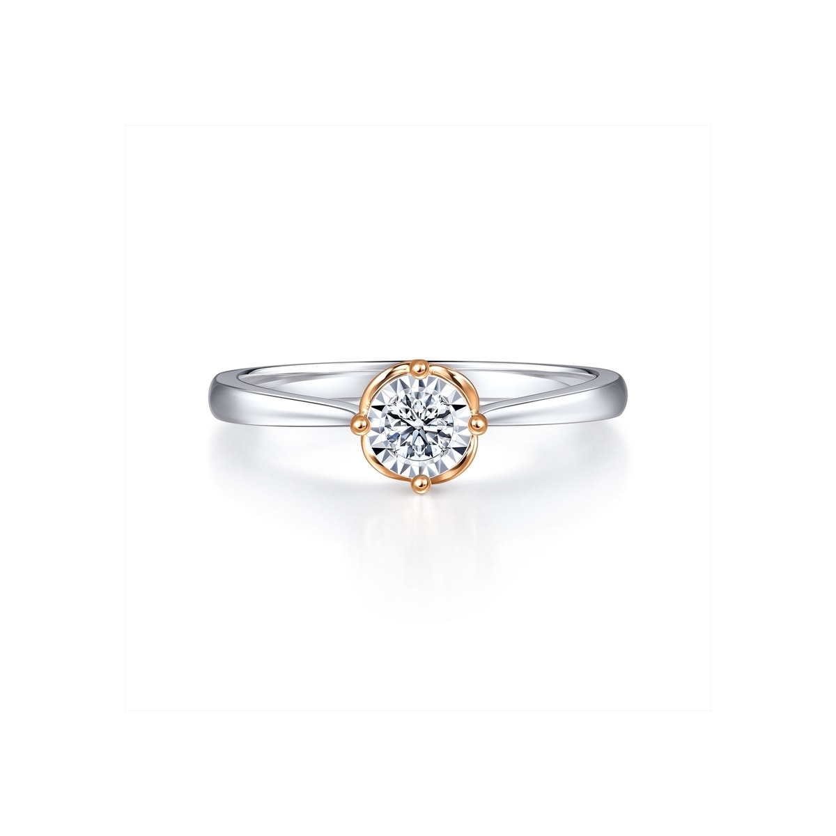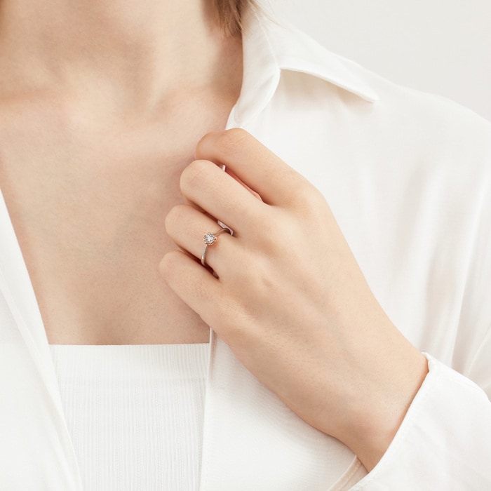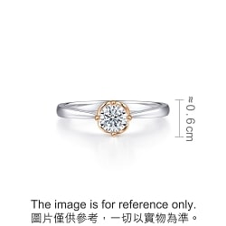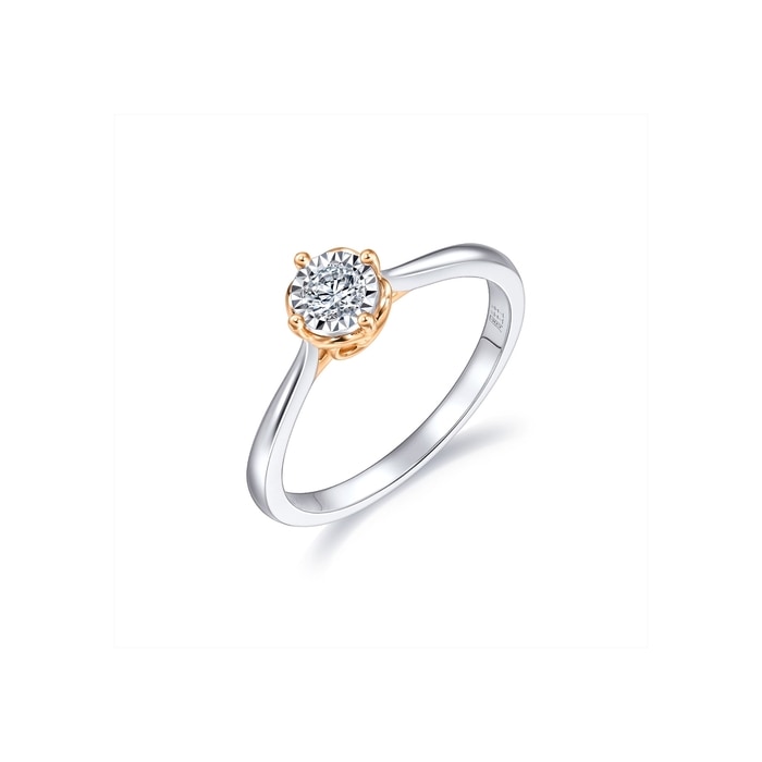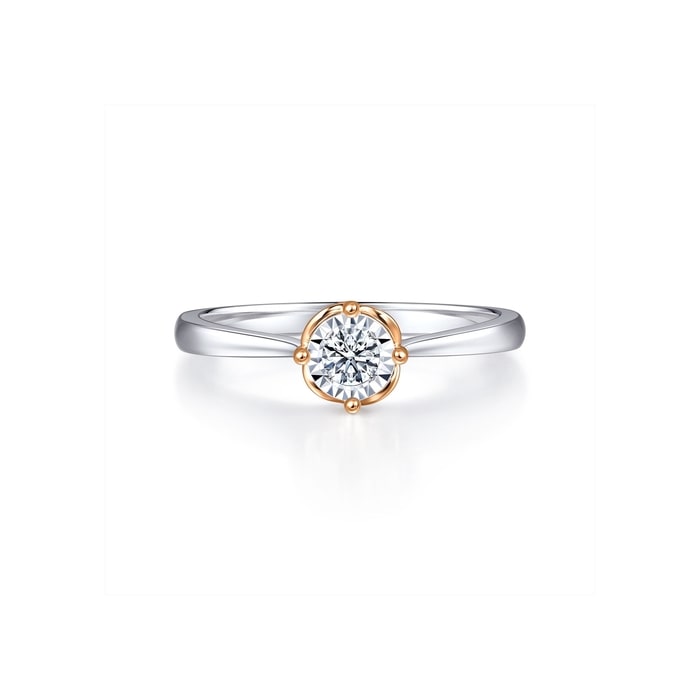 周生生18K白紅分色黃金鑽石戒指,以「同心」為設計主題,猶如月老牽繫紅線,象徵此生「永結同心」。四爪設計採用真分色工藝,盡顯細膩線條,主石結合專利批花鑲嵌技術,營造出顯鑽效果,華麗閃耀,觸動無盡愛意。