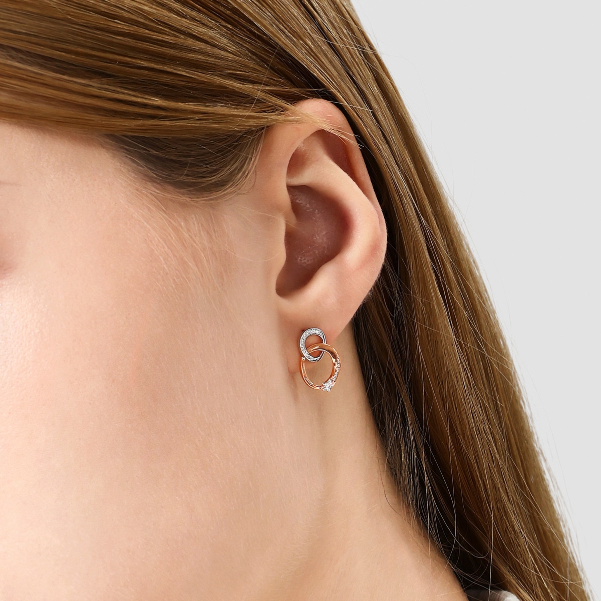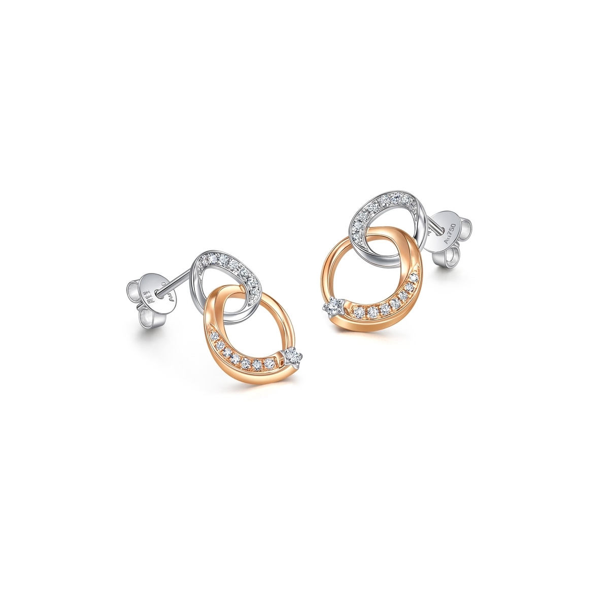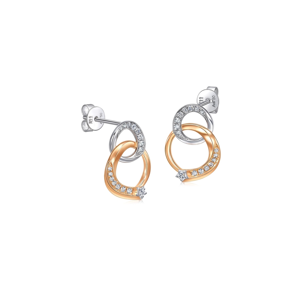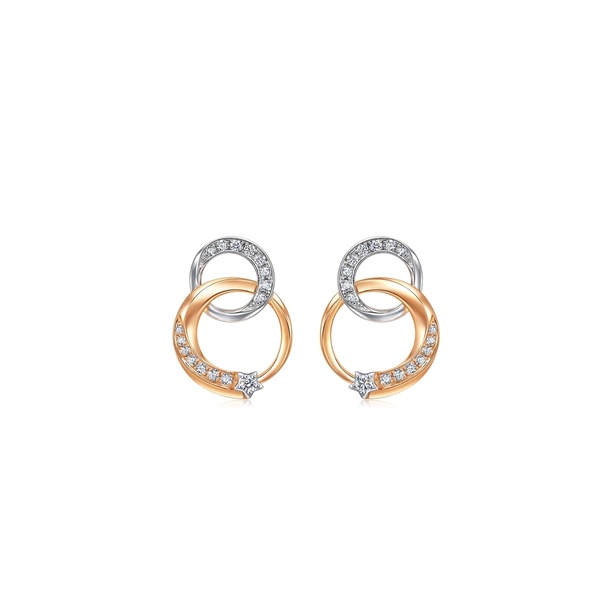 周生生18K白紅分色黃金耳環,以流星交匯為設計靈感,數穎美鑽點綴在流星軌跡如流星劃過時的璀璨,彼此交織,閃耀迷人。
