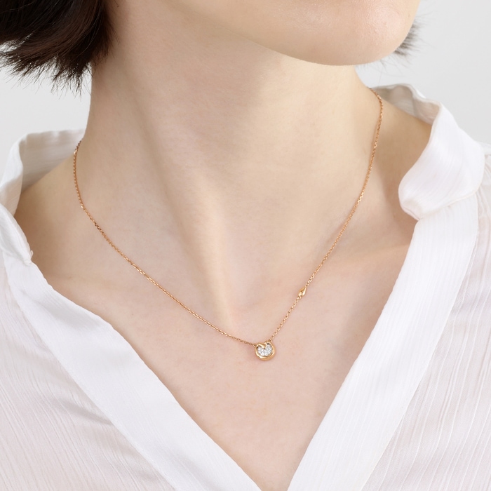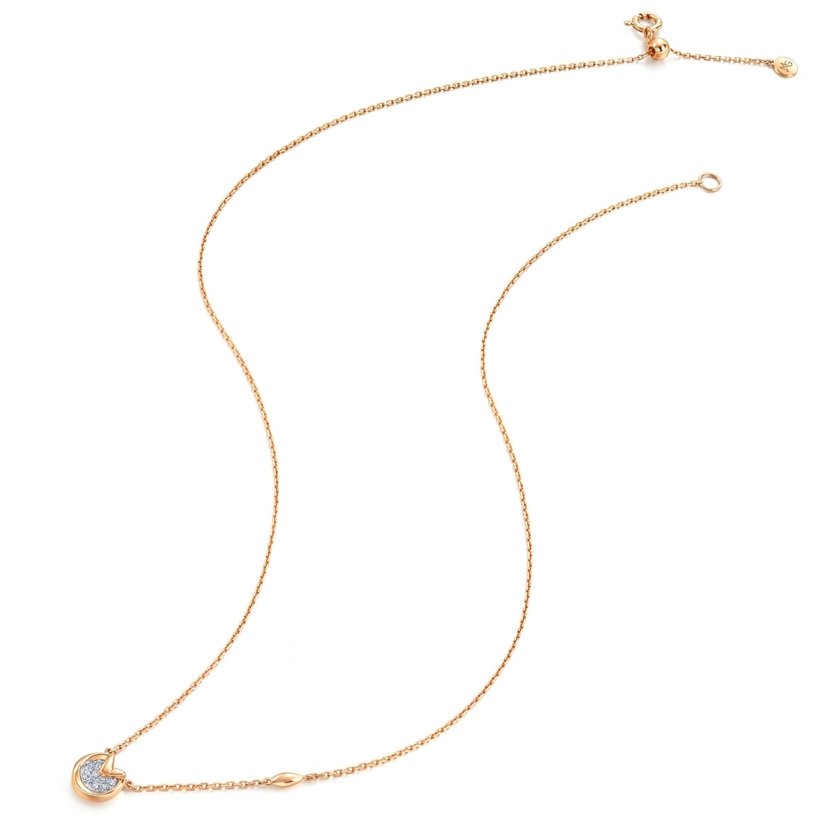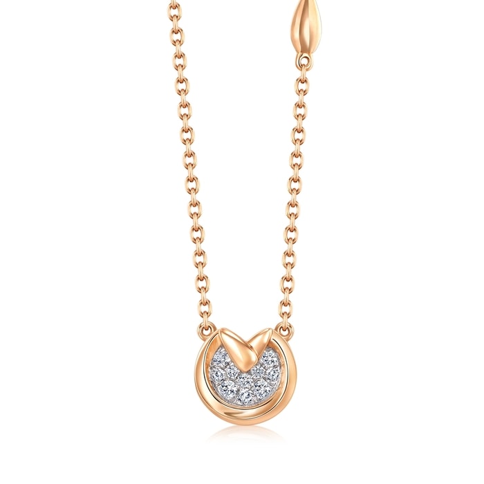 周生生18K白紅分色黃金頸鍊,以兩片鑲有鑽石的嫩芽交疊形成心型圖案,並鑲滿閃爍美鑽;嫩芽破土而出,代表新的開始,亦是向上生長的力量,讓您遇見全新的自己。頸鍊設計閃爍動人且小巧甜美,點亮您的造型。