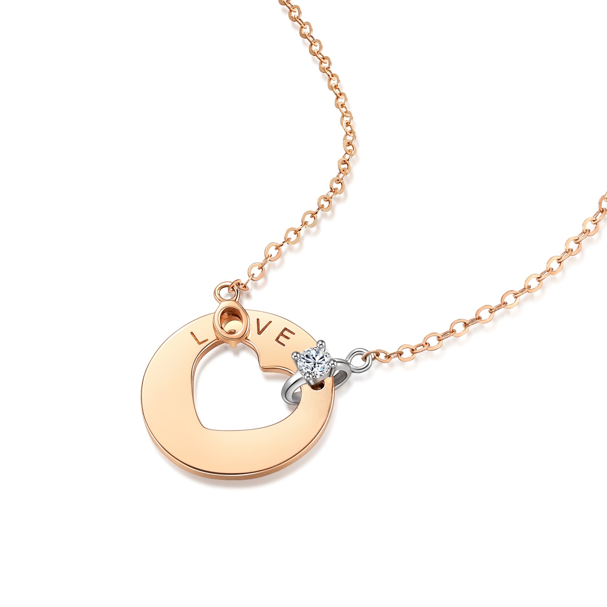 周生生18K紅色黃金心形頸鍊,中間刻有「LOVE」字眼和鏤空的心形造型,配以側上方的閃爍鑽石,浪漫甜美。