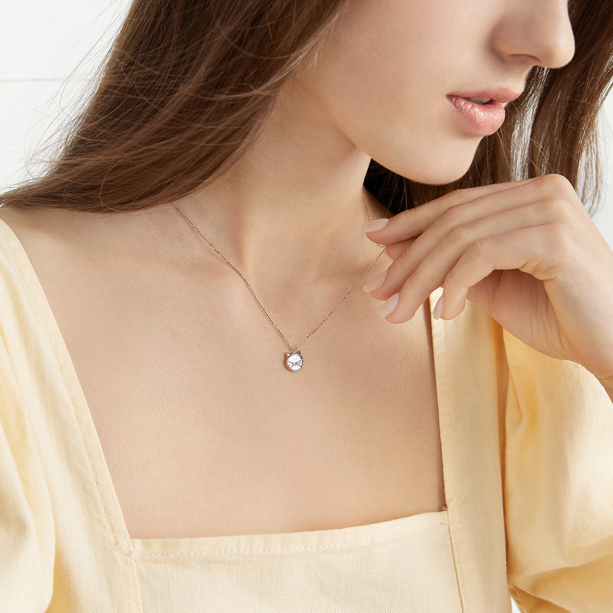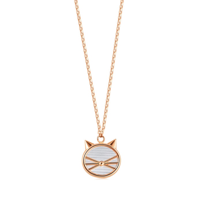 周生生18K 白紅分色黃金貓咪頸鍊,簡約線條勾勒出貓咪模樣,臉龐用上了18K 白色黃金作底色,天真純潔。