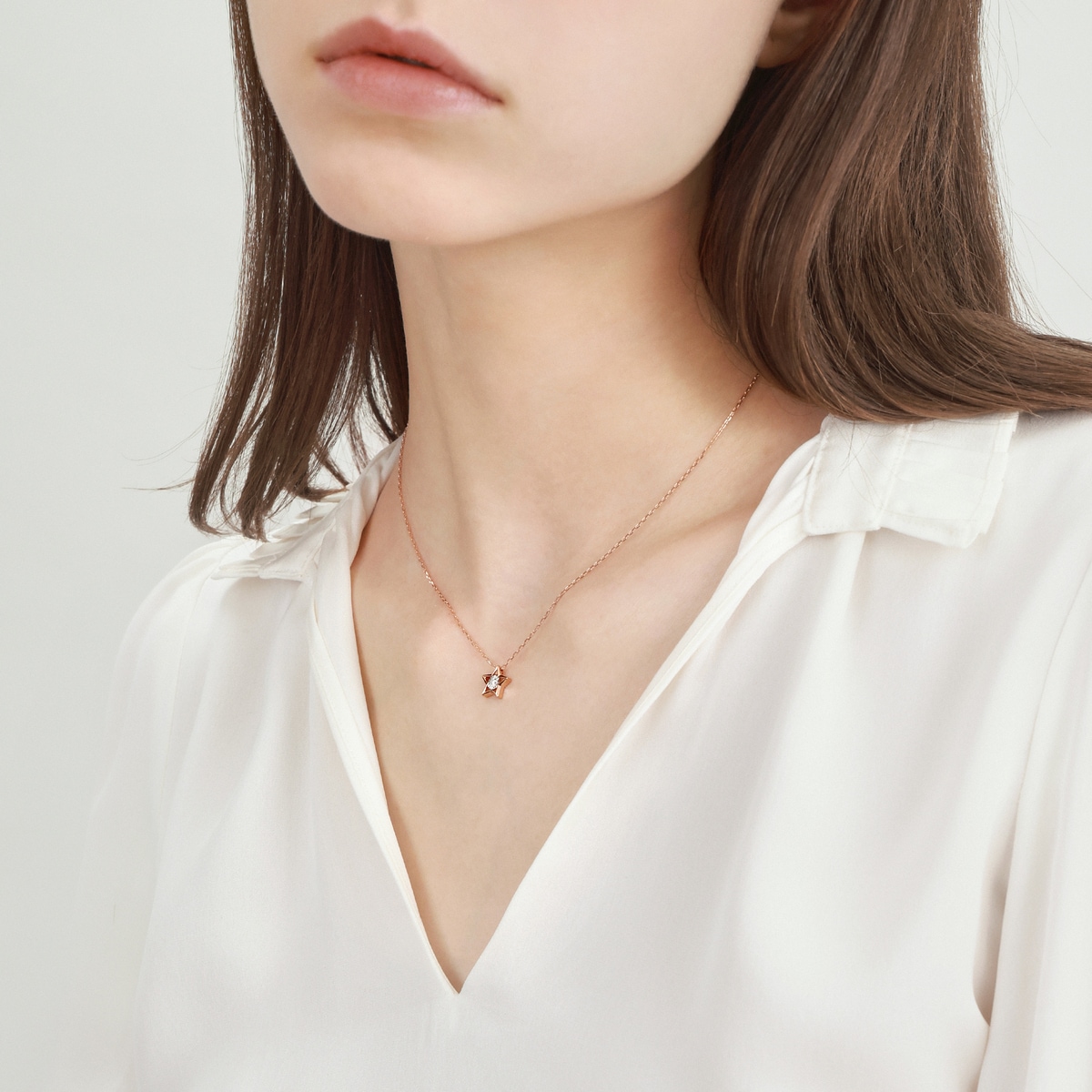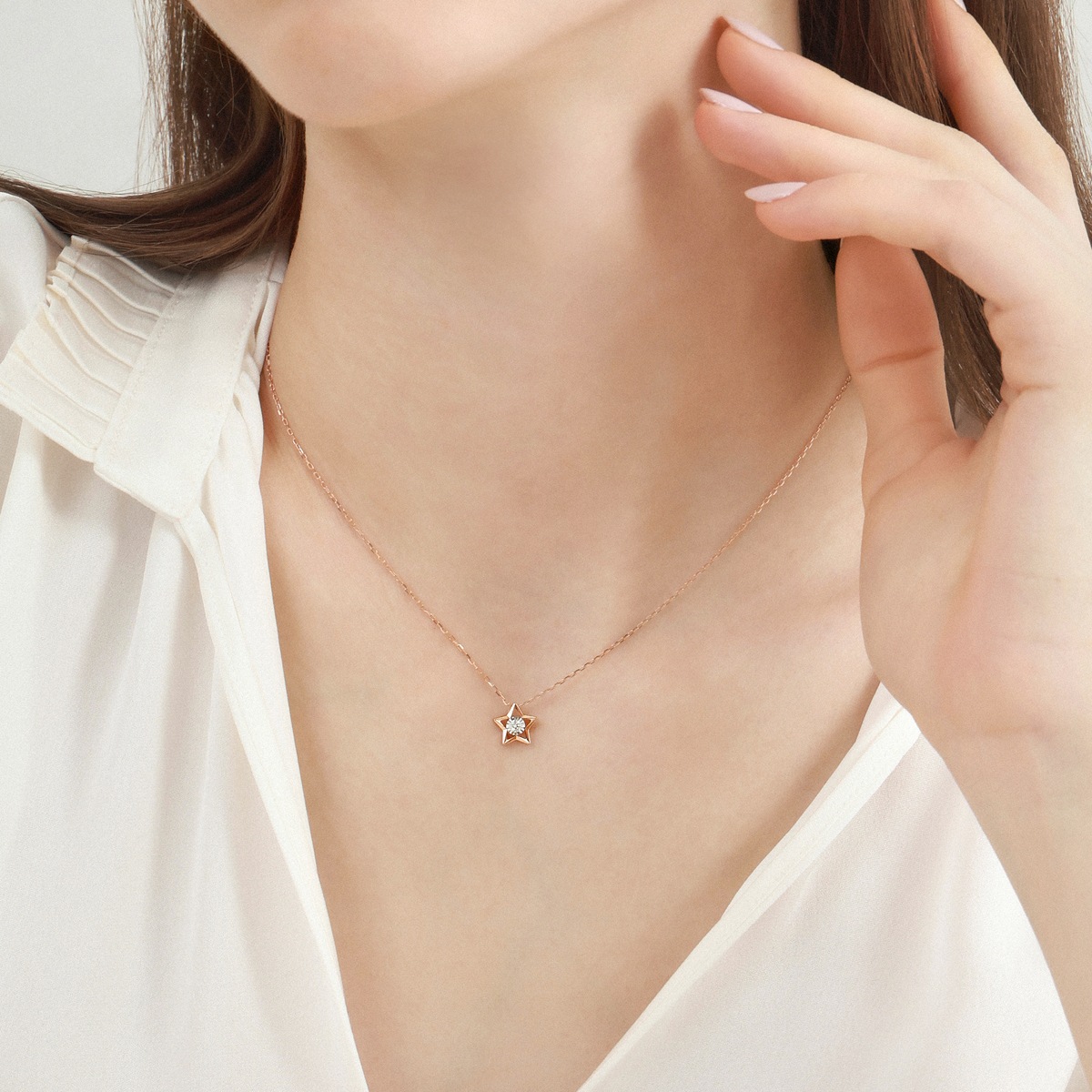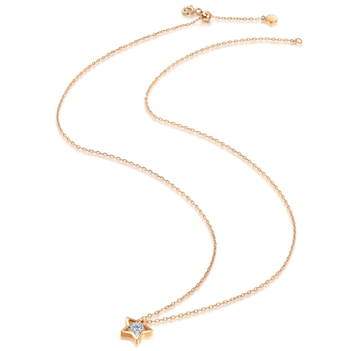 周生生18K紅色黃金鑽石頸鍊,採用專利設計,以獨特批花配合鑲嵌技術,讓鑽石與細緻車花片完美融合,渾然天成,營造出顯鑽的強烈視覺效果。星形外框清新簡約,映襯出璀璨星光,盡顯時尚風格。