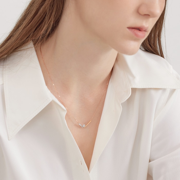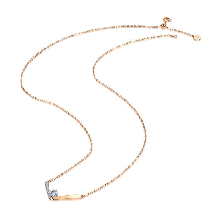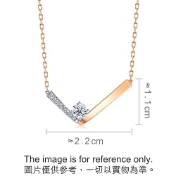 周生生18K白紅分色黃金鑽石頸鍊屬於「永恆之頌」系列,以幾何線條詮釋絲帶的優美形態,多顆碎鑽在旁襯托,突顯圓鑽耀眼的光芒,設計簡約大方,輕易配搭各種日常時尚風格。
