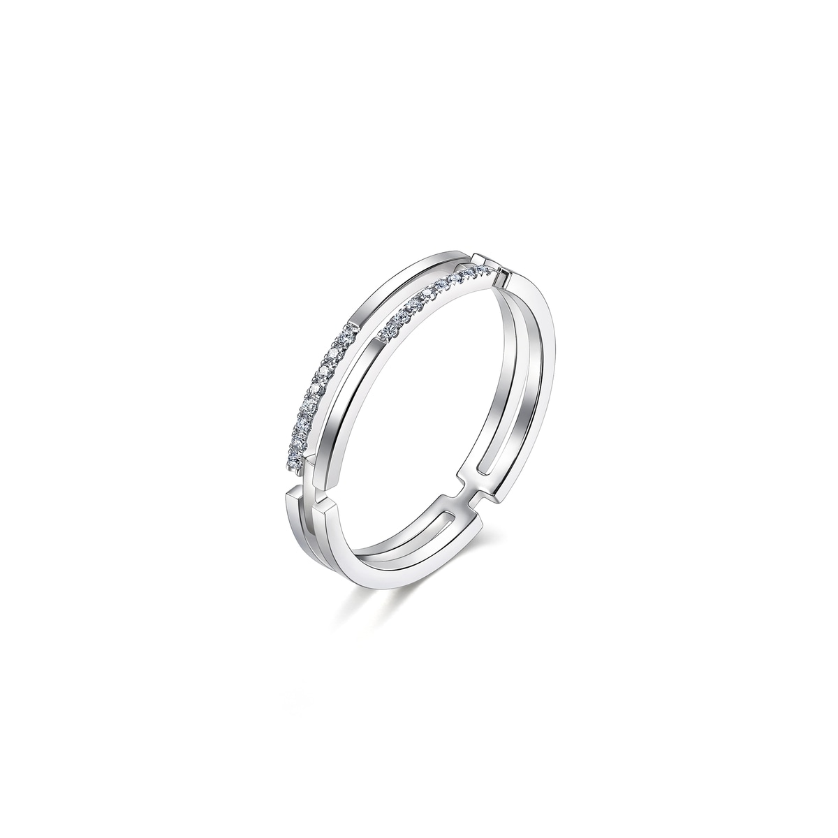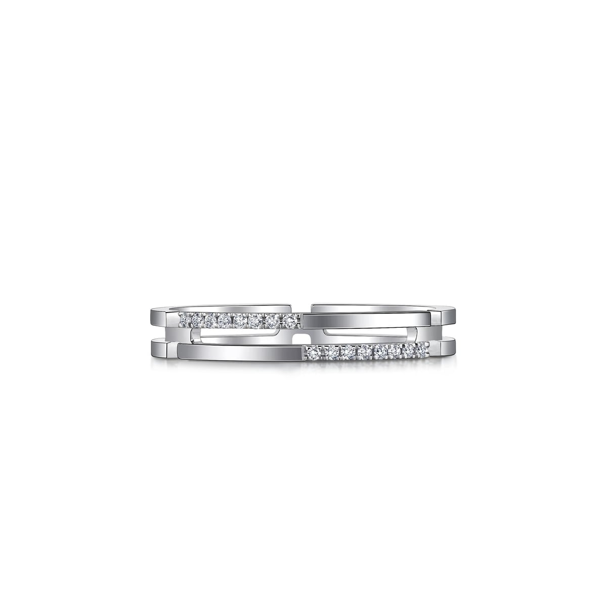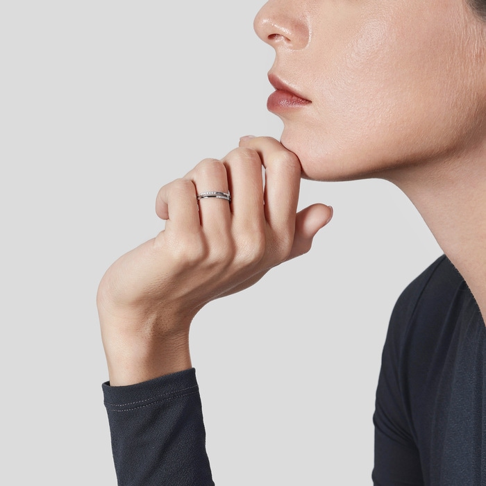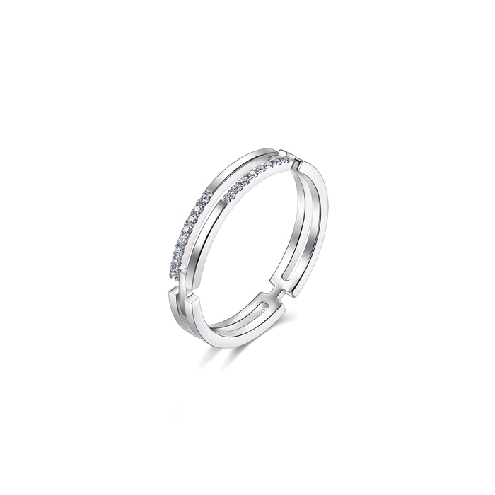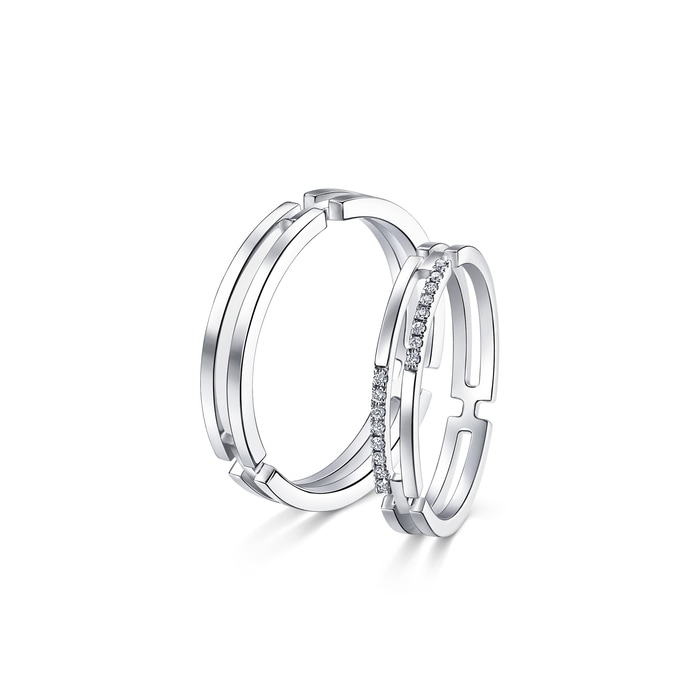 周生生18K白色黃金鑽石戒指,採用簡約流暢的雙戒圈設計,融合排鑲美鑽華麗加冕,閃耀絢爛光芒,象徵此生「如一」的動人承諾,寓意細水長流、永恆不變的愛情,亦適合日常配襯,時尚百搭。