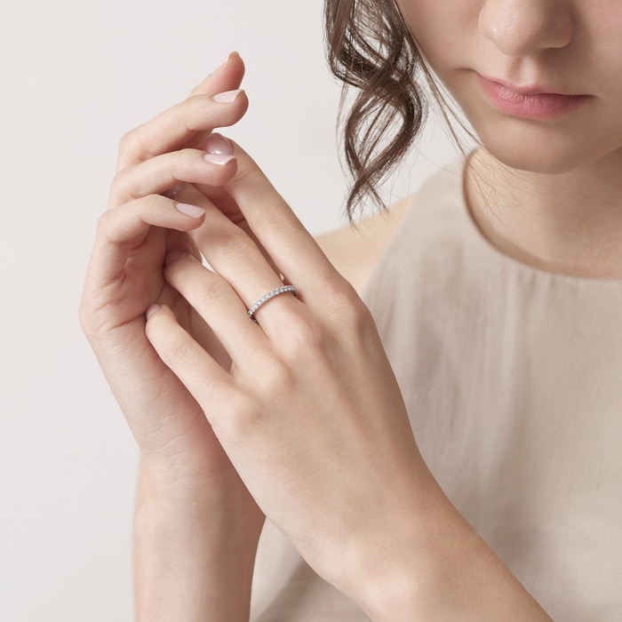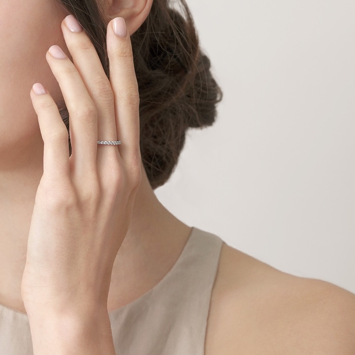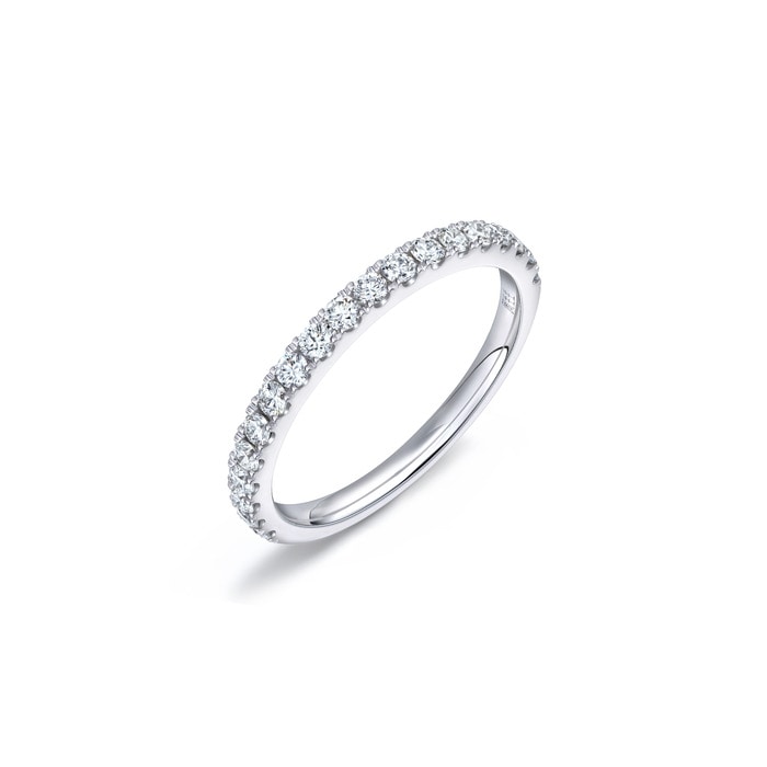 周生生戒指以「星宇」為設計主題,戒環綴上猶如星之軌跡的鑲石,風格清新,見證兩口子的閃耀愛情路。