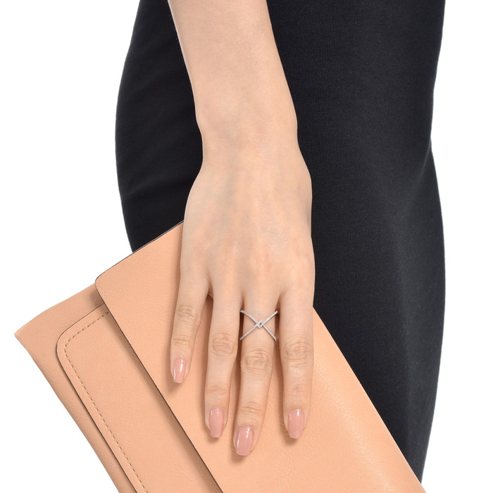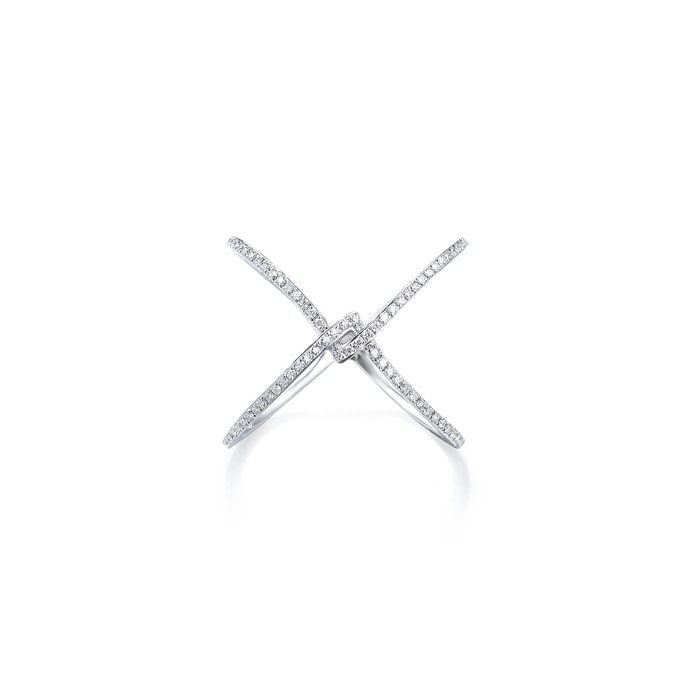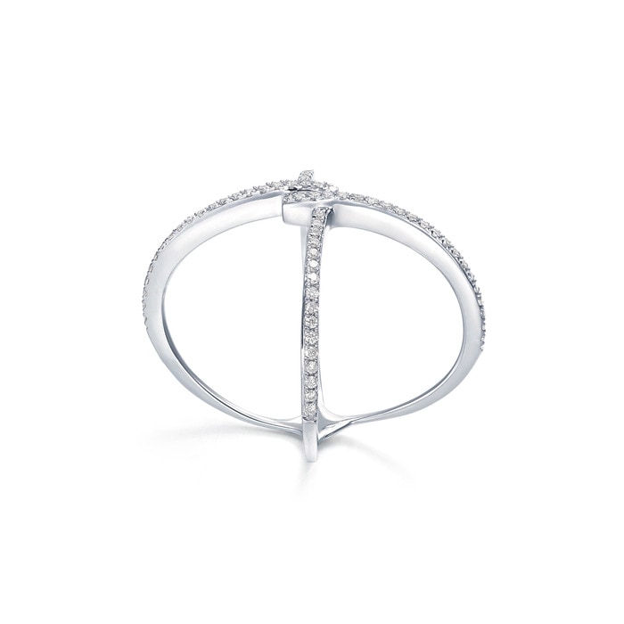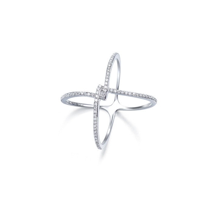 縱橫交錯的戒指,呈現出幾何圖案,鏤空式設計,綴滿鑽石,簡約易襯,極具層次美。