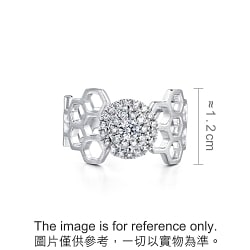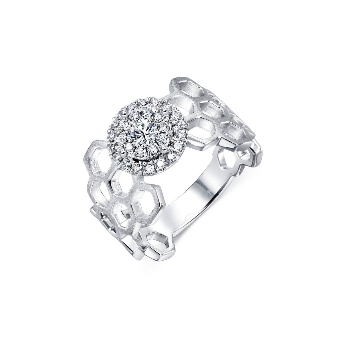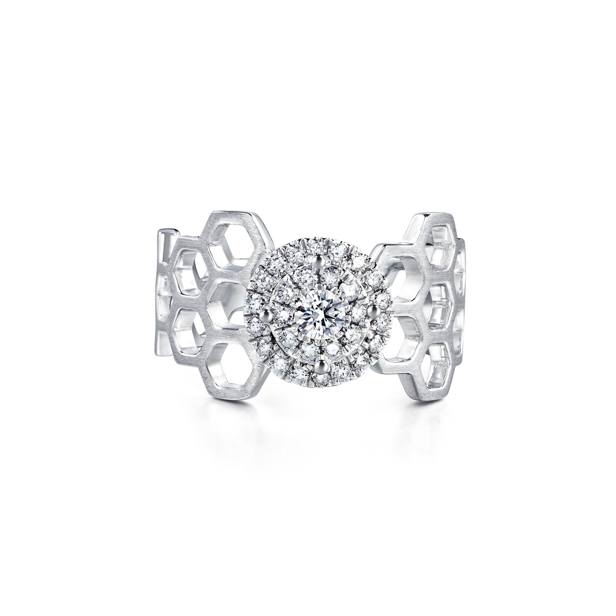 以大自然界的六角蜂巢幾何圖案為設計元素,甜蜜浪漫。極富結構美的指環,採用磨砂面與亮面設計的蜂巢圖紋,呈現出率性時尚感。