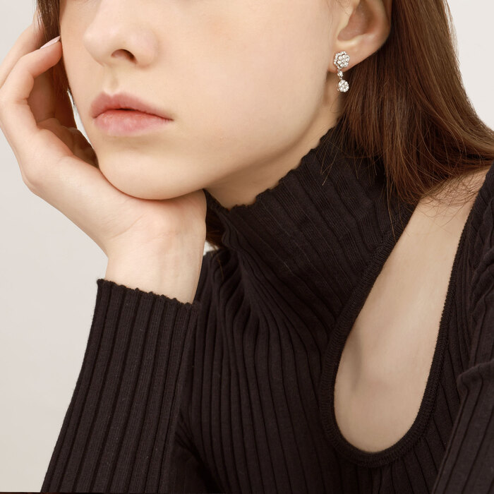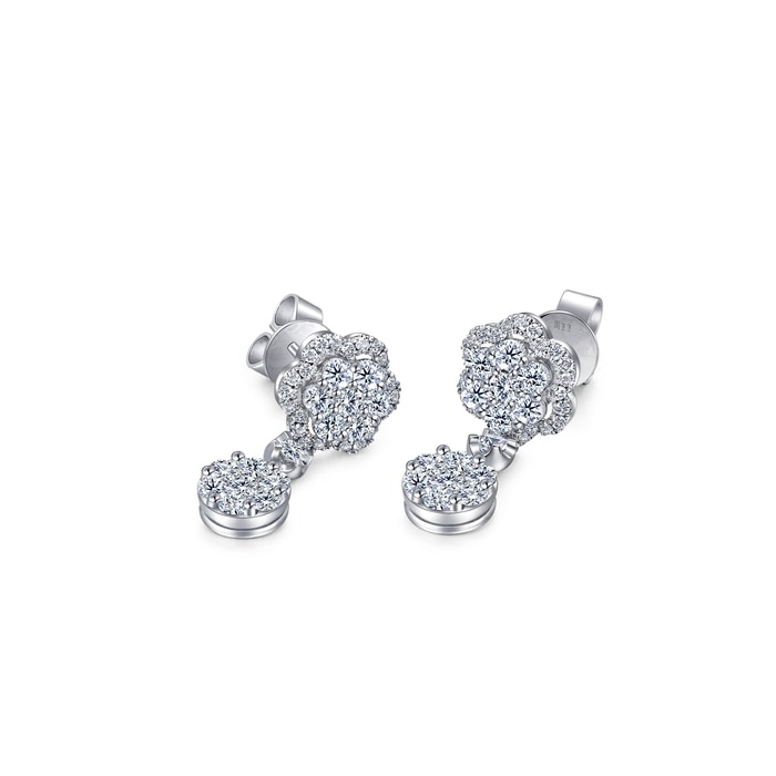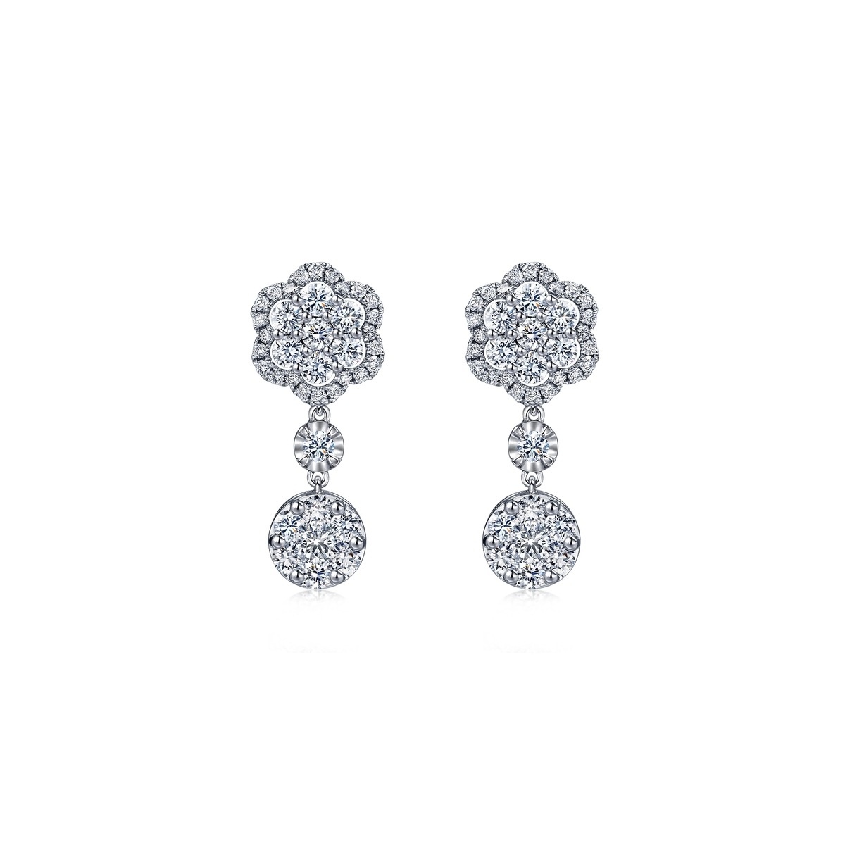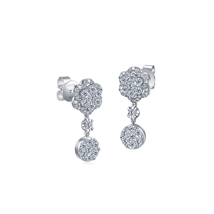 周生生18K白色黃金鑽石耳環屬於「花悅之頌」系列,主石美鑽設計猶如花瓣圍繞花蕊,配以碎鑽縈繞襯托,華麗閃耀,捕捉花卉綻放的自然美態,結合垂墜設計,花姿搖曳,優雅高貴。