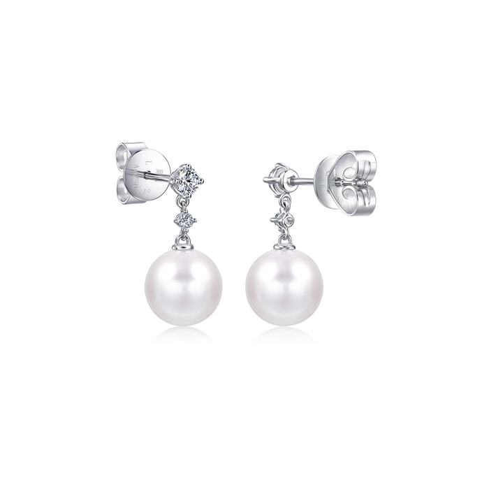 周生生18K白色黃金Akoya珍珠鑽石耳環,採用經典的垂掛式設計,頂部精鑲大小美鑽相間,牽引出Akoya珍珠獨有的光澤,色彩盈潤細膩,展露動人氣質。