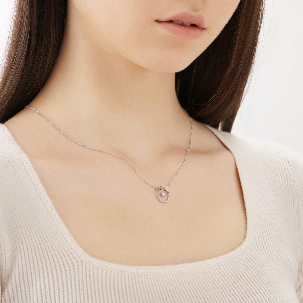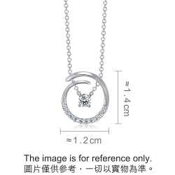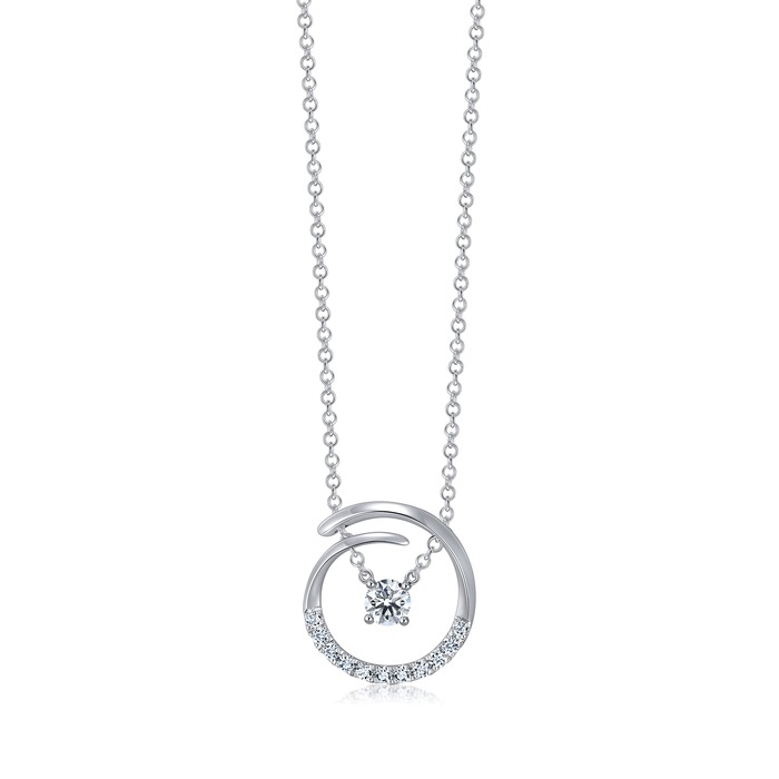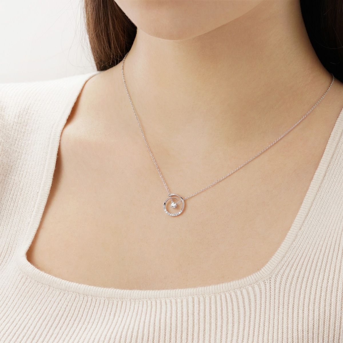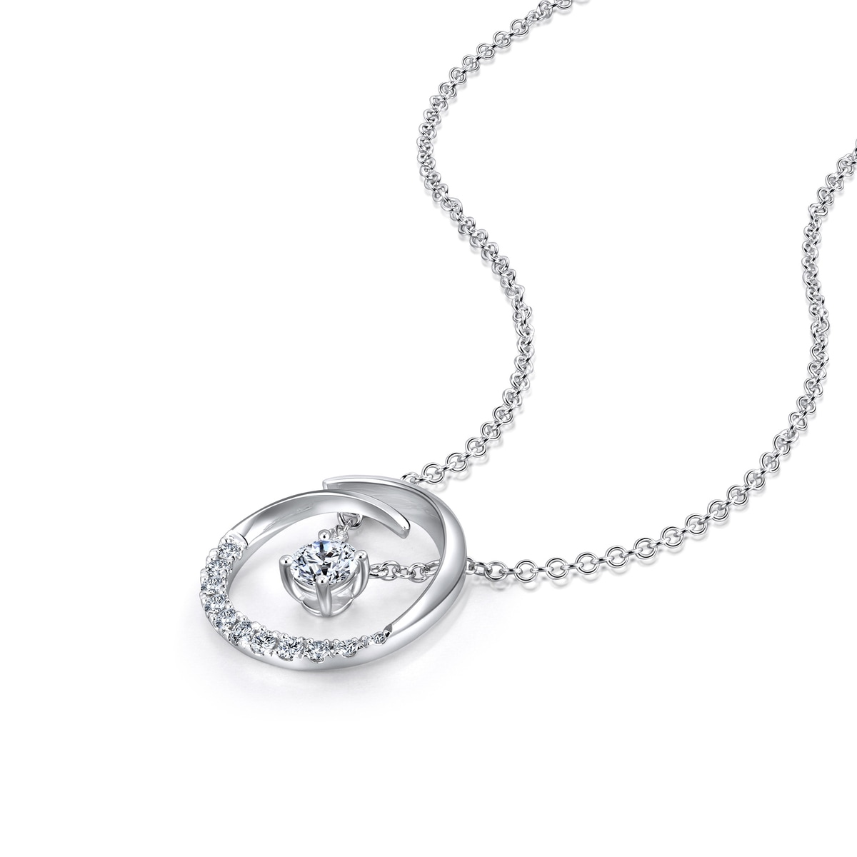 18K 白色黃金開口圓形頸鍊,圓形外框圍着中間的美鑽,下半部亦鑲滿碎鑽,閃亮動人。造型簡約大方,適合配搭各種日常打扮。