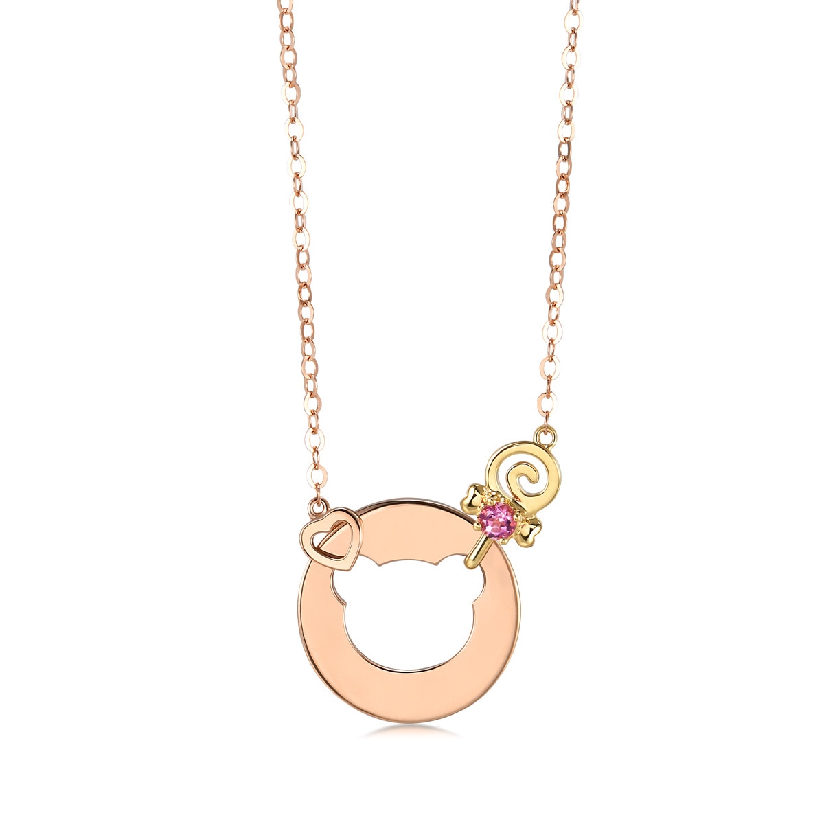 周生生18K紅色黃金小熊頸鍊,中間鏤空的小熊造型,配以紅寶石波板糖和鏤空心形,甜美可愛。