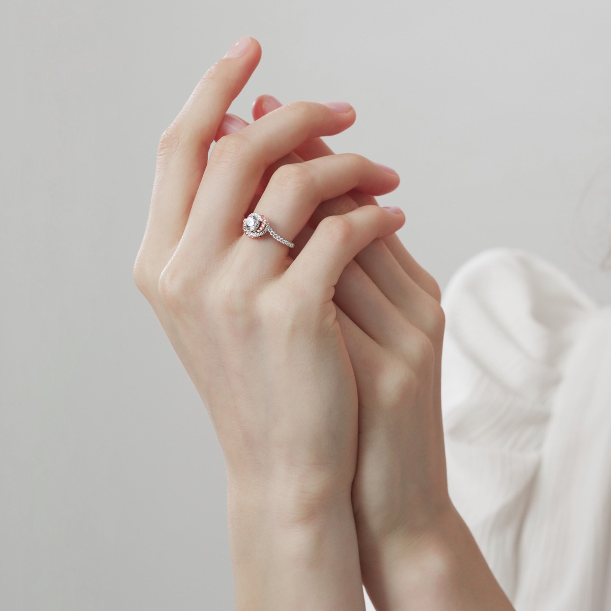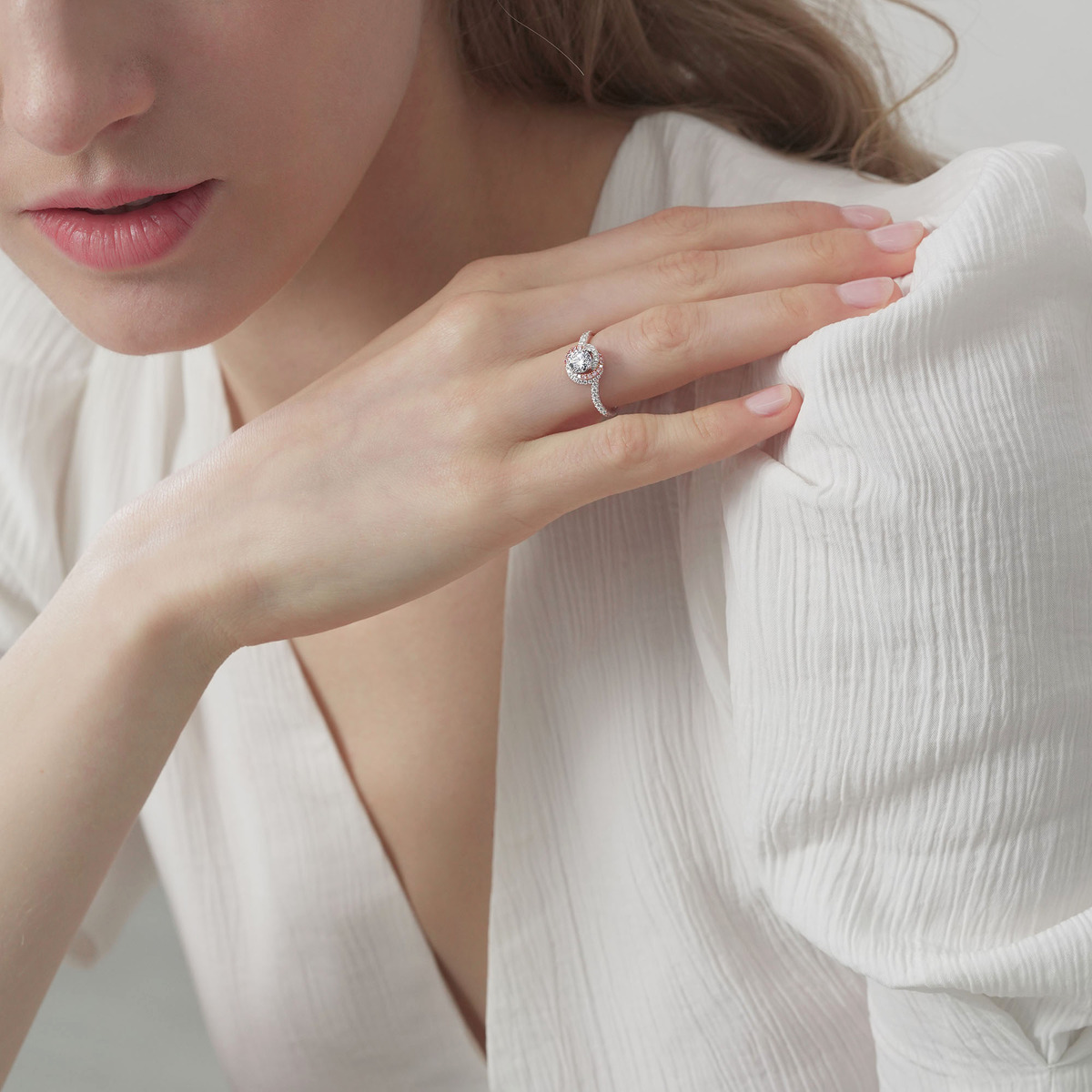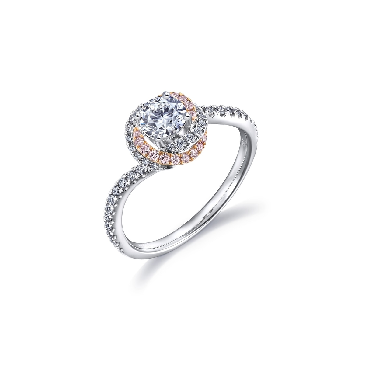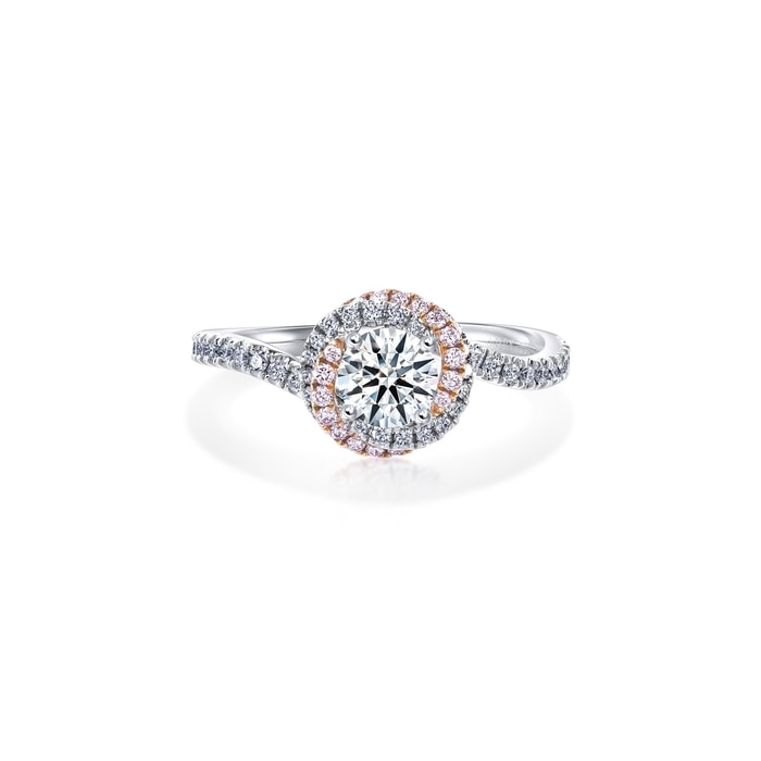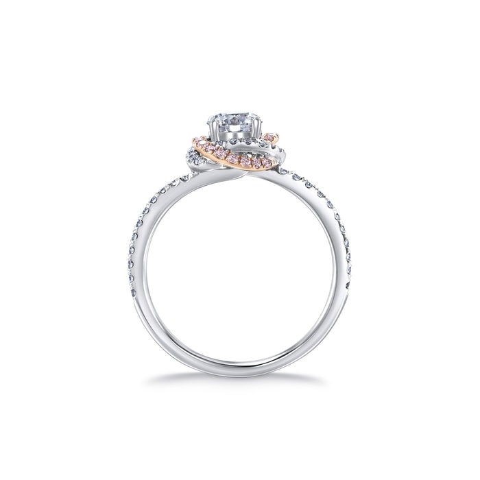 周生生簡約的四爪鑲嵌,讓 Infini Love Diamond 主石更顯華麗,戒托底部以圓鑽及粉紅鑽石縈繞交織,璀璨不絕。