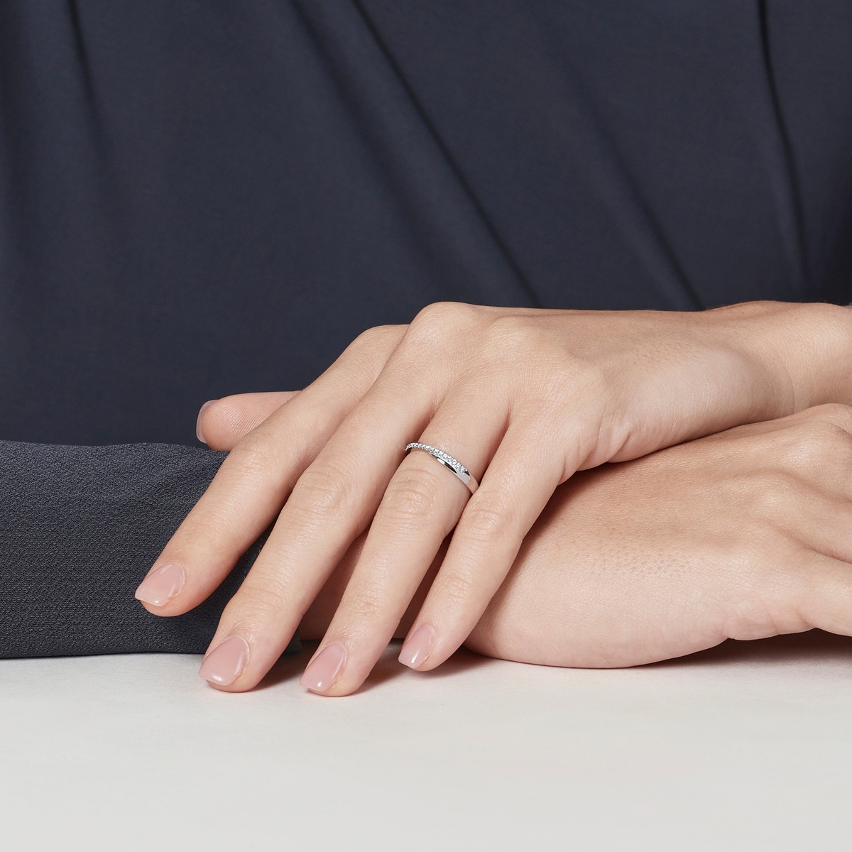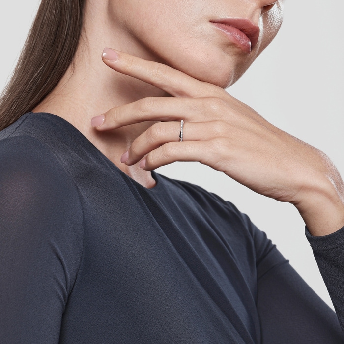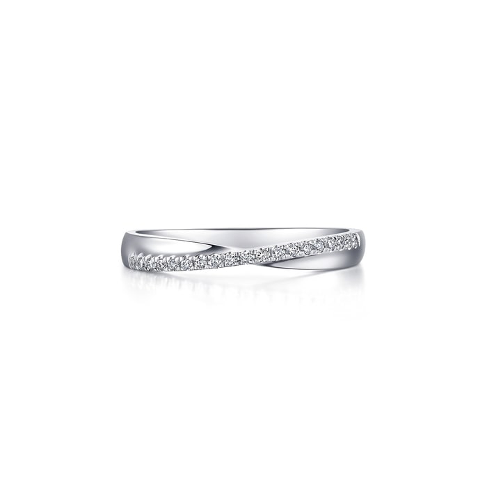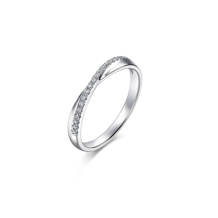 周生生950鉑金鑽石戒指,採用流暢有致的線條設計,結合排鑲美鑽映襯,閃爍動人,猶如「星宇」中的浪漫邂逅,燦若星辰,亦適合日常配襯,時尚百搭。