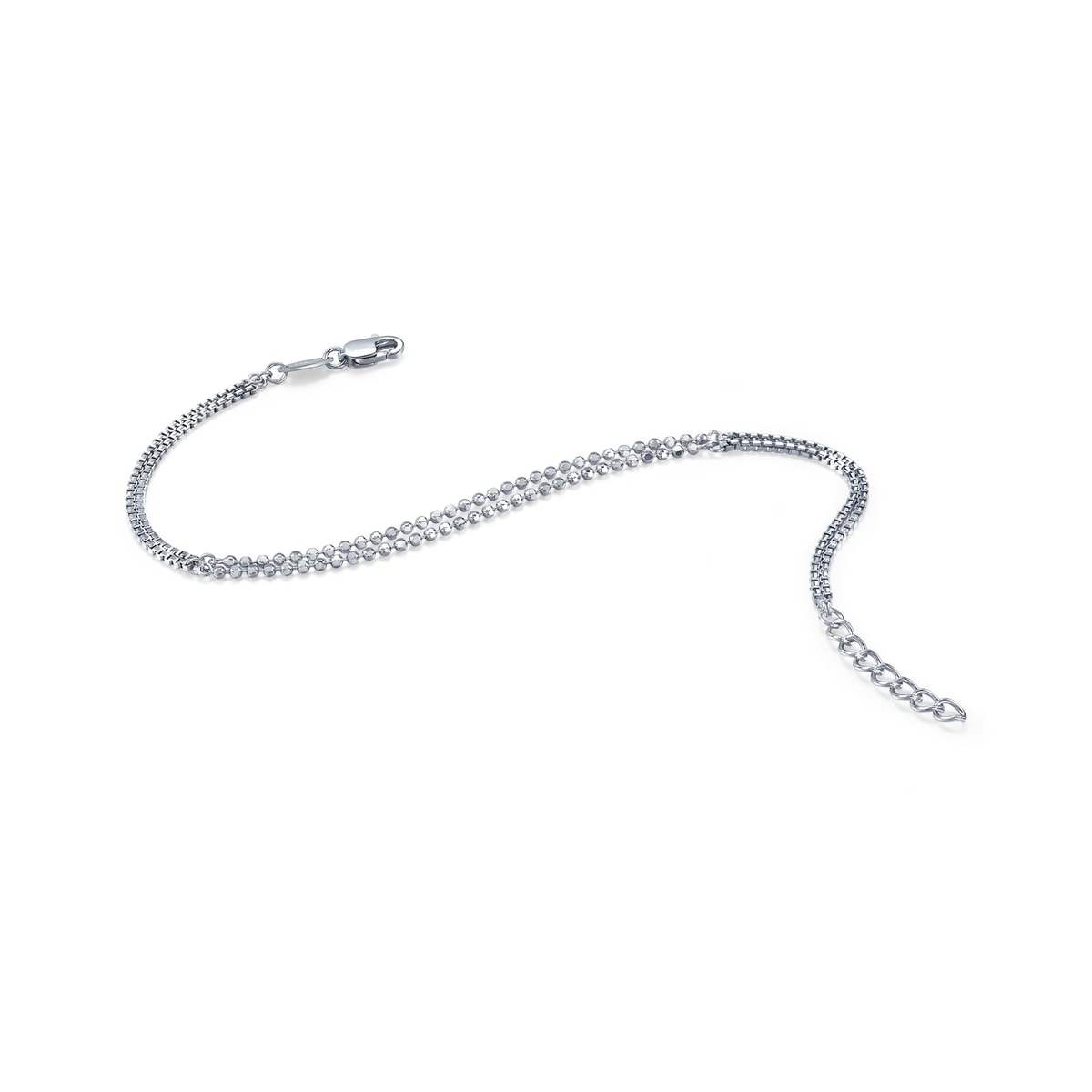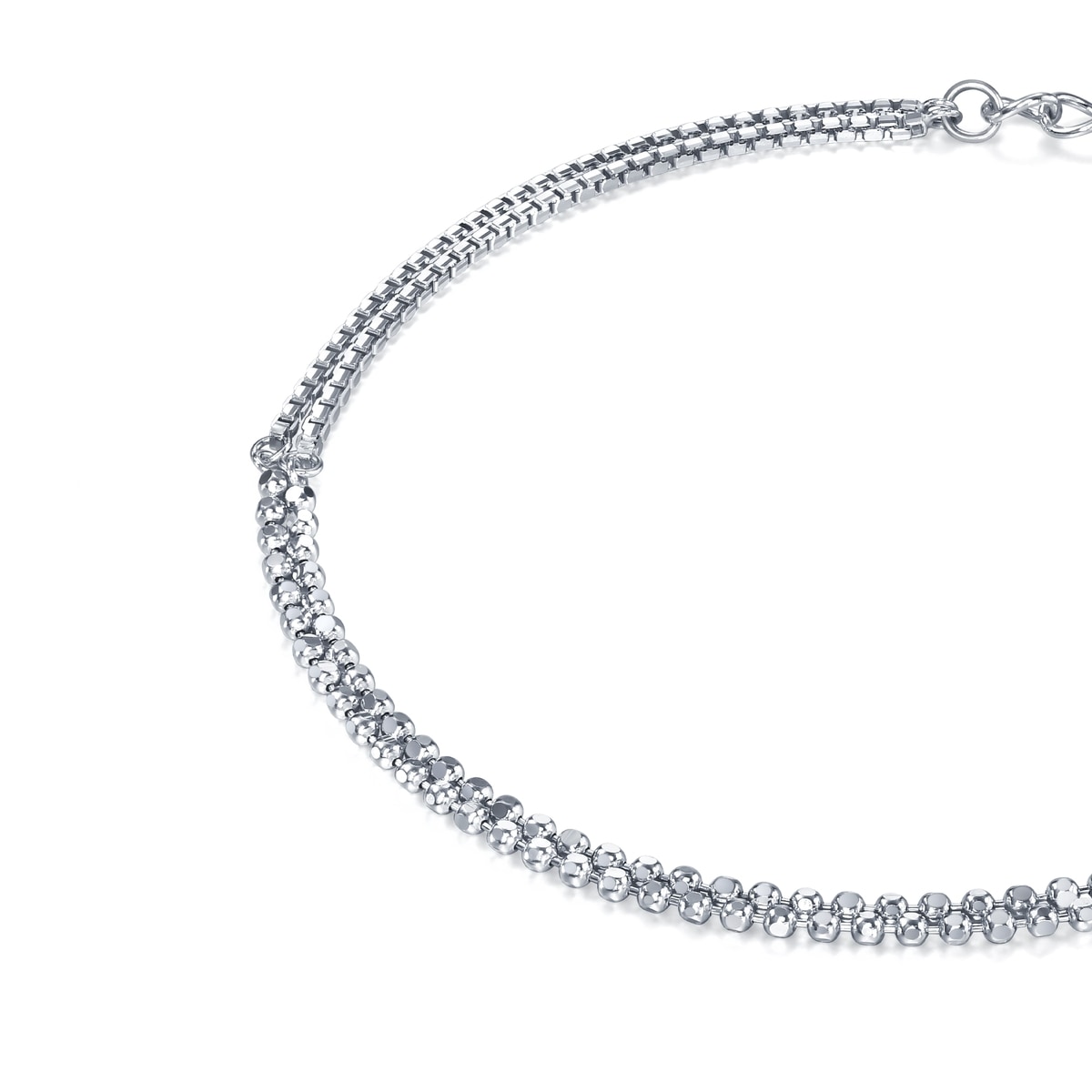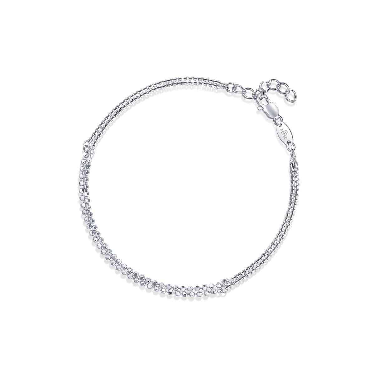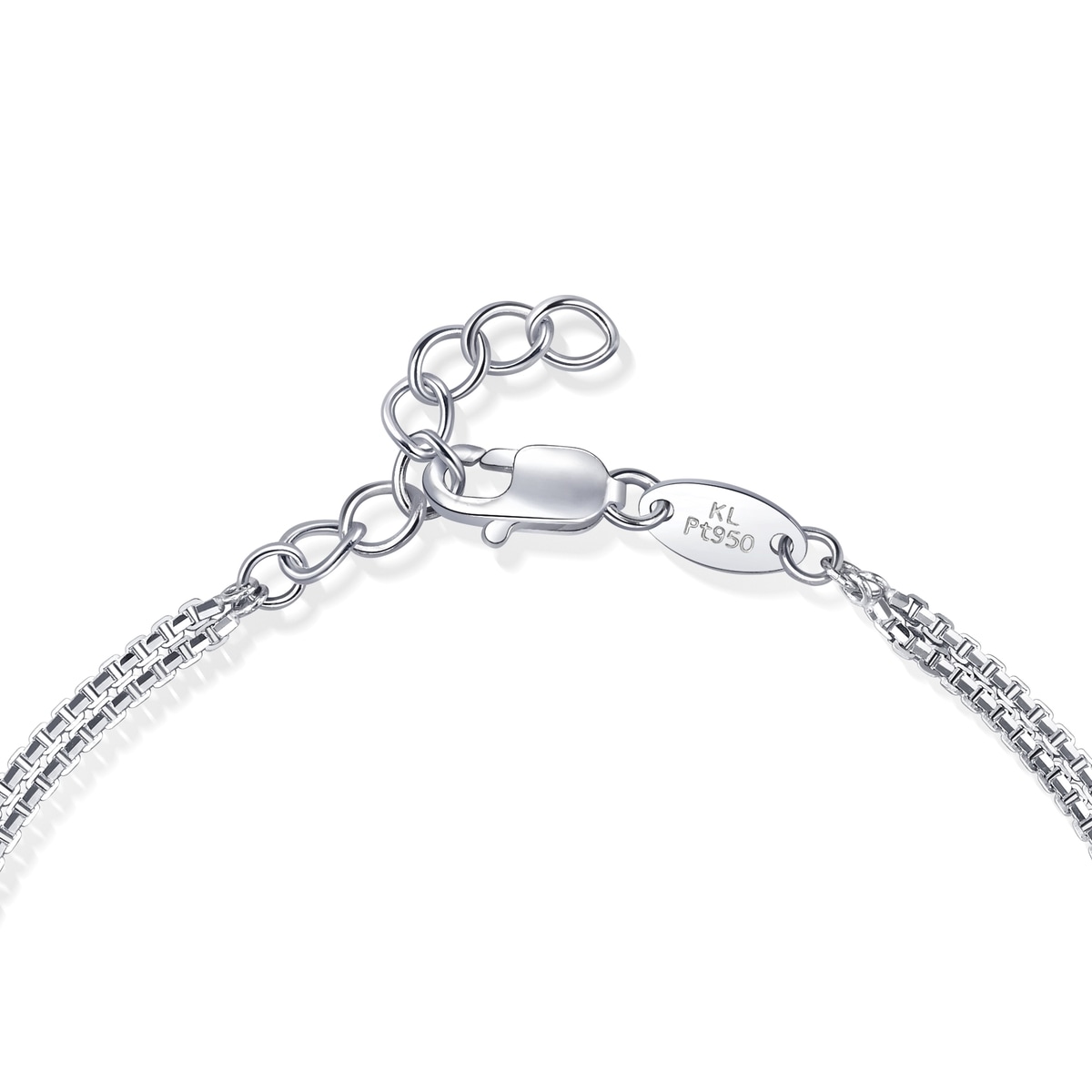 周生生以950鉑金打造的手錬,左右兩邊是雙層盒仔鍊設計,中間間著雙層批花小圓珠串,閃亮顯心思,不同設計突出層次感。